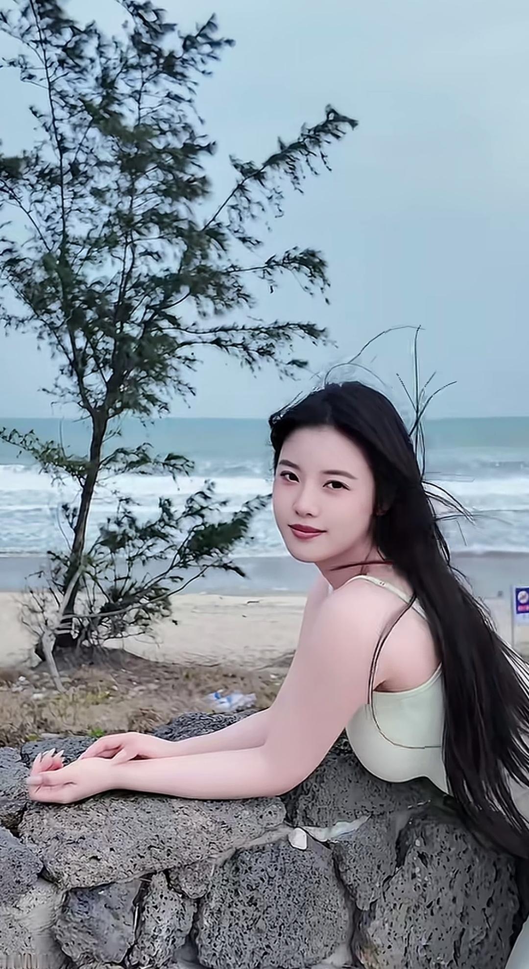 海边美女靠着石头,风景真美。