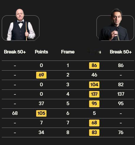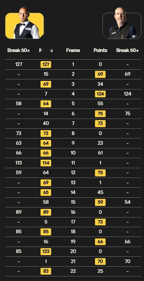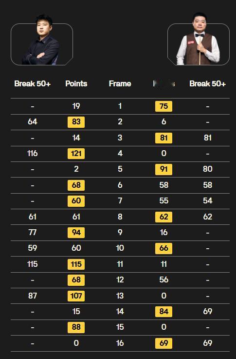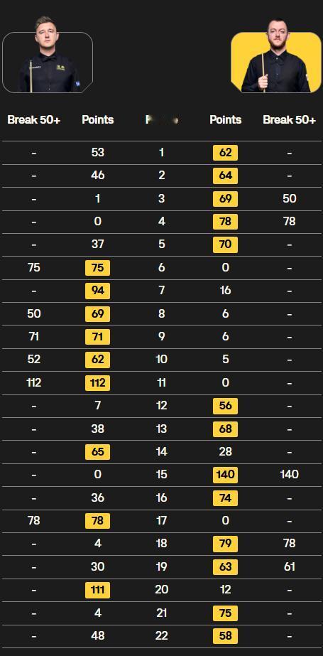 斯诺克世锦赛一夜两人晋级,八强决出3席(墨菲、艾伦和霍金斯)。 最新战报:丁俊晖7-9落后赵心童,火箭6-2领先! 北京时间4月26日,斯诺克世锦赛1/8决赛。 ①马克·艾伦13-9威尔逊。 比赛前程是大开大合,威尔逊0-5开局是六连鞭还以颜色,此后呈现有来有回的趋势,囧哥整体失误偏多,后程显得过于激进,未能把握好机会。艾伦发挥更为稳定,战术思路相当明确,最终13比9成功晋级八强,其中一杆140,四杆50+。 ②霍金斯13-9马克·威廉姆斯。 双方第一阶段4-4言和,接下来的阶段霍金斯发挥更胜一筹,准度和稳定性都占上风,慢慢扩大优势。威廉姆斯苦苦坚持,却没能有反超的希望,只能遗憾止步。 ③赵心童-丁俊晖。 首阶段战成平手,第二阶段依然延续胶着局面,彼此状态都可圈可点,但相比起来丁俊晖打得更为艰难,走位确实感觉一般,围绕高分球的进攻不太理想,好在其余方面表现出色,并未被甩开过大差距。赵心童显得游刃有余,思路明确,出杆快且准确,一如既往保持高水准,基本是能掌控比赛节奏,这样暂时9-7领先。 ④奥沙利文-希金斯。 火箭状态调动相当不错,迅速投入比赛,手感火热,打出流畅的进攻,一杆137,四杆50+的优异表现,这也帮助他在第一阶段建立6-2的领先。希金斯没有过多上手良机,偶尔也把握欠佳,急需作出调整。