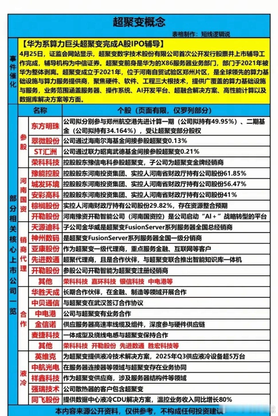 超聚变概念有哪些?4月25日,超聚变完成A股IPO辅导,市场关注度提升。相关标的梳理如下:- 参股方:东方明珠、翠微股份、ST汇洲等通过基金间接持股- 河南g资背景:豫能控股、城发环境、安彩高科等实控人- 代理商/合作方:神州数码、亚康股份、荣科科技等为核心经销商或合作伙伴- 液冷/配套供应商:英维克、中贝通信、同飞股份等提供液冷、连接器等相关服务以上仅为公开信息整理,不代表市场走势,理性看待题材热度,不盲目跟风炒作财经今日看盘