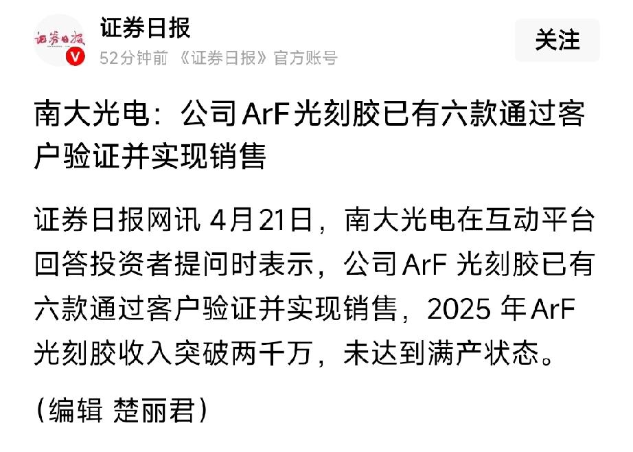 国产光刻胶爆发!南大光电6款ArF量产,五大核心标的出炉 4月21日,南大光电(300346)官宣:6款ArF光刻胶通过验证并销售,2025年收入破2000万元,产能50吨/年未达产 。作为国内唯一量产ArF高端光刻胶企业,适配28-14nm先进制程,打入中芯、长存供应链,打破日企垄断。半导体国产替代加速,光刻胶成最强赛道,头部企业验证放量、业绩高增。 核心标的(5只) 1. 南大光电(300346):ArF光刻胶标杆,6款量产、客户验证突破,MO源+特气+光刻胶三轮驱动 。 2. 彤程新材(603650):KrF市占率第一,ArF批量供货,全品类覆盖,北京科华全球八强。 3. 上海新阳(300236):KrF厚膜胶龙头,光刻胶树脂自研,先进封装+晶圆制造双赛道。 4. 鼎龙股份(300054):高端光刻胶配套+抛光垫,CMP材料龙头,半导体材料平台型企业。 5. 雅克科技(002409):光刻胶+电子特气+前驱体,海外并购+国产突破,客户覆盖头部晶圆厂。 投资必警:市场有风险,投资需谨慎。光刻胶验证周期长、良率波动大,行业竞争加剧,南大当前收入偏低、产能释放不及预期风险,不构成投资建议。 如文图有侵权或者来源标注有误不让转载的,可在今日头条私信我们,我们会第一时间删除处理。