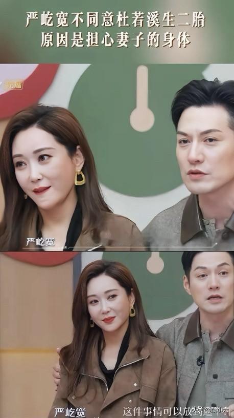 杜若溪眼眶红了,严屹宽却说“不生了”。中年二胎,到底卡在哪里? 镜头前,当严屹宽再次说出“为了你身体,咱们不要二胎了”,旁边的杜若溪低头笑了笑,眼里却有泪光闪了一下。 她轻声补充道:“其实我检查过了,医生说没问题……” 但严屹宽还是摇摇头。 这一幕挺耐人寻味。 41岁的杜若溪状态很好,明显是想再要一个孩子,可47岁的严屹宽却异常坚决。 真的是因为身体吗?还是因为那句没说出口的“压力太大”? 他们俩要养四个老人,女儿上的是国际学校,一年学费就好几十万。 严屹宽在节目里还提过,可能要工作到快八十岁才能退休。 明星赚得再多,在这种顶级消费圈里,多一个孩子意味着教育、住房、看护成本直接翻倍。 这哪是“多双筷子”的事,这是另一座山啊。 所以杜若溪眼里的泪,严屹宽嘴里的“不”,或许根本不是同一个问题。 一个是“想不想”,一个是“敢不敢”。 在现实账本面前,多少人的二胎梦,最后也卡在了“算了吧”这三个字上? 你呢,如果身体允许但钱包紧张,还会选择再要一个吗?严屹宽 严屹宽恋情