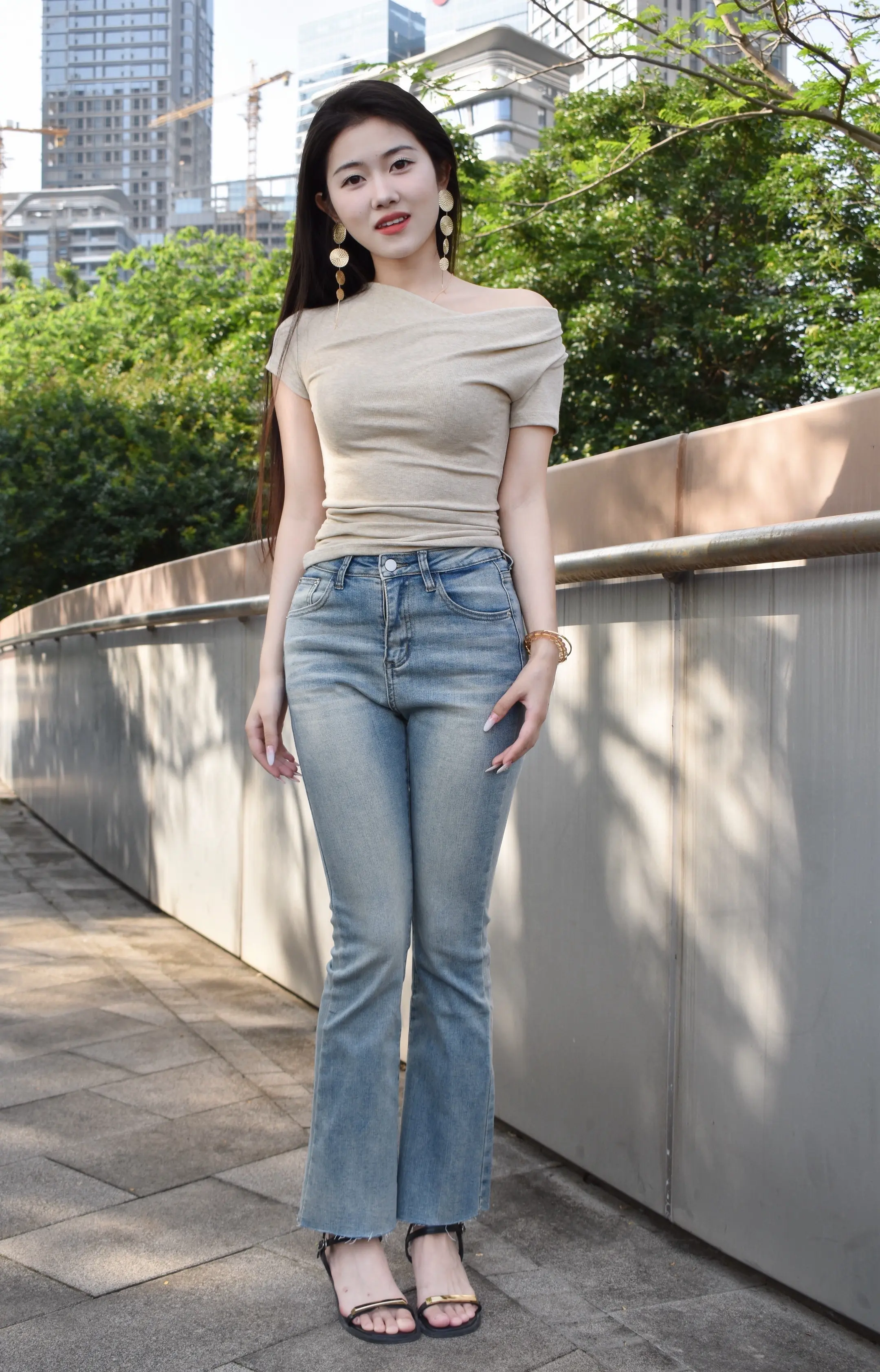 牛仔裤上,美人笑眼含春意。