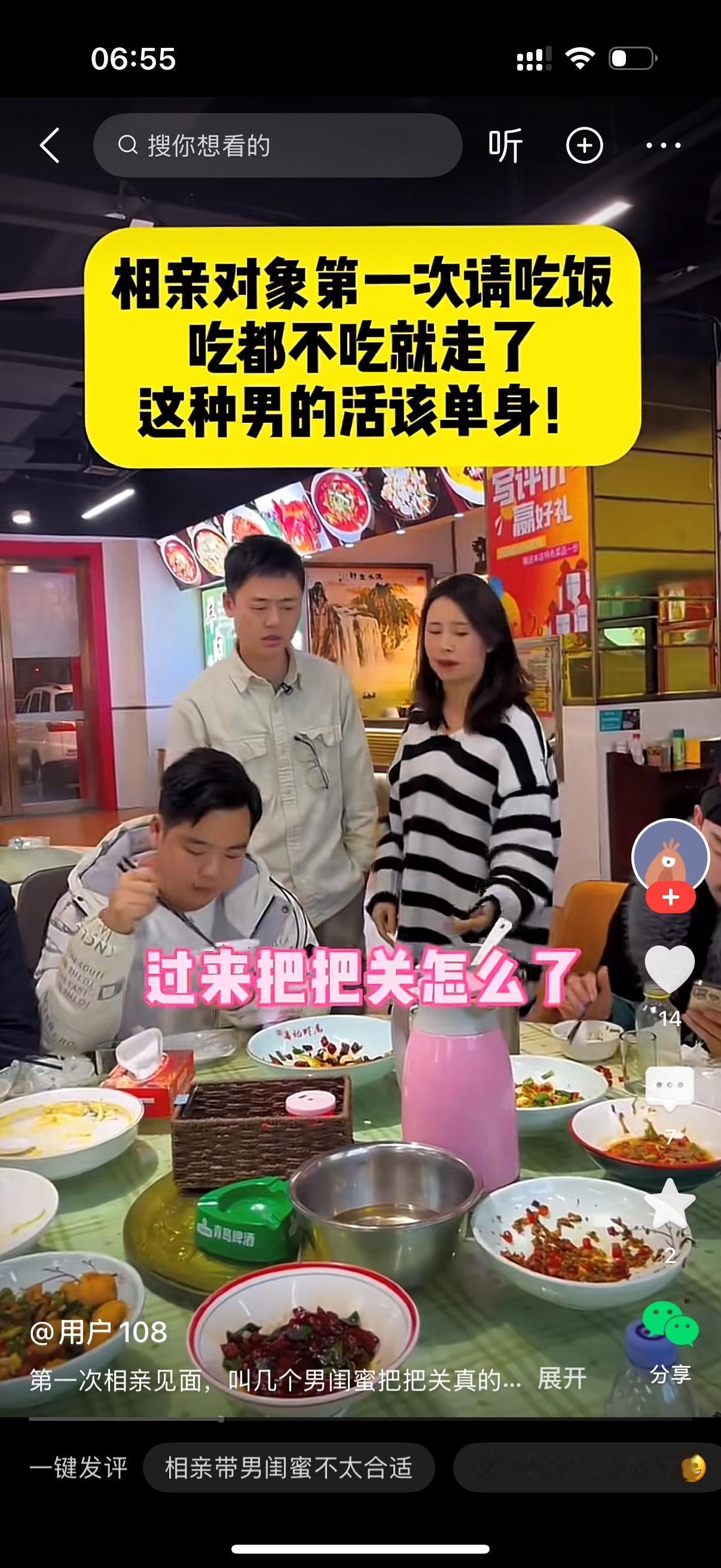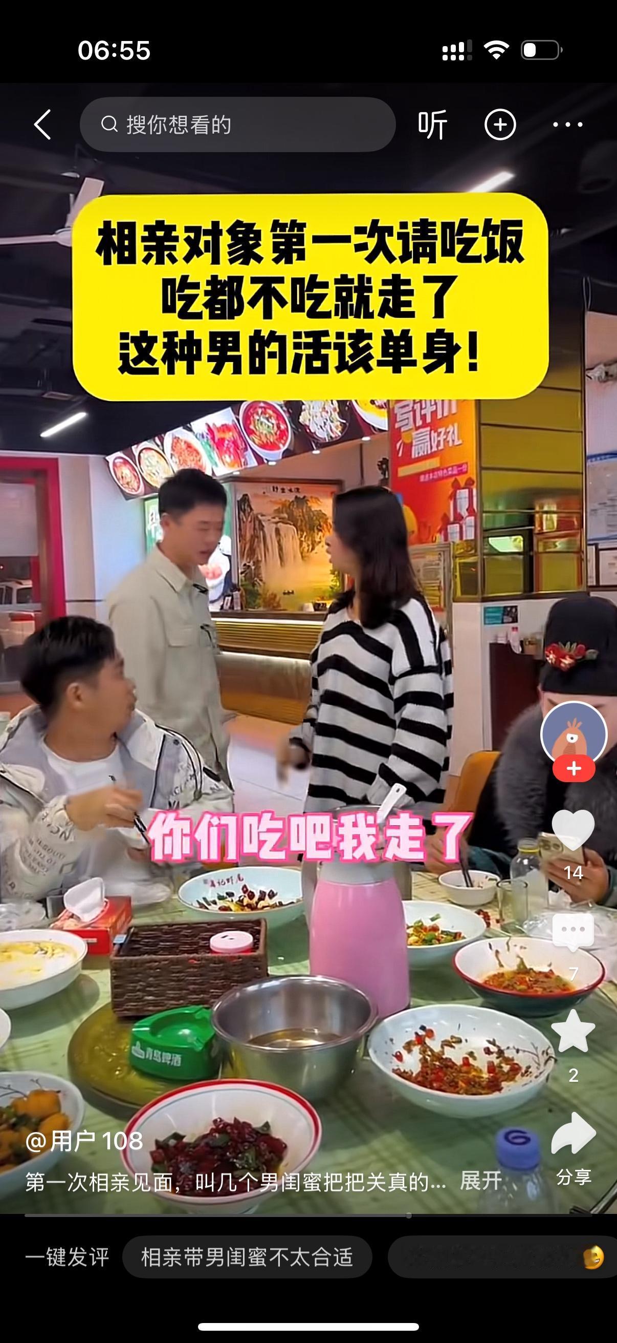 哎,你来了啊,快来坐坐坐,女子热情的和自己相亲的男子打招呼。男子看坐满了人,有点生气地说,你叫了这么多人啊?女子解释说,他们都是我的闺蜜,过来把把关怎么呢?男子问,这些男的怎么回事啊?女子说,都是我男闺蜜啊。男子说,来蹭饭的吧?你们吃,我走了。女子拉住他,你把单买了啊。男子怒吼,你有病吧,我吃都没吃。女子骂他,活该你单身。这男子确实小气,这么没格局怎么找女友啊?