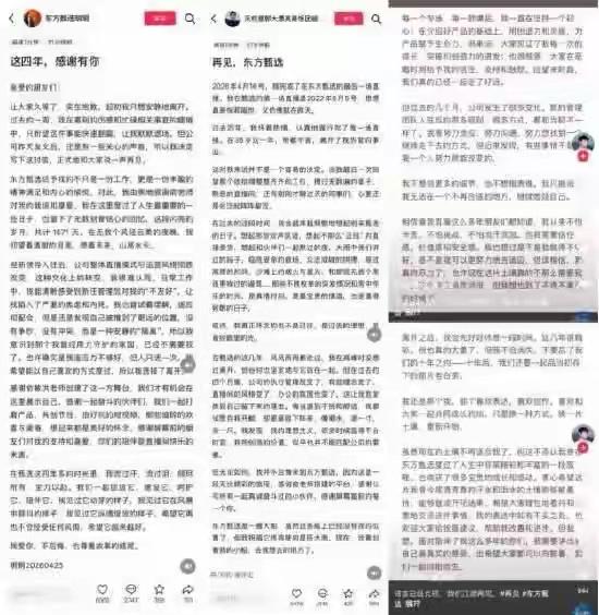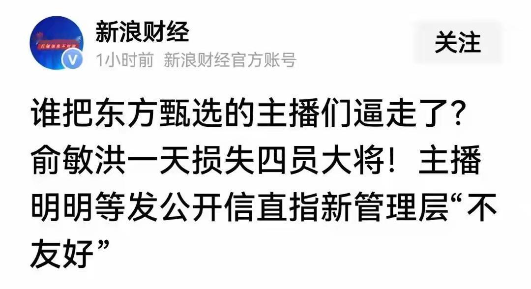 4月25日,东方甄选主播明明、天权、中灿、林林同一天宣布离职,俞敏洪一天之内痛失四员大将。 而就在几天前,针对这几位主播的离职传闻,俞敏洪还曾亲自出面辟谣,称两人只是在休假。 整个事件的时间脉络,有着清晰的官方节点可查。2025年11月,俞敏洪发文确认孙东旭从东方甄选正式离职,同年12月24日,在新东方任职19年的老将孙进官宣出任东方甄选执行总裁,正式接棒管理。 2026年4月10日,孙东旭彻底退出东方甄选,仅仅半个月后,关于核心主播即将离职的传闻便开始在网络发酵。 4月24日晚,东方甄选人力资源部正式发布公告,官宣明明和天权即将离职,提及俞敏洪曾与二人进行诚挚沟通和挽留,但最终尊重他们的选择。 4月25日,中灿和林林也相继发布离职声明,一天之内四位陪伴东方甄选成长的核心老主播集体告别,彻底点燃了全网舆论。 四位主播的离职声明里,不约而同地指向了同一个核心原因,就是新任管理层入驻后,公司发生了根本性的改变。 明明直言,自己能清晰感受到新管理层的不友好,在工作中被逐步边缘化,最终意识到那个自己曾经用力守护的家园,已经不需要自己了。 天权则表示,过去四个月里,公司的执行管理层变了,直播理念、直播间风格和办公室氛围也全都变了,他找不到继续留下来的理由。 中灿也坦言,新管理团队入驻后的很多规则和方式,都和当初不一样了,自己无法在一个不适合的地方继续燃烧自己。 而这场集体离职风波的核心,就在于新任掌舵人孙进推行的两项核心改革。 其一便是备受争议的加班文化,据内部知情人透露,孙进对员工要求极高,推行高强度的加班制度,甚至会通过查看监控,实时了解员工的加班动态。 其二,也是最核心的改革,就是彻底的去明星主播化。孙进明确不允许东方甄选再出现明星主播,不能让任何一个人的风头盖过东方甄选品牌本身,坚决避免重蹈董宇辉事件的覆辙。 在孙进的管理逻辑里,用户只需要记住东方甄选直播间和自营产品就够了,主播是谁是次要的,东方甄选离开谁都能正常运营。 但这恰恰也是本次事件最核心的矛盾,它触碰了直播电商行业最底层的商业逻辑。直播电商的核心三要素是人货场,其中人是连接产品和用户最核心的纽带,用户之所以愿意在直播间下单,很大程度上是出于对主播的信任。 放眼整个直播电商行业,去明星主播化的改革,东方甄选并不是第一家。 交个朋友直播间在罗永浩淡出后,通过搭建矩阵化的主播体系,完成了去个人IP化的平稳过渡;李佳琦直播间也在不断培养新人主播,弱化个人标签,推进多主播的运营模式。 但这些成功的案例,都有一个共同的前提,就是没有彻底否定主播的个人价值,而是在保留主播个人特色的基础上,实现品牌与主播的共生,而非一刀切式的抹杀。 事件发酵之后,全网网友的观点也分成了三个清晰的阵营。 绝大多数网友都站在离职主播这边,大家纷纷表示,这些老主播陪着东方甄选从低谷走到巅峰,是直播间的灵魂所在,公司过河拆桥式的改革,寒了老员工的心。 也有一部分网友认可孙进的改革,他们认为企业发展不能过度依赖单一主播,否则会面临极大的经营风险,去个人IP化是企业长期发展的必然选择。 还有一部分网友提出了更中立的看法,他们认为东方甄选当下的核心问题,从来都不是主播,而是供应链和产品竞争力,这场改革根本没有触达企业发展的核心痛点。 从目前的情况来看,俞敏洪最终还是选择了站队孙进,认可了他的改革方向。 而这场改革最终会走向何方,无非是两种结果。要么孙进成功搭建起不依赖主播的品牌化直播体系,让东方甄选摆脱对个人IP的依赖;要么彻底失去老粉的信任,导致直播间流量和销量持续下滑,最终改革适得其反。 但可以确定的是,对于直播电商这个行业来说,从来没有放之四海而皆准的模式。品牌IP和主播个人IP从来都不是对立的,如何找到两者之间的平衡点,才是企业最该思考的问题。 毕竟用户愿意为产品买单,既需要过硬的产品力,也需要主播建立起来的信任与情感连接,两者缺一不可。 文章描述过程、图片都来源于网络,涉及版权或者人物侵权问题,或有事件存疑部分,联系后即刻删除或作出更改