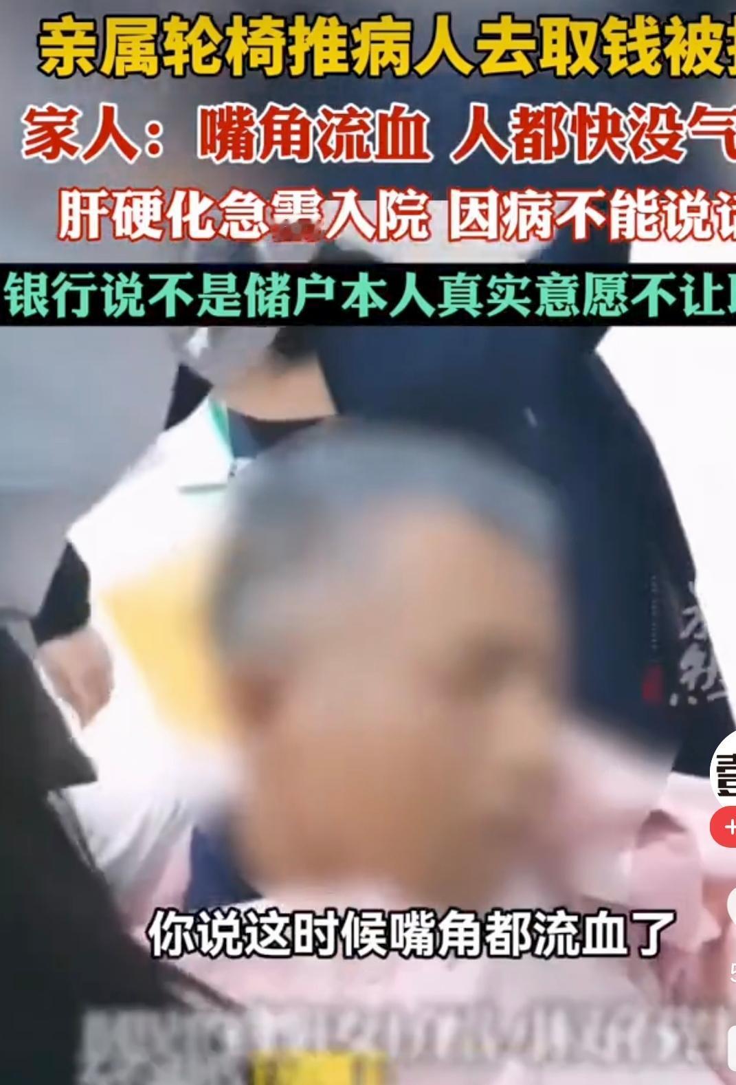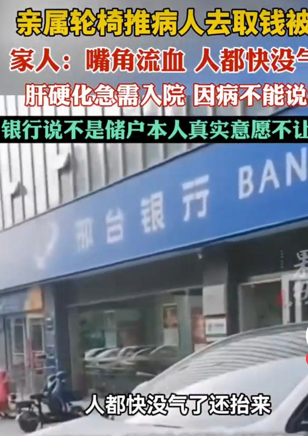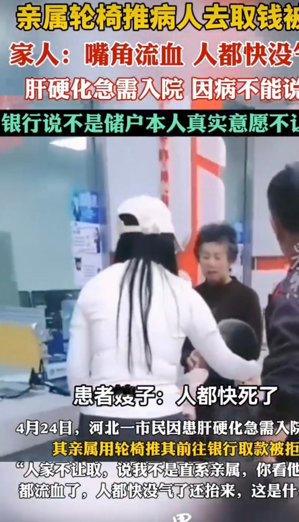 河北邢台,未婚未育男子因为肝硬化,需要住院,但是钱在银行,其嫂子知道银行规矩,就轮椅推男子到银行取钱,结果男子病情加重,无法言语,银行称非储户真实意愿而拒绝办理业务,其嫂子大喊:你看嘴角都流血了,人都快没气了,网友纷纷言道:制度是死的,人是活得。 说起银行取钱这件事真的让人憋一肚子火。 一个没结婚没孩子的男子得了肝硬化,病情突然加重,急等着住院交钱救命,可治病的钱都存在银行里,家属没法直接取出来。 他嫂子知道银行要本人到场办业务的规矩,没办法只能找了个轮椅,拖着已经病得快站不住的小伙往银行赶,就想着赶紧把钱取出来交住院费。 到了银行的时候,小伙已经快撑不住了,整个人瘫在轮椅上,连话都说不出来,嘴角还往外渗血,眼看着气息都越来越弱。 可银行工作人员看了这情况,还是咬死了规矩,说必须得储户本人表达真实意愿才能办业务,就这么卡着不给取钱。 旁边的人看着都急,那可是救命的钱,人都快不行了,还在这儿卡所谓的流程。 这事被拍下来传到网上,瞬间就炸了锅,大伙说的最多的一句话就是“制度是死的,人是活的”。 这话真的没说错,银行要求本人办理业务,本来是为了保护储户的资金安全,怕有人冒领钱,是好心的规矩,可怎么到了救命的节骨眼上,反而成了挡着人活路的门槛? 真要按规矩来,难道就没有特事特办的通道吗?以前也不是没见过银行给重病老人、急病客户上门办理的新闻,怎么到了这儿,人都推到大厅里了,就不能通融一下? 是真的没有变通的制度,还是办事的人怕担责任,多一事不如少一事,宁可看着人熬着,也不愿意多走一步特殊流程? 说白了,所有的规矩设立的初衷都是为了人好,不是为了故意难为人。资金安全重要,难道人的命就不重要吗? 要是真的按流程卡,等小伙没了,再把钱取出来还有什么用?这不是守规矩,是刻板到了冷血的地步。 后来银行终于给办了,也赔礼道歉,可小伙被这么折腾一趟,病情又加重了几分,谁来担这个责任?总不能一句“按制度办事”就把所有问题都盖过去吧? 其实大家生气也不是针对银行的规矩,是气那种把规矩看得比人命还重的懒政。 各行各业都有自己的规章制度,但所有制度的底线都应该是先保人命,遇上危急情况,多一点变通,多一点为别人着想的善意,比死守着条文重要一万倍。 要是都像这次这样,那下次再有普通人遇上急事,是不是都得拖着半条命去各个部门闯关,才能拿到本来就属于自己的东西? 这事真该给所有服务行业提个醒,规矩是用来服务人的,不是用来卡人的。 这事乍一听挺离谱,仔细想其实戳中了很多人都碰到过的糟心事。 明明是自己的钱、自己该办的事,就因为卡个“规定”,急得团团转没人通融。 首先得说,银行要本人办业务的初衷真没毛病,要是随便谁拿个证件就能取别人的钱,大家存在银行的钱哪还有安全感? 但规矩是死的人是活的啊,都亲眼看见人快不行了、等着钱救命,还咬着“必须本人表达意愿”不放,这就不是守规矩,是懒。 就是办事的人怕担责任,反正按流程走就算出啥事也怪不到自己头上,至于客户急不急、有没有生命危险,那不在自己的考核范围内,多一事不如少一事。 但反过来讲,也不能一竿子打翻所有规定,要是随便什么情况都能“特事特办”,时间长了规矩就成了摆设,最后受损的还是普通人的权益。 问题的关键从来不是要不要守规矩,是规矩里得提前留好救命的“绿色通道”,真碰到急病、重病这种特殊情况,有明确的流程可以走,不用一线员工自己担责任去通融,也不用客户拖着半条命来证明“我真的需要取钱”。 服务行业嘛,说到底是给人办事的,不能把自己活成规矩的“复读机”,得搞清楚规矩是用来保护人的,不是用来堵人命门的。 《商业银行法》第49条规定:“商业银行应当保障存款人的合法权益不受任何单位和个人的侵犯。” 银行保障储户资金安全的法定义务,本质是为了维护储户的合法权益,而生命权是公民最高的人格权益,在储户生命面临危急时,机械套用“本人到场”的流程,实际上背离了该法条保护储户权益的立法本意,银行应当针对危急情况建立配套的应急办理机制,平衡资金安全与储户的紧急需求。