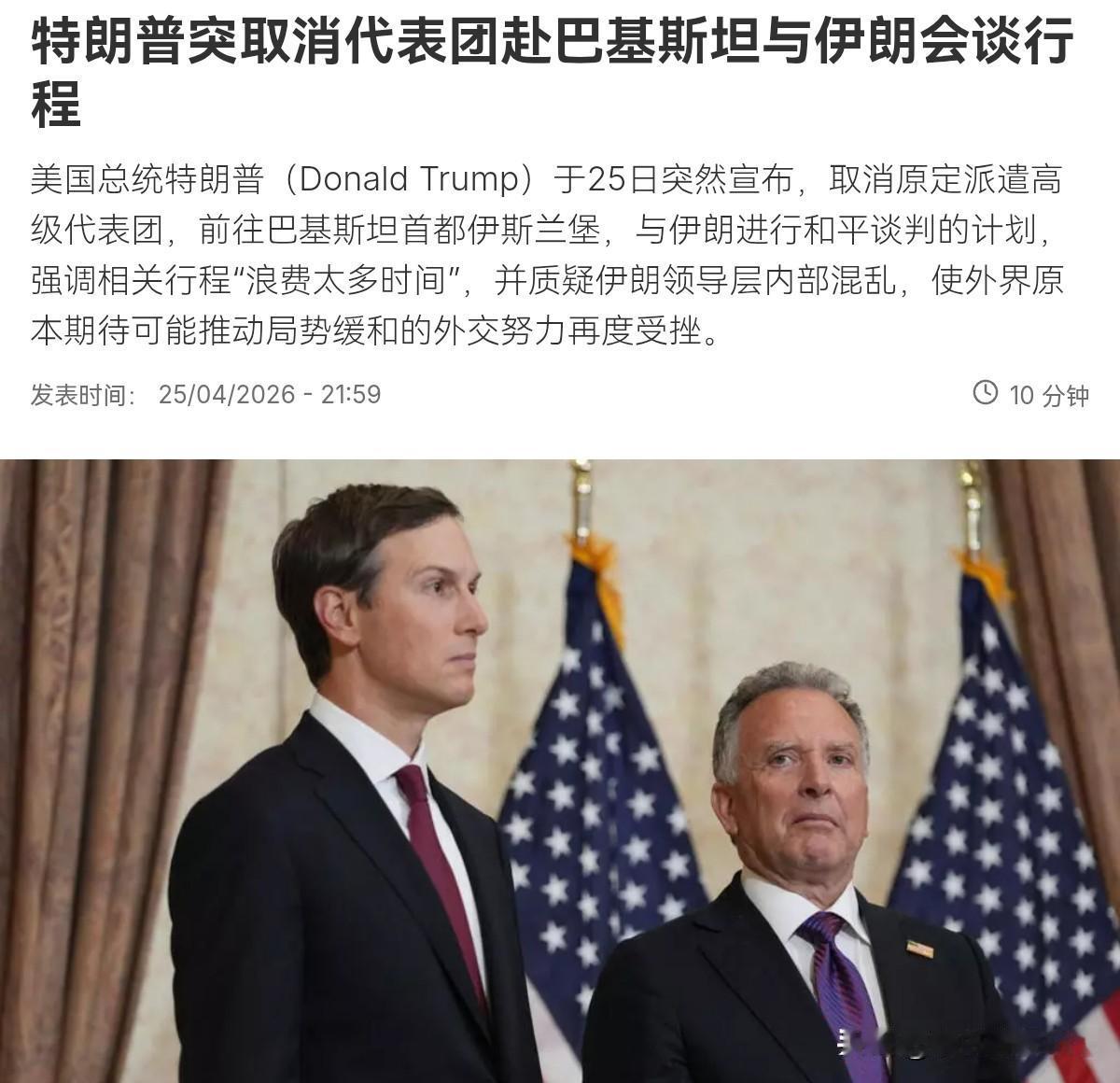 美国对伊朗耍了一个小花招!赶在谈判之前,特朗普下令叫停了美伊之间的谈判!4月26日,根据法新社报道,美国总统特朗普突然宣布,取消原定派遣高级代表团,前往巴基斯坦首都伊斯兰堡,与伊朗进行和平谈判的计划,特朗普声称相关行程“浪费太多时间”。特朗普声称,他们的领导层内部存在巨大的“内斗与混乱”。 没有人知道谁在掌权,包括他们自己。我们掌握所有筹码,他们一无所有!如果他们想谈,只需要打电话!!!很显然,为什么特朗普突然叫停谈判呢?说的直白一点,这就是要表明美国掌握主动权。特朗普此举似乎想要对伊朗表示,美国想什么时候谈,就什么时候谈,甚至不谈也可以,美国根本不着急。 而其攻击伊朗的领导层内部存在巨大的“内斗与混乱”,目的就是离间伊朗高层,打击伊朗民众与军方信心,通过暗示伊朗政权不稳,把伊朗当成是一个不可靠的谈判对手,核心目的就是施压必须彻底弃核。当然,美国算盘打的很精,但明显伊朗根本不吃这一套。事实上,伊朗对美国的这一手早有准备。 美国声称伊朗内部混乱,但伊朗刚公布最新消息,那就是伊朗最高领导人将会与俄罗斯总统普京会晤,这无疑是告诉美国,伊朗领导层仍在稳固运转,这让美国的离间不攻自破。而事实上到目前为止,伊朗对谈判也没有那么积极,而美国单方面宣布停火更是把美国的虚张声势暴露的很彻底。美国放伊朗鸽子,但伊朗显然比美国想象中的更加难以对付。