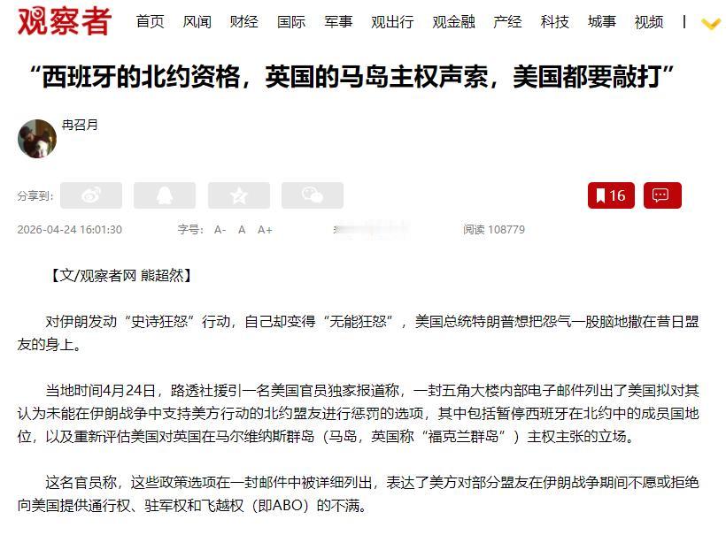 美国急眼了!打伊朗没赢,反倒要收拾西班牙和英国 当地时间4月24日,路透社从美国官员那儿得到独家消息,说五角大楼内部有封邮件,里面写着要惩罚那些不帮美国打伊朗的北约盟友,最显眼的就是两个办法: 一是暂停西班牙的北约成员国资格,二是重新考虑要不要支持英国对马岛的主权主张。 说白了,特朗普对伊朗发动了“史诗狂怒”行动,没占到半点便宜,自己反倒急得跳脚、无能狂怒,没处发泄,就把火全撒到了昔日盟友身上,连西班牙和英国这两个老伙计都没放过。 特朗普本来想靠“史诗狂怒”行动,把伊朗彻底打服,还到处吹牛皮,说这场行动是历史性胜利,把伊朗的军队打得再也没法作战。 可实际情况是,这就是一场自导自演的笑话,美国啥便宜都没捞着,所谓的“史诗狂怒”,到最后只剩“无能狂怒”。 正因为没打赢伊朗,特朗普一肚子火气没处撒,就盯上了那些没帮他的北约盟友,西班牙和英国第一个被盯上,成了他的出气筒。 为啥美国打不赢伊朗?特朗普和他的国防部长把这场行动吹得天花乱坠,说38天就重创了伊朗军事力量,还说彻底摧毁了人家的海空军。 可据美国自己的媒体4月22日报道,有知情官员偷偷透露,伊朗的军事力量,比美国说的多太多,一半的导弹能正常用,六成海军还在,三分之二的空军能作战,4月21日还在首都展示了射程2000公里的导弹,明着告诉美国:没被打垮,还能跟你扛。 打不赢伊朗,特朗普不敢再找人家麻烦,就把火撒到了盟友身上。先说说西班牙,它早就得罪特朗普了,之前特朗普让北约盟友多交军费,西班牙直接拒绝,这次打伊朗,西班牙更硬气,3月30日就说,不让参与打伊朗的飞机飞越自己的领空,也不借军事基地给美国。 特朗普觉得,西班牙是北约成员国,就必须无条件帮自己,不帮就是背叛,就想暂停它的北约资格,可北约官员说了,条约里压根没这规矩,美国就是放狠话,压根没权力这么做。 再看英国,马岛是英国和阿根廷一直争的地方,之前美国一直帮着英国,英国才能牢牢控制马岛。 可这次,英国也不顺着特朗普,说要按自己的利益来,不帮美国打伊朗,这下彻底惹恼了特朗普,就放话要重新考虑支持英国对马岛的主权主张。 这对英国来说太致命了,要是美国不支持它,阿根廷肯定会趁机要马岛,英国就麻烦了,说白了,美国就是拿人家的命根子要挟。 其实大家都懂,美国之所以收拾这两个盟友,根本不是人家没尽义务,就是特朗普自己没本事打赢伊朗,拿盟友撒气,想找回点面子,还想逼其他盟友以后不敢不听话。 可美国的算盘根本打不响,美国国会就反对,说打击盟友就是打击自己,而且这些惩罚措施,大多只是纸上谈兵,真要实施,麻烦多还费钱。 现在的北约,早就不是美国说了算,每个盟友都有自己的心思,不会无条件听美国的。西班牙和英国不帮美国,也是为了自己的利益,不想被卷入战争。 美国一味威胁盟友,只会让更多盟友离心离德,最后削弱自己的影响力。说到底,特朗普就是无能狂怒,没本事打赢伊朗,就欺负盟友,这种霸权做法,迟早会搬起石头砸自己的脚。