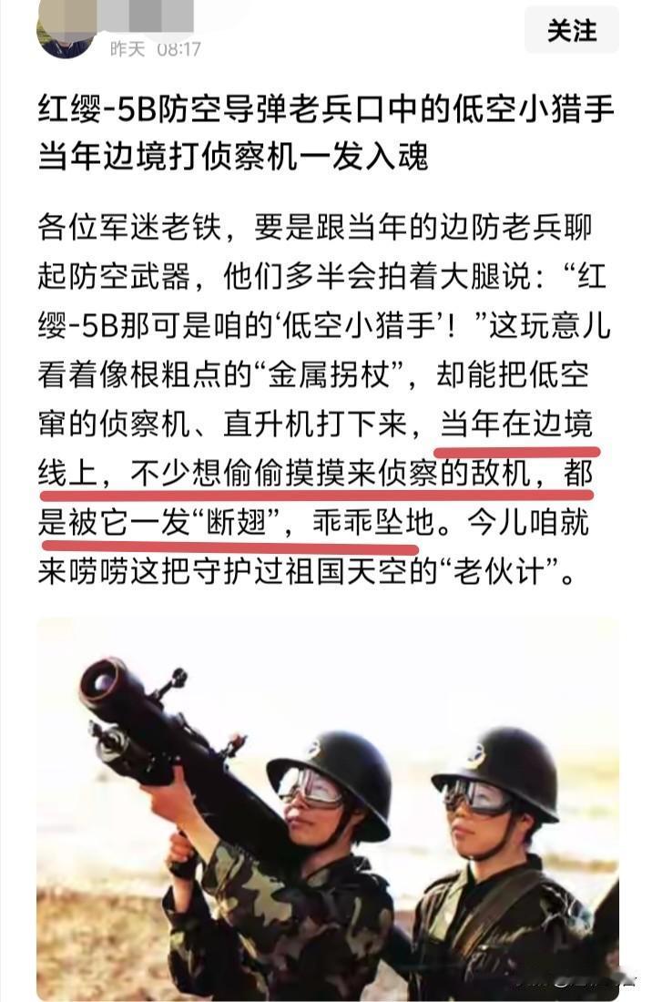 红缨-5B单兵防空导弹边境取得战绩?武器装备发展史不是故事会! 偶然看到某文关于红缨-5B单兵防空导弹在边境击落前来侦查的敌机,全文侃侃而谈。可据我所知,整个红缨-5系列在国内并无实战战绩,有的都是出口国外的战绩。更何况那时对方又没有无人侦察机,没有在双方都没有出动空军的情况下,真要干下来一架敌机都是要载入战斗史册的,可偏偏查不到! 红缨-5号单兵防空导弹是仿制苏联萨姆-7单兵防空导弹,是我国第一代单兵防空导弹,抗干扰性能差、制导性能不及原版、射高与速度相对都很一般,部队装备没多久就开始研制第二代,也就是前卫-1。当在今天也就打打中型无人机或巡飞弹,但凡有被动防御手段的战机和直升机被它锁定时释放红外干扰弹基本都能欺骗它,可以说是一言难尽! 如果没有现实依据的杜撰那就于乐观小说,也不知道他的是不是平行宇宙另一个地球上的事!说到这我想当年部队热映《士兵突击》时的一幕,成长那一句关于红缨导弹斜射距离的回答,整个单兵导弹专业的兄弟直骂娘,因为这距离直接可以干到欧洲去了!这就是所谓外行看热闹,内行看门道吧。