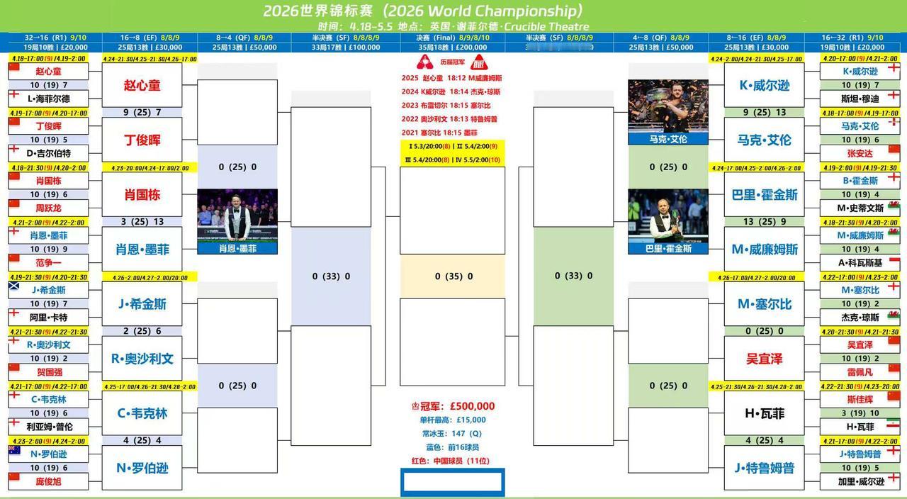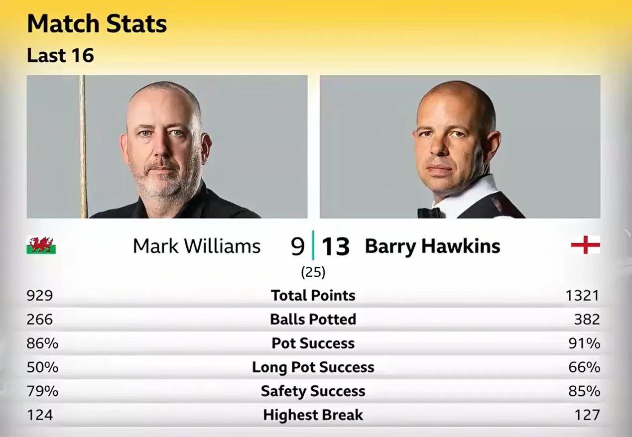 世锦赛,霍金斯闯入8强! 霍金斯对阵上届亚军马克威廉姆斯,霍金斯号称4强专业户,经常闯入职业比赛8强、4强。实力均衡,有战斗力,绰号老鹰。 马克威廉姆斯受困于眼睛视力老花,年龄偏大,和霍金斯打的比较吃力。第一阶段两人4-4勉强打平,第二阶段被霍金斯9-7拉开差距。 第三阶段,霍金斯高强度连续进攻,完全压制金左手。威廉姆斯在高难度长局对决中,简单失误增加,没有扛住。之前,霍金斯对阵威廉姆斯在世锦赛全部落败,这一次终于获得胜利。 之前威廉姆斯说,夺冠就裸奔,这一次大家没有眼福了。 霍金斯下一个对手是艾伦。 凌晨进行的另外一场元老对决,奥沙利文6-2领先希金斯。 今天下午五点,两场重要对决,赵心童对阵丁俊晖第三阶段,目前赵心童9-7领先。世锦赛丁俊晖在第二阶段落后的局面下,有一次翻转比分。在11年丁俊晖第二阶段7-9落后宾汉姆,最后翻盘。看表情,丁俊晖很轻松,翻盘赵心童不是不可能。 另外一场是吴宜泽对阵大师塞尔比第一阶段,凌晨两点,双方第二阶段的较量。吴宜泽和塞尔比历史上交战6次,无一胜绩,但是记录总是要打破的,这一次就是机会。