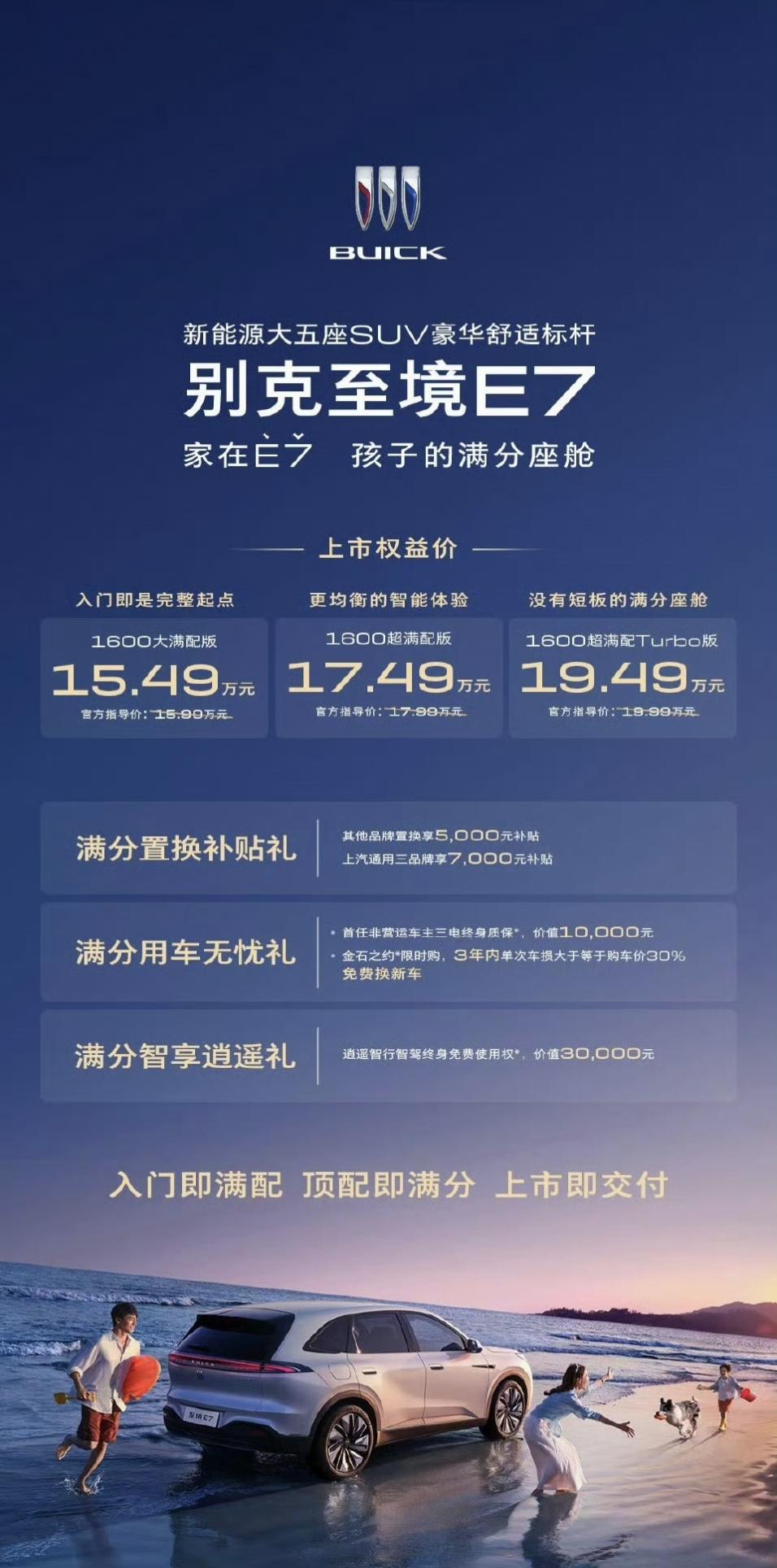 15万-20万预算,大五座中型SUV,别克至境E7也挺好的,买车考虑别克的也可以看看。 这个车最大的优点是环保座舱,内饰材料用料很不错,对一些容易过敏的女性朋友,孕妇,或者小孩比较友好。 其次是全系标配32度大电池,纯电续航CLTC起步就有235公里,这块很良心,舍得给电池。 而且这是个混动,没有续航焦虑。 上次有人问我,至境有没有纯电计划,想买个E7的纯电版本,这个我也问了,暂时没计划。 2026北京车展