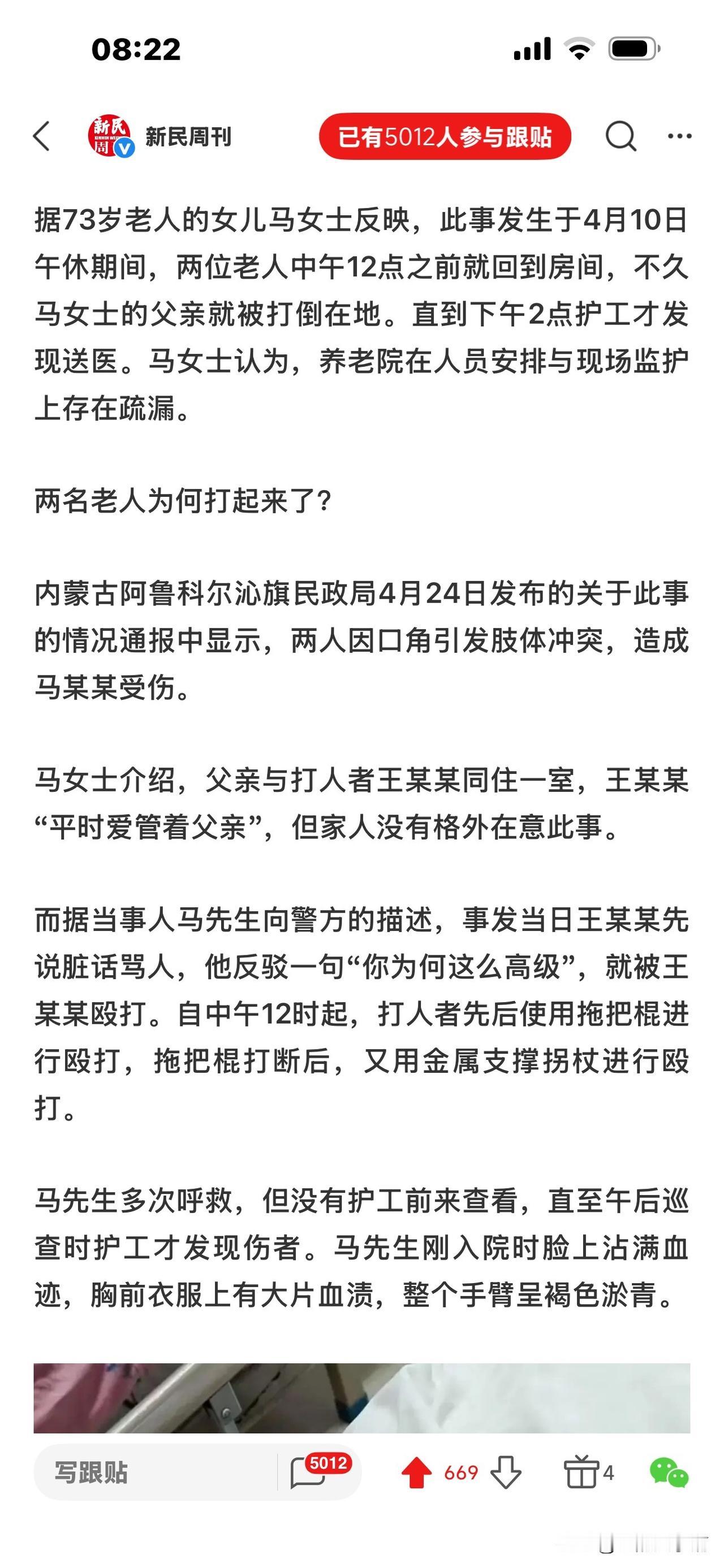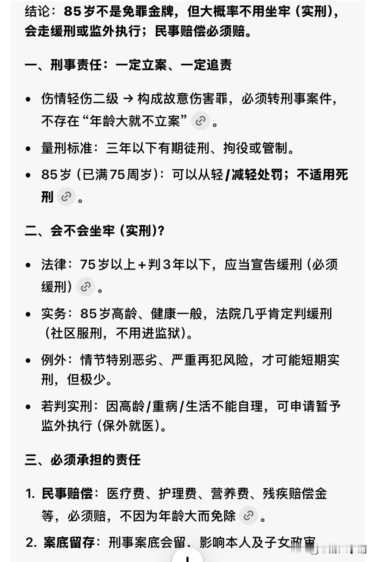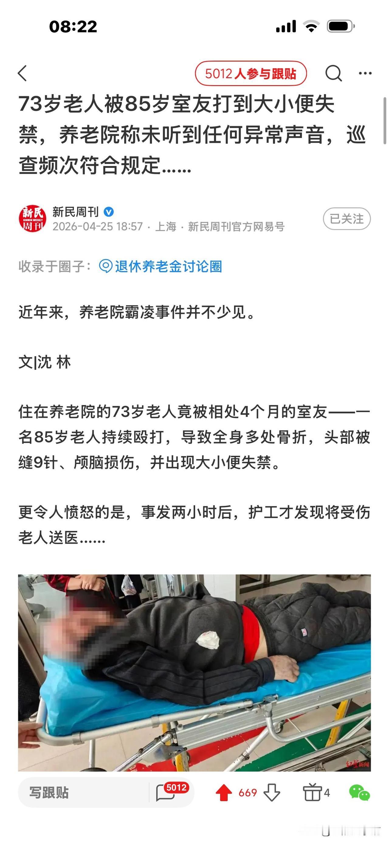 85岁老人在养老院殴打73岁老人后续: 将转成刑案,可判3年以下有期, 但打人者年事已高,可能缓刑,且社区服刑。 近日,内蒙古阿鲁科尔沁旗一养老院发生霸凌事件,令人震惊: 85岁王伯和73岁的马伯同室4个月,王伯喜欢管马伯。 4月10日,午饭后休息期间,两人因口角发生争吵,矛盾升级! 王伯拿拖把和金属拐杖殴打马伯,致其全身多处骨折,头部被缝9针、颅脑损伤,并出现大小便失禁,后经医院鉴定为轻伤二级 。 马伯家属认为,从12点多到下午2点多,在王伯连续殴打马伯的时间里,马伯多次呼救,养老院没人出现并制止,才造成王伯受伤。 护工午后2:02分巡查才发现,马伯胸前衣服上有大片血渍,整个手臂呈褐色淤青状态。养老院应负有责任。 而当地民政局养老服务股调查结果称: 从12:30到2:02分,养老院每两小时巡更一次,完全符合有关规定。当时发现老人被打后,院方立即派人陪同就医。 王伯入院后被评估为半失能无暴力倾向,所以医院无法预见其暴力行为。殴打期间,两人没按床头呼救器,没传出外部声响和预警。紧邻事发房间的活动室其他人也没有听见打斗声音。 马伯家属提出质疑!马伯被打得这么严重,多次呼救,是房间隔音效果奇好还是听而不闻?太蹊跷了。 不过,有律师指出,即便养老院流程合规,但没有尽到安全保障责任,不能据此免除过错。 至于打人的王伯,涉嫌故意伤害罪,除了要全额承担马伯的医疗费,还要付伤残赔偿、精神损害抚慰金。 目前,由于马伯被打成轻伤二级,帽子叔叔说下一步将转刑案。 王伯可能判坐牢三年以下。 但王伯85岁(超过75岁),年事已高,肯定会缓刑,并且不用实际坐牢,大概率是监外执行,比如社区矫正什么的。 那么你对这样的结果有什么异议吗? [祈祷][祈祷]