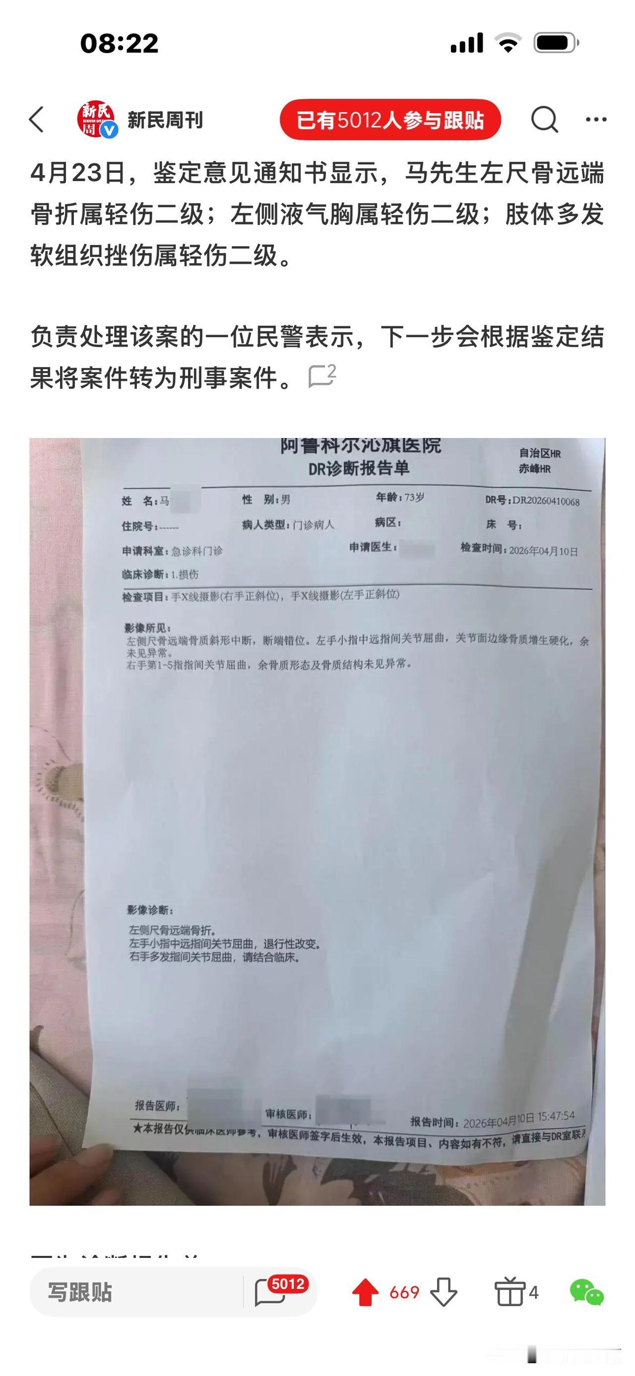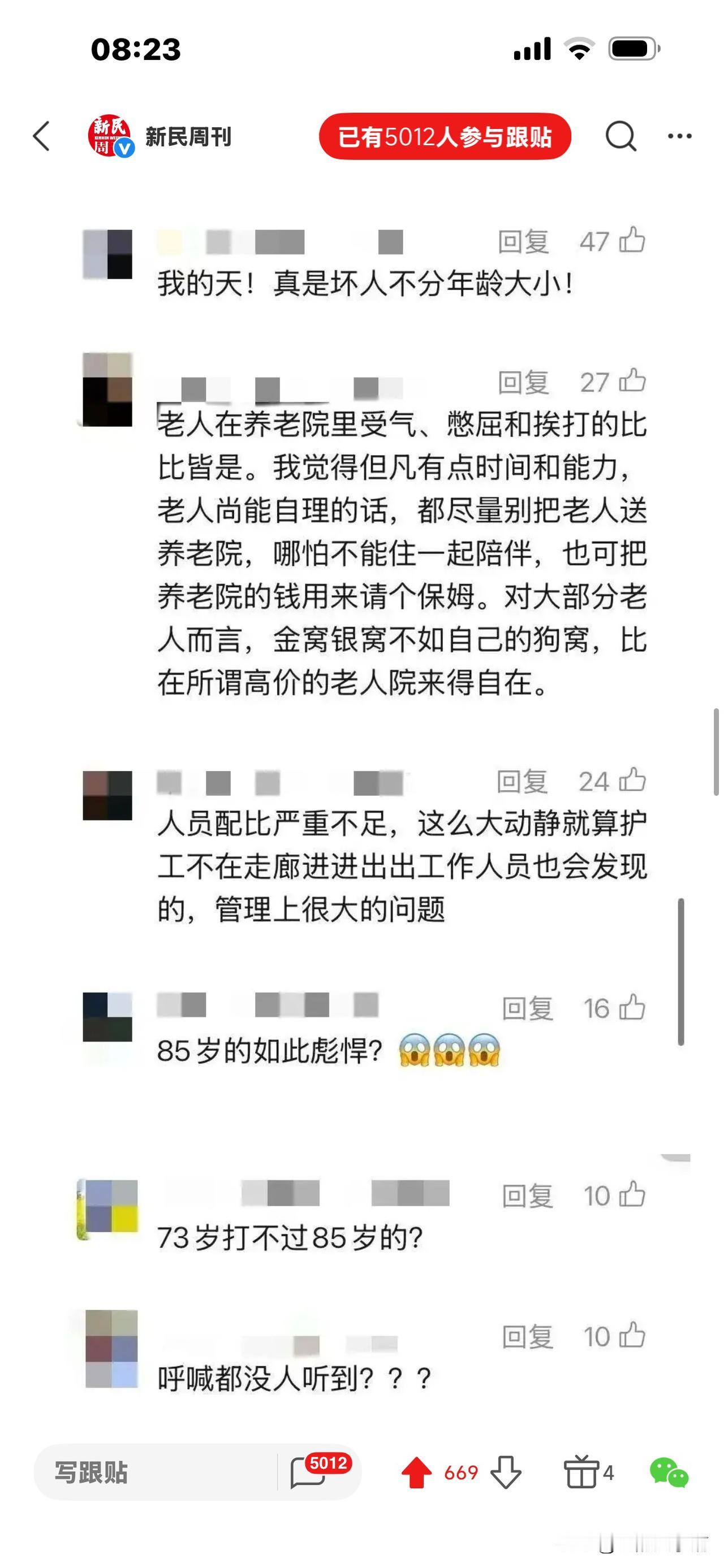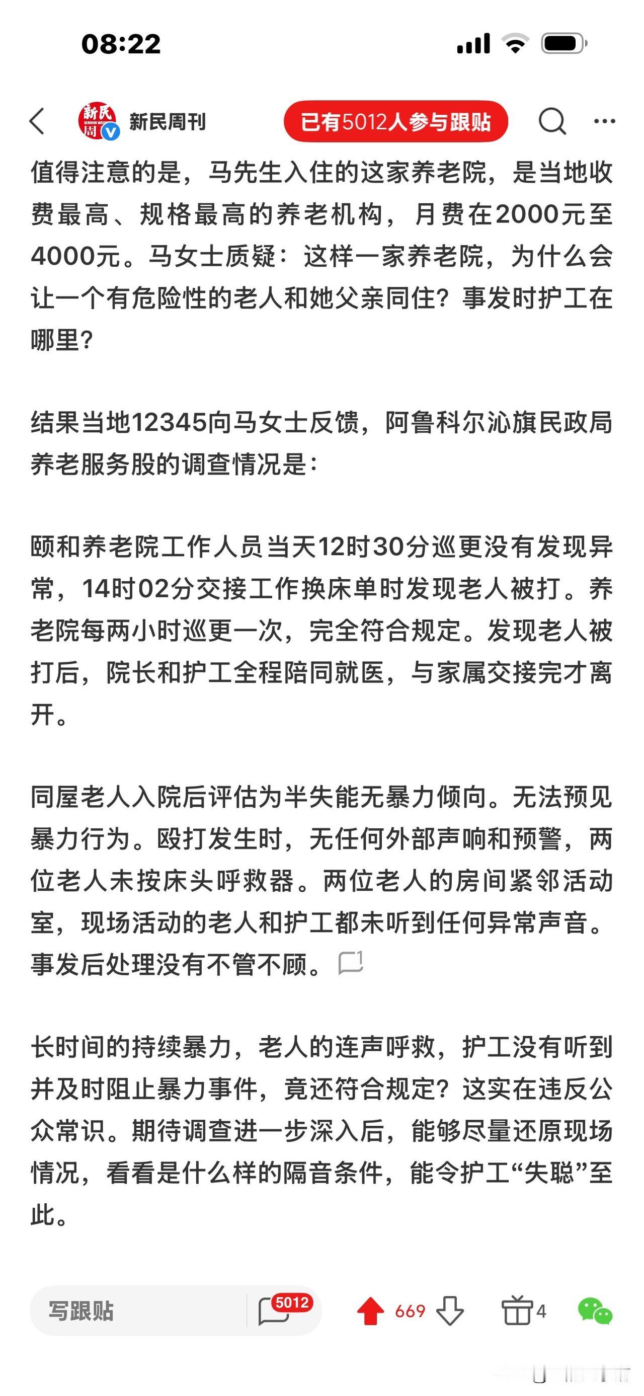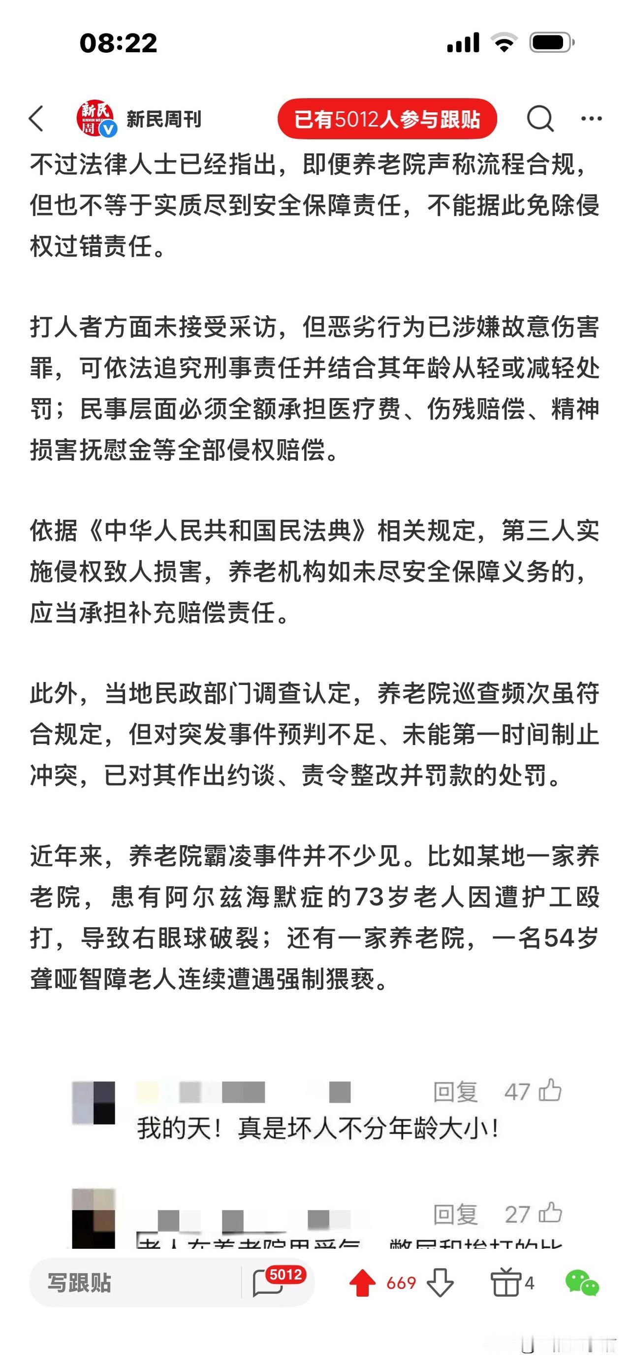 85岁老人在养老院殴打73岁老人后续: 将转成刑案,可判3年以下有期, 但打人者年事已高,可能缓刑,且社区服刑。 近日,内蒙古阿鲁科尔沁旗一养老院发生霸凌事件,令人震惊: 85岁王伯和73岁的马伯同室4个月,王伯喜欢管马伯。 4月10日,午饭后休息期间,两人因口角发生争吵,矛盾升级! 王伯拿拖把和金属拐杖殴打马伯,致其全身多处骨折,头部被缝9针、颅脑损伤,并出现大小便失禁,后经医院鉴定为轻伤二级 。 马伯家属认为,从12点多到下午2点多,在王伯连续殴打马伯的时间里,马伯多次呼救,养老院没人出现并制止,才造成王伯受伤。 护工午后2:02分巡查才发现,马伯胸前衣服上有大片血渍,整个手臂呈褐色淤青状态。养老院应负有责任。 而当地民政局养老服务股调查结果称: 从12:30到2:02分,养老院每两小时巡更一次,完全符合有关规定。当时发现老人被打后,院方立即派人陪同就医。 王伯入院后被评估为半失能无暴力倾向,所以医院无法预见其暴力行为。殴打期间,两人没按床头呼救器,没传出外部声响和预警。紧邻事发房间的活动室其他人也没有听见打斗声音。 马伯家属提出质疑!马伯被打得这么严重,多次呼救,是房间隔音效果奇好还是听而不闻?太蹊跷了。 不过,有律师指出,即便养老院流程合规,但没有尽到安全保障责任,不能据此免除过错。 至于打人的王伯,涉嫌故意伤害罪,除了要全额承担马伯的医疗费,还要付伤残赔偿、精神损害抚慰金。 目前,由于马伯被打成轻伤二级,帽子叔叔说下一步将转刑案。 王伯可能判坐牢三年以下。 但王伯85岁(超过75岁),年事已高,肯定会缓刑,并且不用实际坐牢,大概率是监外执行,比如社区矫正什么的。 那么你对这样的结果有什么异议吗? [祈祷][祈祷]