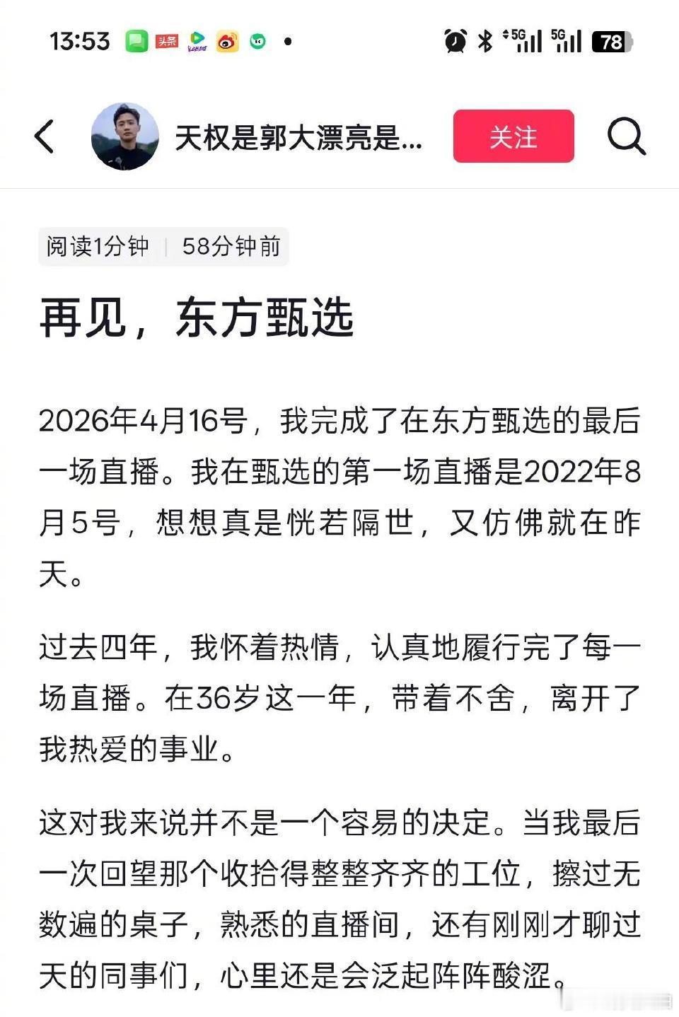 据了解,明明、天权在宣布离职前休假停播了一段时间。天权4月25日发文回应离职,称在36岁这一年,带着不舍,离开了热爱的事业。他表示在2026年4月16日完成在东方甄选最后一场直播,第一场直播则是2022年8月5日。