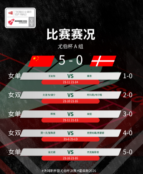 2026年汤尤杯小组赛赛况,中国5-0丹麦,徐文婧战胜杰克斯菲德,中国队大胜丹麦队,收获小组赛两连胜。