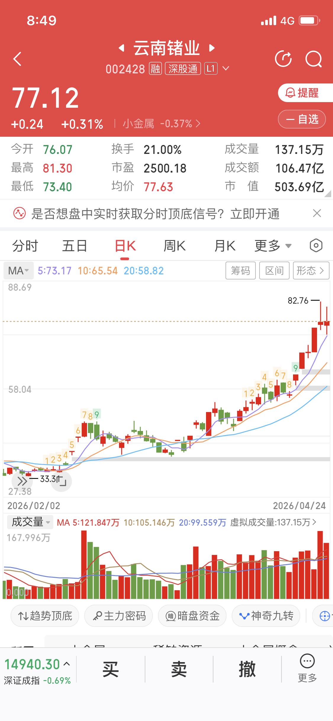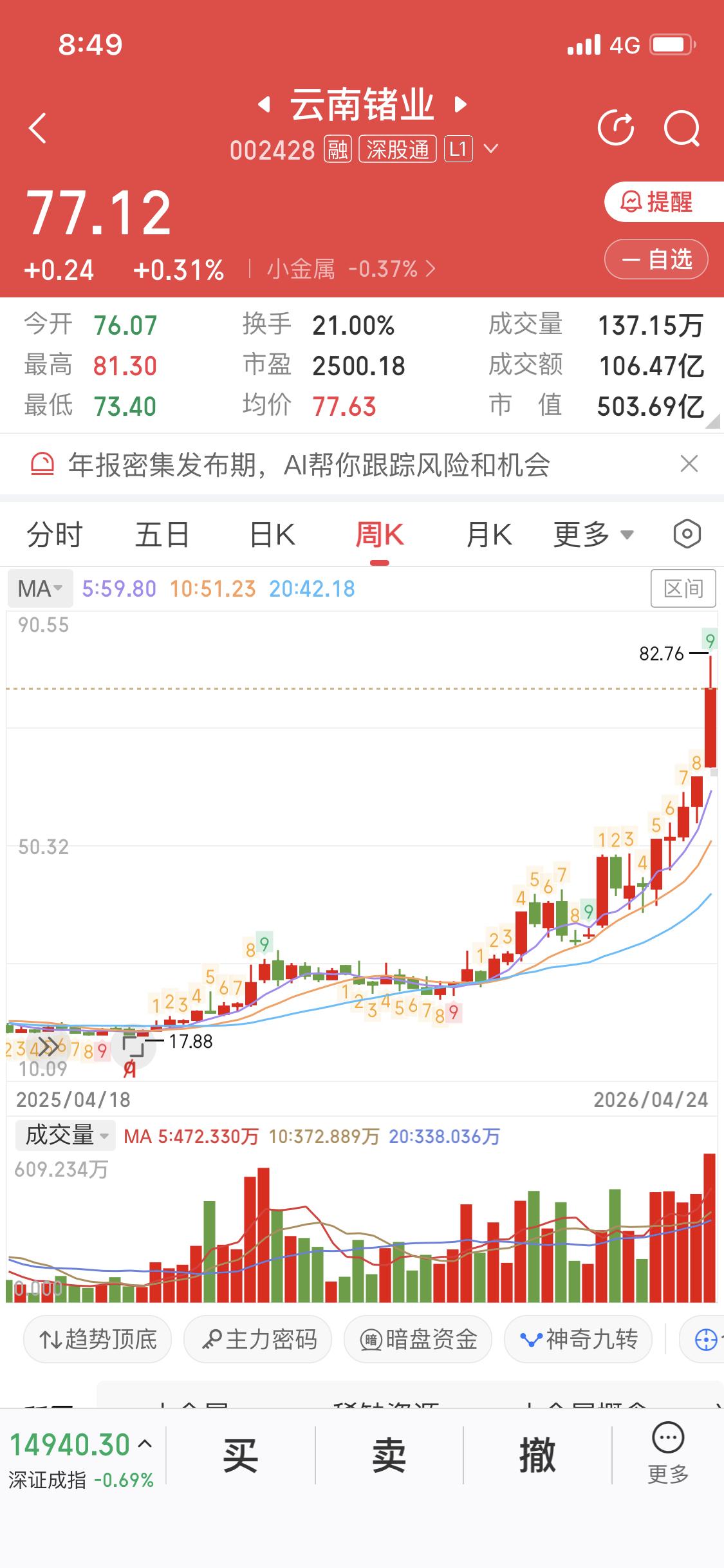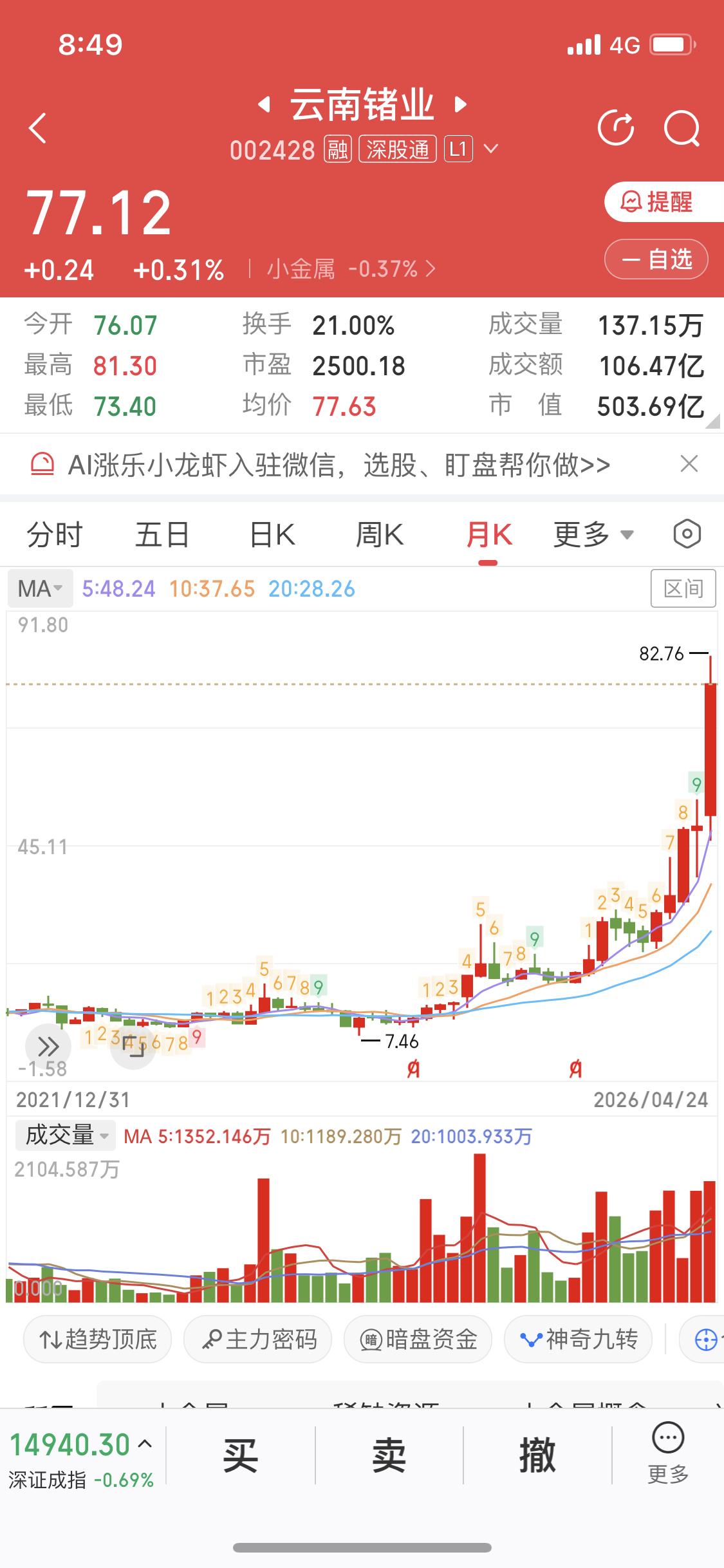 分析一只10倍大牛股云南Z业 从最低价7.46涨到77.12,妥妥10倍大牛股,收益率1000% 从2024年6月涨到2026年4月 用时1年10个月,大概660天 云南Z业,小金属板块 从月线看,呈多头排列,股价一直在5月线上方 从周线看,呈多头排列,股价几乎在5周线上方,即使有回调,第二周立即反包站上5周线 从日线看,呈多头排列,股价大部分时间处于5日线上方,20日线强支撑 月线看趋势,趋势一旦形成很难改变,整整上涨了22个月,中间调整了8个月,上涨月成交量放大,调整月缩量,主力行为。 未来云南Z业还能不能继续上涨,除非有大利空,大幅度下跌,月线拐头,趋势改变,否则77.12还将被刷新 趋势一旦形成很难改变,一直持有云南Z业的股民也特别有耐心,牛,真牛行业龙股 云南股票