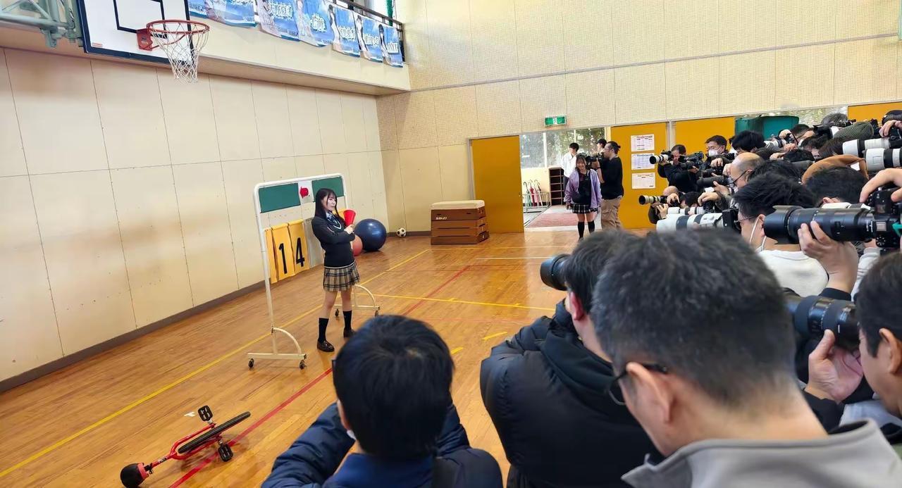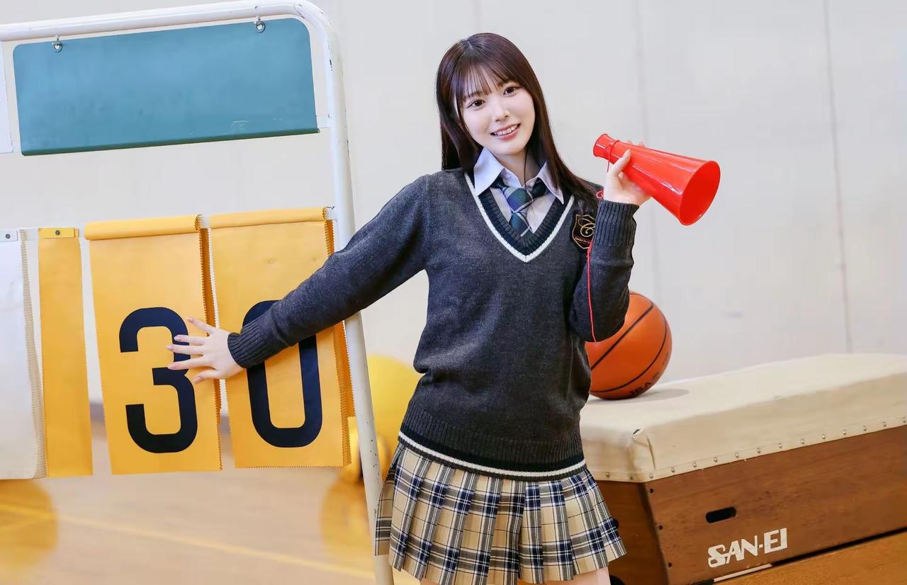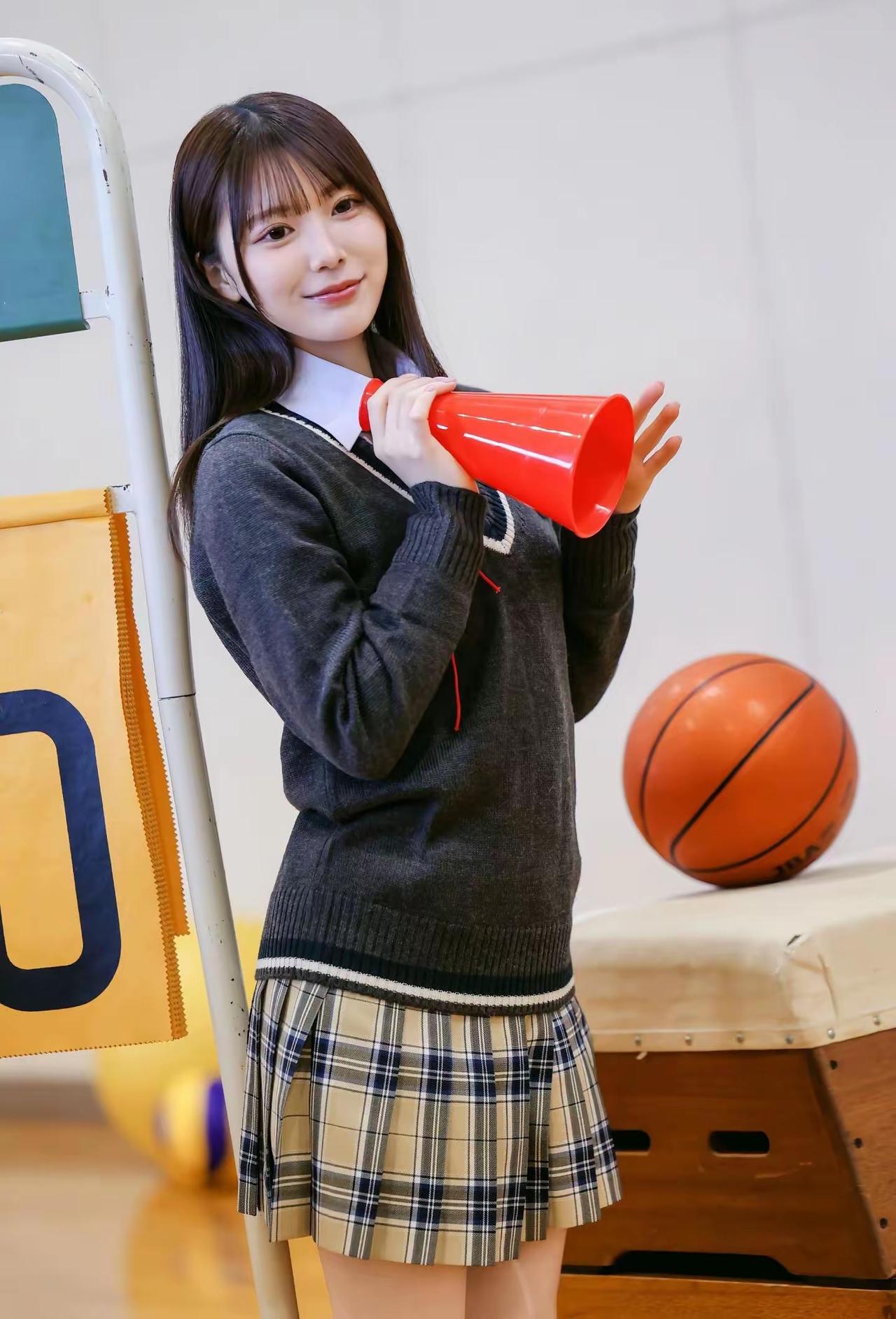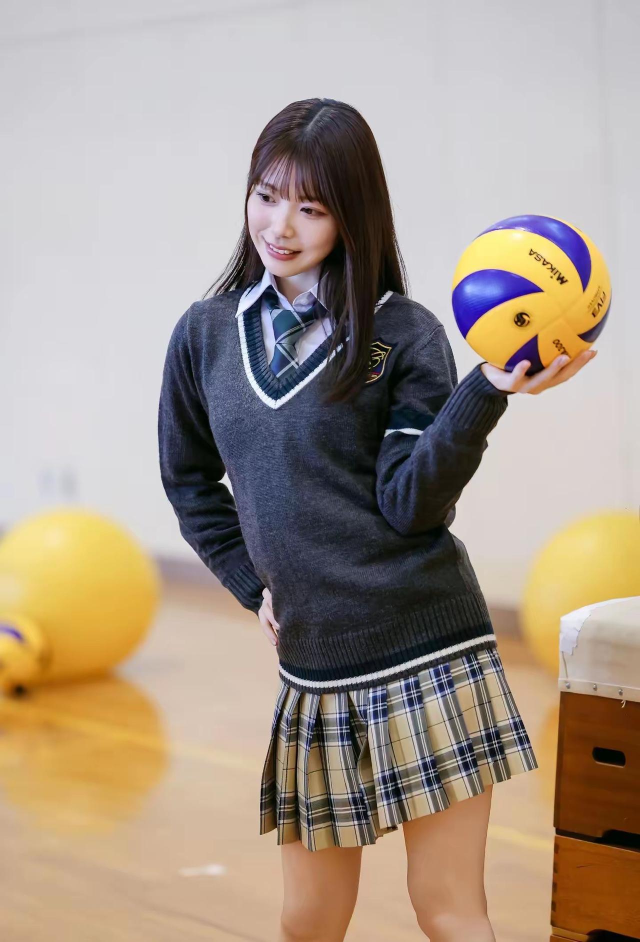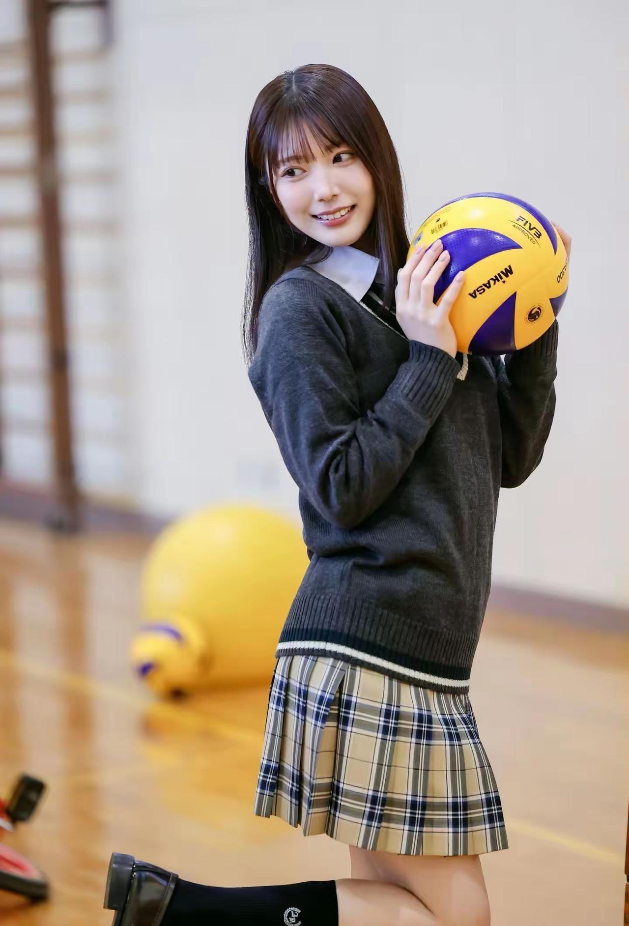 这姑娘在体育馆里抱着排球,笑得真甜!