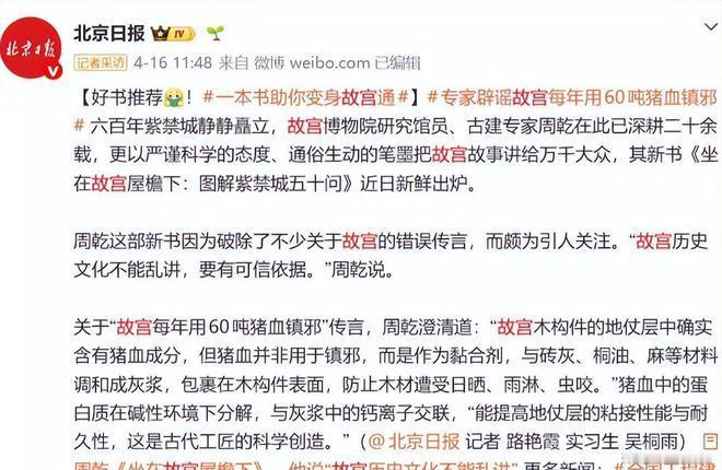 故宫里的猪血,到底在镇什么邪? 有人说皇家禁地果然不一般,有人说封建迷信就是根深蒂固,还有人煞有介事地分析风水原理。 可你有没有想过,一座保存了六百年的木结构建筑群,靠的如果真是猪血驱鬼,那才叫真正的奇迹? 故宫博物院研究馆员、古建专家周乾,在新书《坐在故宫屋檐下:图解紫禁城五十问》中。 正式对这一传言作出澄清。 故宫木构件的地仗层中确实含有猪血成分,但猪血并非用于镇邪,而是作为黏合剂。 与砖灰、桐油、麻等材料调和成灰浆,包裹在木构件表面,防止木材遭受日晒、雨淋、虫咬。 用料是真的,邪是假的。 那猪血到底是怎么用的?这事得从故宫的木头说起。 故宫是世界上最大的木制古建筑群,九百八十多座建筑的梁柱、斗拱这些核心构件,全都是木头做的。 木头最发愁的就是日晒雨淋、虫蛀潮湿,能稳稳撑六百年不烂。 全靠各种老祖宗传下来的防护工艺撑着,其中最基础的一步就是"地仗"。 地仗,说白了就是给木头穿的一件复合防护服。 彩画画在最外面,地仗藏在彩画底下,正是这套看不见的工艺,让太和殿的梁枋撑过了北京的夏雨冬霜。 血料由新鲜的猪血与石灰在常温下配制而成,配置过程包括三步。 先将猪血过筛,用丝瓜瓤或稻草用力搓揉,将血块搓成稀血浆,然后过铁纱网去掉血丝和杂质。 再将块状生石灰泼水调成净石灰水。 最后将石灰水倒入血浆中,边加边搅拌,使石灰与猪血中的蛋白质充分作用。 放置阴凉处两三小时,便制成色紫、粘稠状的血料。 工序并不神秘,几乎就是厨房里的化学。 但偏偏这个再朴素不过的配方,在木构件保护上有着现代化学材料到现在都难以完全复制的效果。 猪血中的蛋白质在碱性环境下分解。 与灰浆中的钙离子产生交联,将灰浆中的氢氧化钙、碳酸钙颗粒紧紧连接起来。 有利于提高地仗的粘接性能。 血红蛋白中羟基、氨基、羧基等活性官能团,可与灰浆材料形成防水的胶合键。 猪血中的血红蛋白既有亲水基又有亲油基,可在灰浆中形成网格结构,有利于地仗防裂。 同时,血料中的阴离子基团及亲水性基团,可以使灰浆颗粒之间产生静电排斥力。 有利于释放灰浆中的游离水,加快地仗干燥。 你还在想猪血驱鬼,老祖宗早已经在研究分子交联了。 那为什么非得用猪血,而不是牛羊血? 古人通过对比发现,猪作为杂食动物,血液中的油脂含量相较于牛羊这种食草动物的更高。 制成的地仗层黏性强、韧性好,而用牛羊的血做成的地仗层质地偏脆,粘接性就差很多。 这个发现没有任何文献记录具体是谁做出来的,但留下来了。 一代一代工匠用手指抹过去,用脊背扛过来,最后写进了清代《工程做法则例》。 经验就是这么来的,不靠玄学,靠失败。 猪血在漆器地仗中的使用可追溯至战国时期,在建筑地仗中的使用至少可追溯至秦咸阳宫。 咸阳宫遗址的地面就是用猪血、石灰等拌合抹成的,表面光滑、美观,还兼具防潮功能。 秦朝的地面放到今天挖出来,还能看出工艺痕迹。 那些连名字都没留下的工匠,比任何一个喊着"镇邪"的人都更懂猪血是什么东西。 故宫修缮时使用的最经典的"一麻五灰"工艺,工匠们会在木建筑表面依次涂抹砖灰、猪血和麻丝。 然后再反复叠加打磨,工序能多达十几道。 每道工序做完都要打磨,磨平了再涂,涂完再磨。 这种把时间和劳力往木头里填的做法,放到任何时代都算奢侈,而它的目的只有一个,让这座宫殿再多撑几百年。 这个工艺到了清后期才普遍推广,在清早期之前,故宫修缮时使用的是"净满地仗"。 主要以面粉和桐油为原料,虽然坚固耐用,但造价极高。 到了清朝后期,国库空虚,工匠们才借鉴了民间的土办法,改用廉价易得的猪血替代部分原料。 没想到这次无奈的改良,反而取得了意想不到的效果,猪血地仗不仅成本大幅降低,抗裂性能还优于以前的工艺。 财政紧张反而逼出了一个更好的配方。 皇家建筑的维修史,有时候比正史还有意思。 故宫修缮遵循"修旧如旧、保持原真性"的文物保护基本理念。 既要最大限度延长文物的寿命,又要尽量保存其历史、艺术价值,这就需要尽量使用传统的材料和工艺。 这不是故宫固执,是文物保护的基本逻辑。 你换了材料,你保护的还是原来那座宫殿吗? 参考信源: 澎湃新闻·辟谣"60吨猪血镇邪",这本新书满足你对故宫更多的好奇心 北京日报:故宫每年用60吨猪血"镇邪"?故宫博物院研究馆员周乾最新回应 腾讯新闻·故宫古建筑中猪血的科学运用