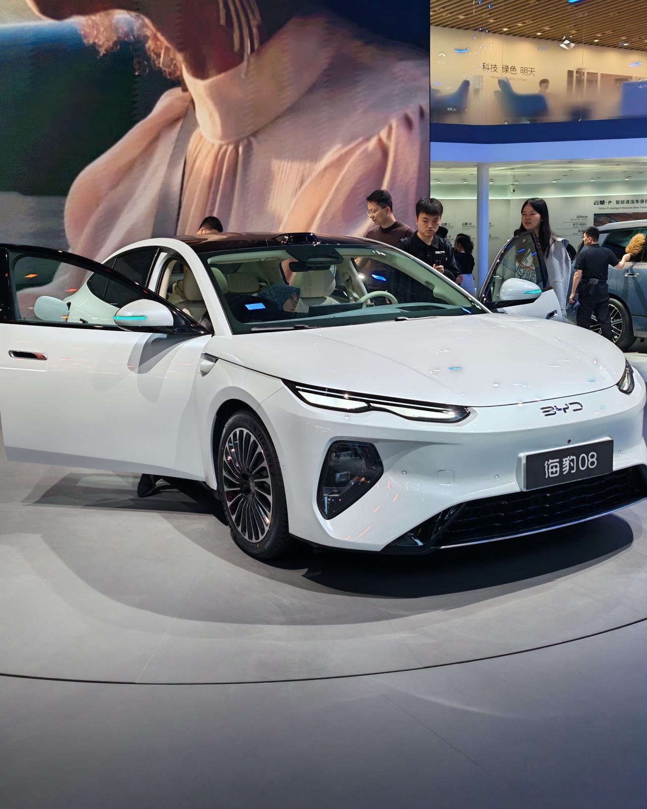 海洋的两款旗舰,对比王朝的同级车,感觉要更努力,更付出才行。 轿车的海豹08,有后轮转向。 今天公众日,已经人山人海。