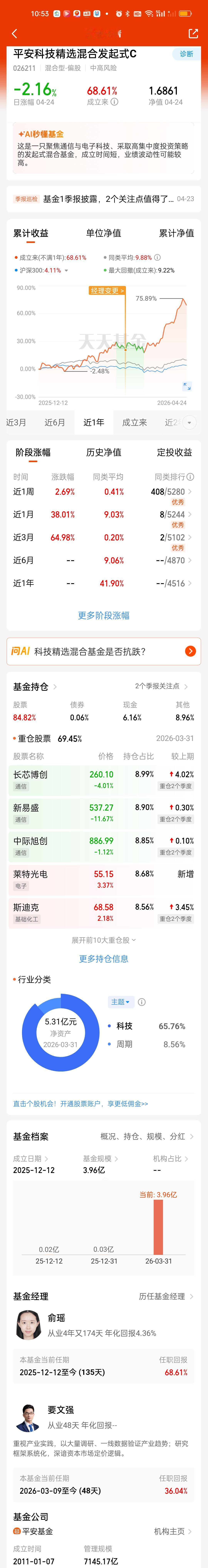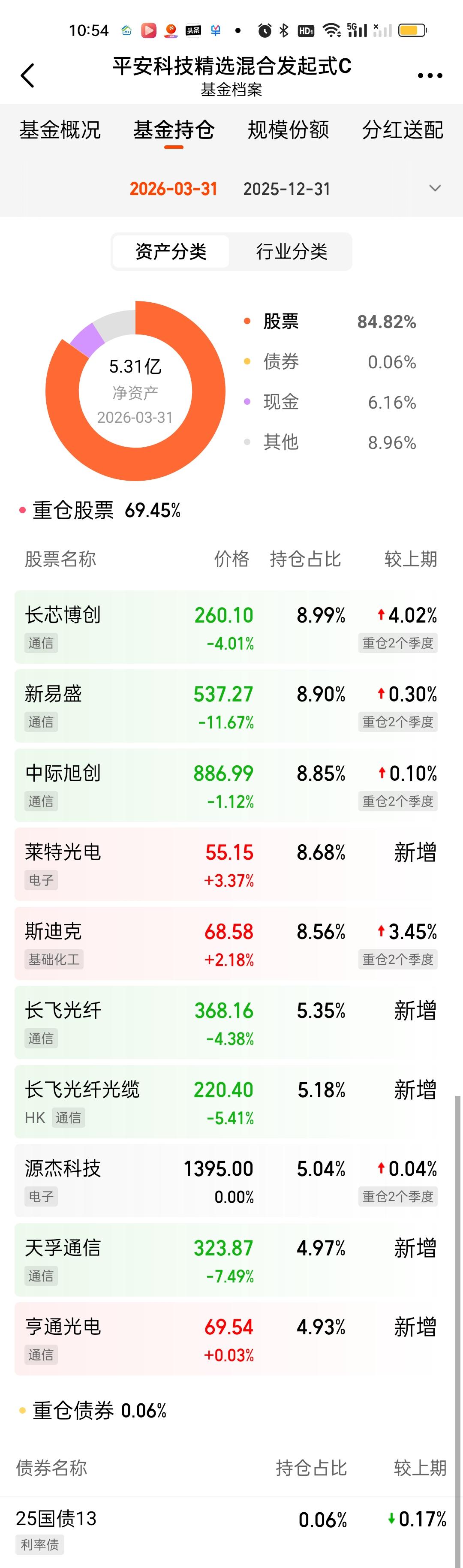 这是今年以来收益率排名第四,近3个月来收益排名第一的基金,2025年12月12日才成立,成立时间非常短,但表现足够惊艳。近3个月来收益率做到了夸张的65.17%。 这次调仓新增了5只个股,莱特光电,长飞光纤,长飞光纤光缆,天府通信,亨通光电。舍弃了景旺电子,菲利华,致尚科技,飞龙股份,光库科技。前十大重仓股占比从64.61%提升到了69.45%,提升了5%,此外大幅提升了长芯博创和斯迪克的持仓占比。长芯博创从上个季度的第八重仓股一下子升到了第一重仓股,上个季度排名第五的斯迪克尽管仓位提升了3.45%,但依旧保持第五不变。