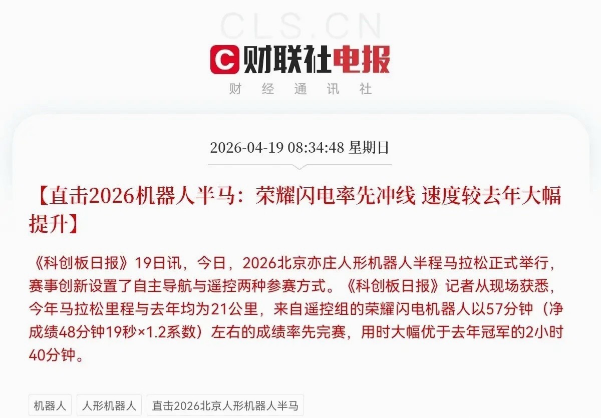 利好!周末大利好!这个方向明日有望起飞了,满仓这个方向的可以期待大爆发了吧…上午8点34分,《科创日报》最新消息,2026年北京亦庄人形机器人半程马拉松又传来了振奋人心的大利好消息,来自荣耀闪电机器人以净成绩48分19秒闪电速度冲线了,用时大幅优于去年冠军的2小时40分,人形机器人运动性能又实现了跨越式提升,这对于人形机器人产业链又是一大标志性事件,大利好消息呀荣耀“闪电”的成绩证明了国产人形机器人在运动性能上的突破,这将带会动产业链上下游的技术迭代,尤其是核心零部件环节的国产替代进程,受益公司有望迎来爆发式发展了,这些优质公司有望受益了绿的谐波、双传环动、中大力德、汇川技术、鸣志电器、步科股份、埃斯顿、新时达、合川科技、三花智控、拓普集团、亿纬锂能等