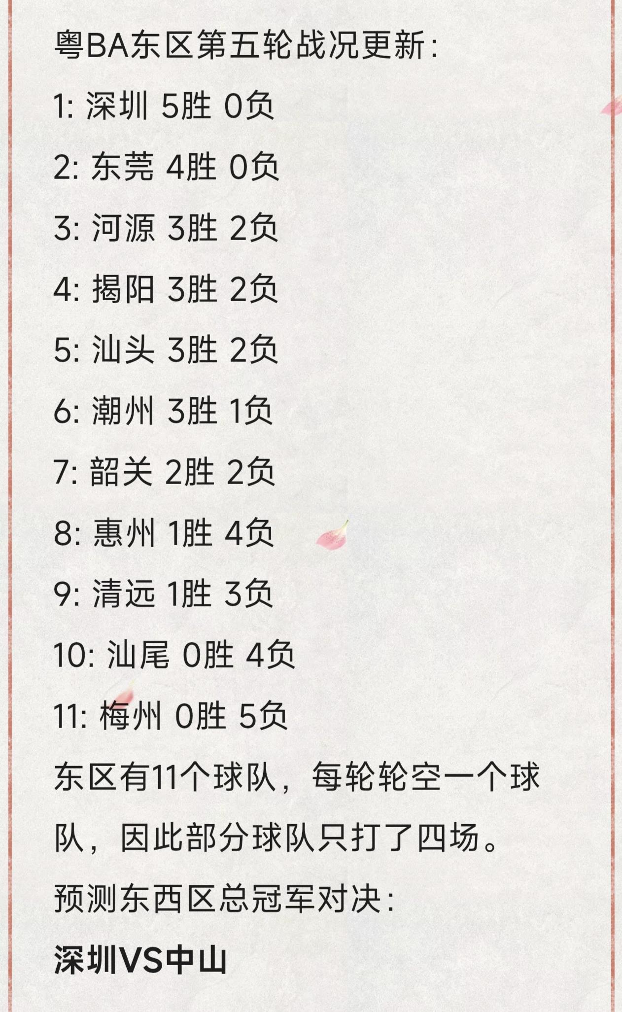 粤BA东区第五轮战况更新: 1: 深圳 5胜 0负 2: 东莞 4胜 0负 3: 河源 3胜 2负 4: 揭阳 3胜 2负 5: 汕头 3胜 2负 6: 潮州 3胜 1负 7: 韶关 2胜 2负 8: 惠州 1胜 4负 9: 清远 1胜 3负 10: 汕尾 0胜 4负 11: 梅州 0胜 5负 东区有11个球队,每轮轮空一个球队,因此部分球队只打了四场。 预测东西区总冠军对决: 深圳VS中山