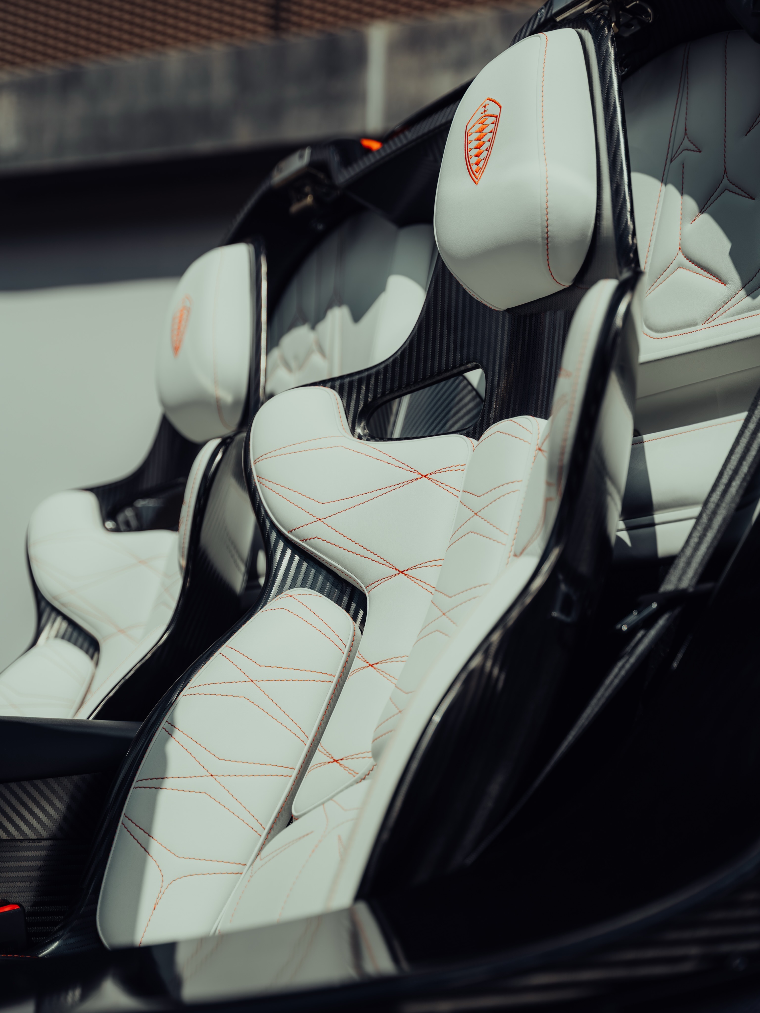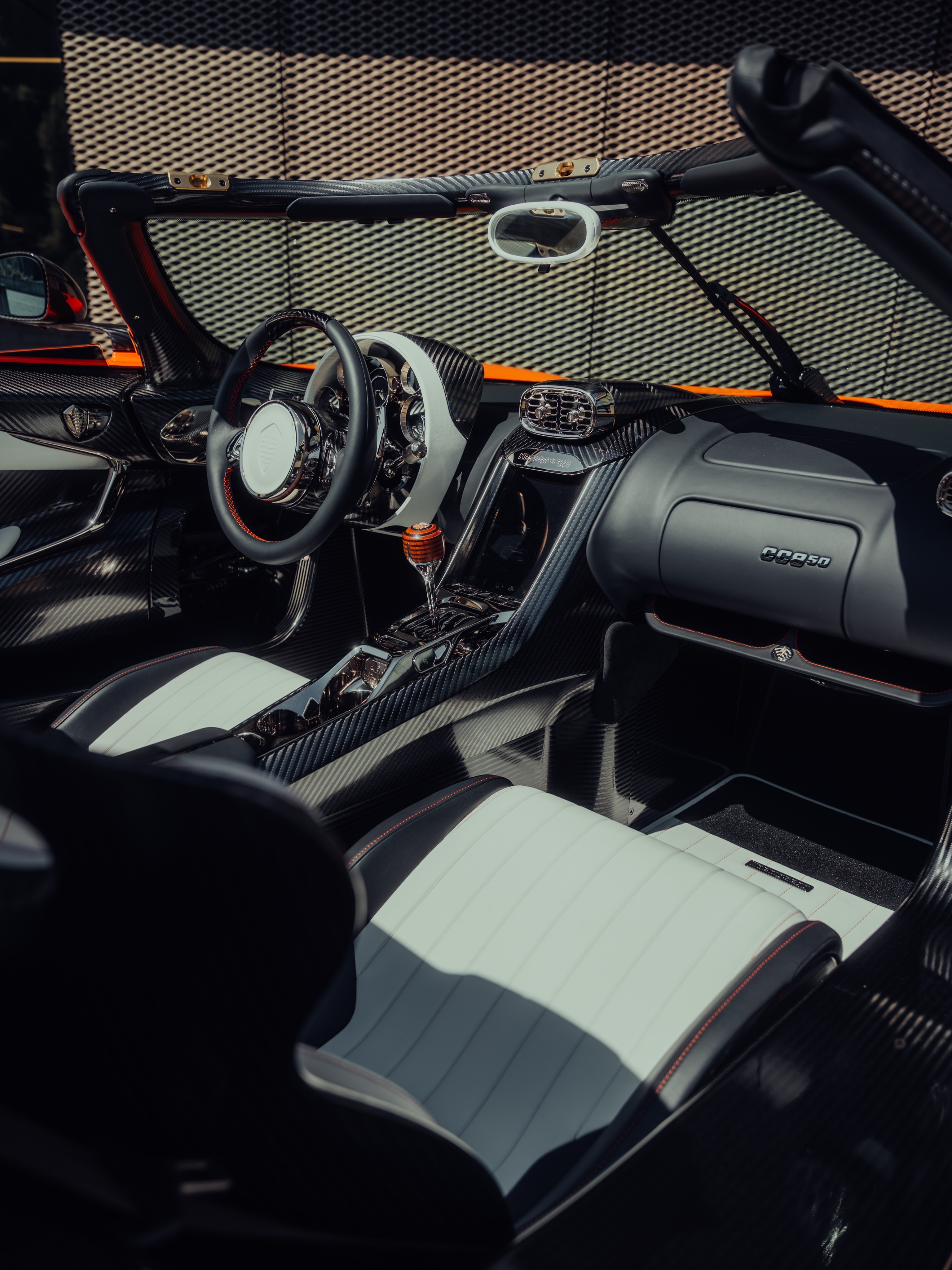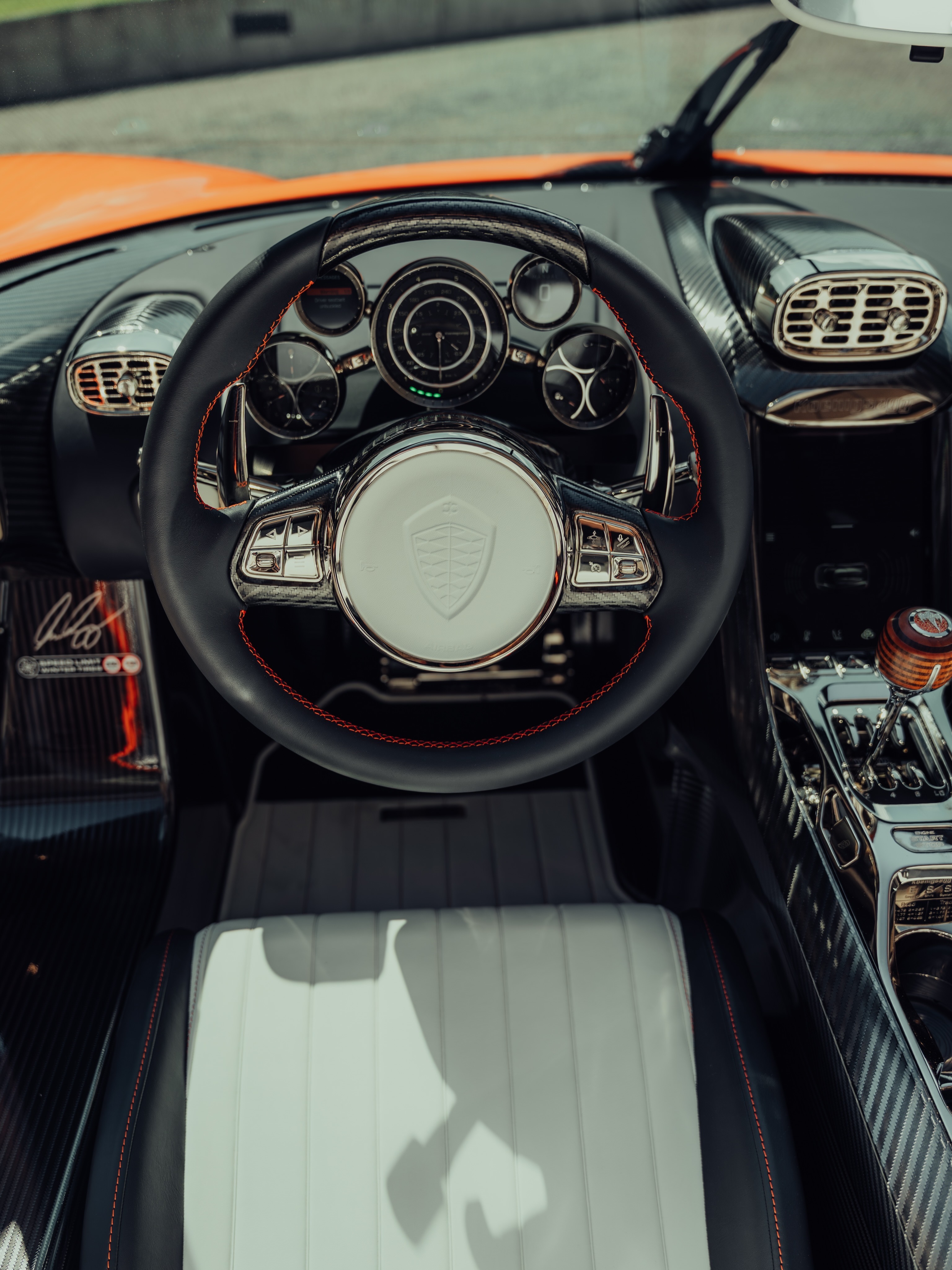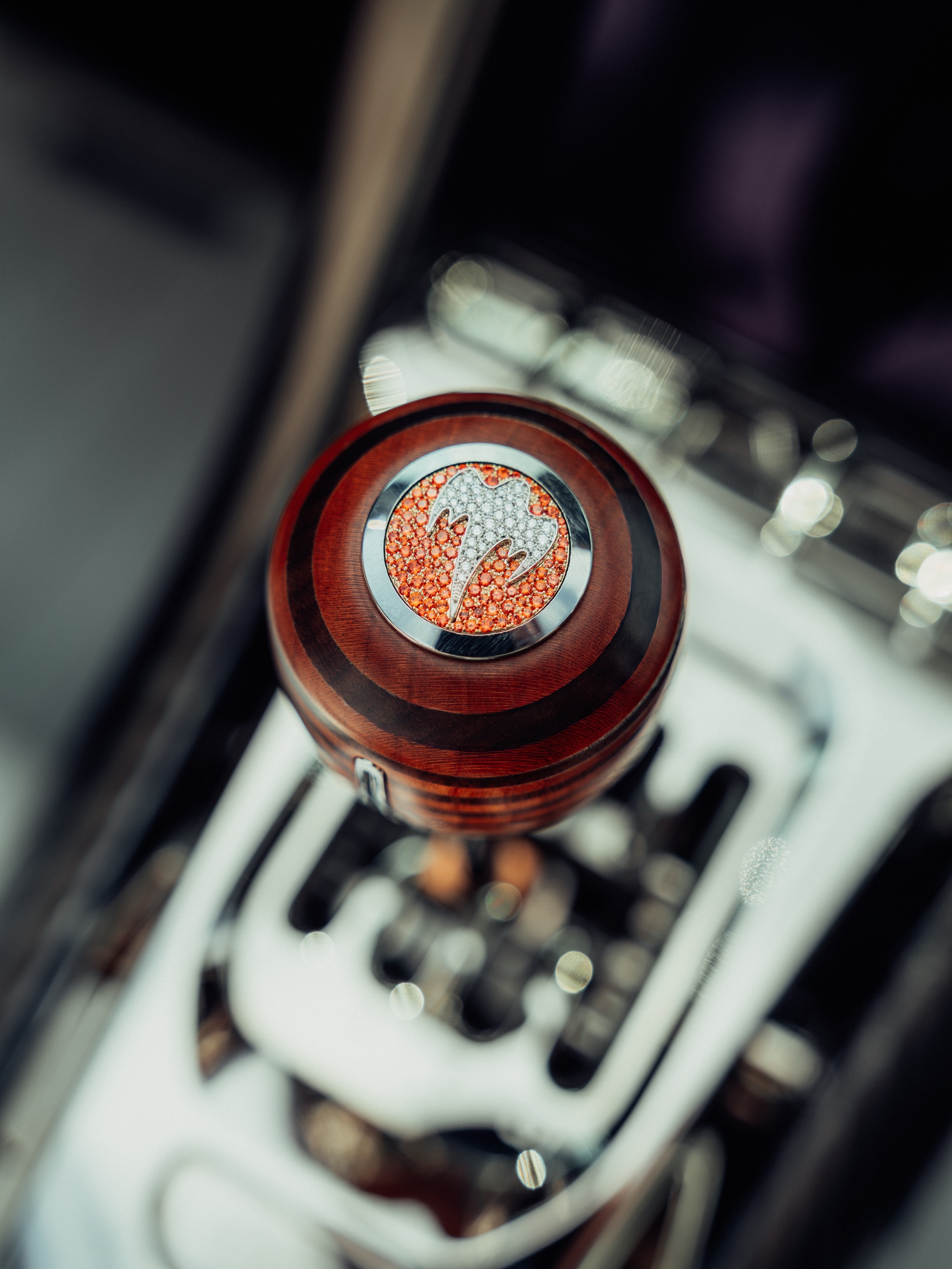 94颗定制切割的橙色蓝宝石,与熔岩橙外观车漆完美匹配,各自独立成型,镶嵌于18K黄金之中。中央,41颗DEF VS+级钻石组成科尼赛克幽灵标志,环绕于铂金基座。
