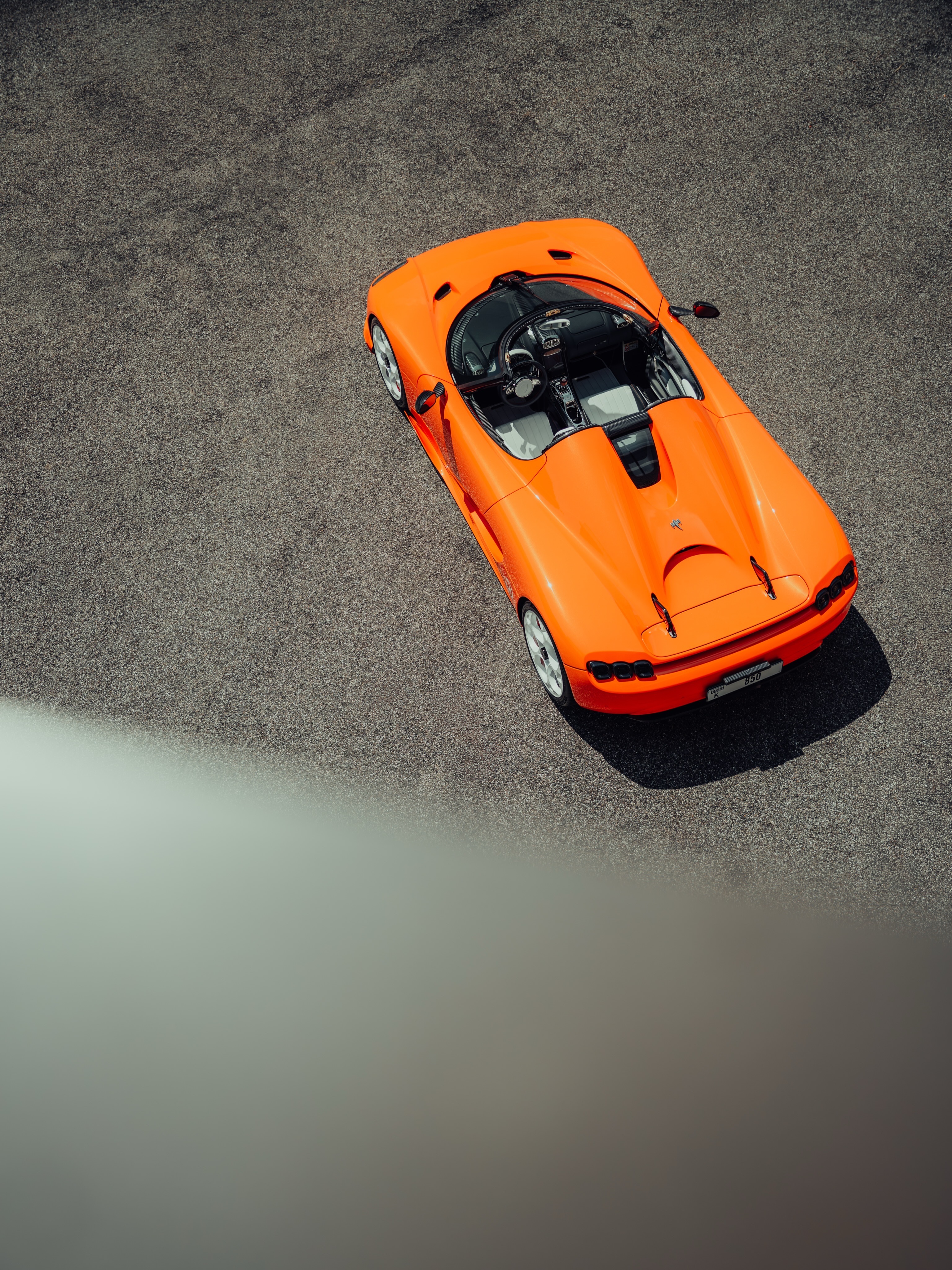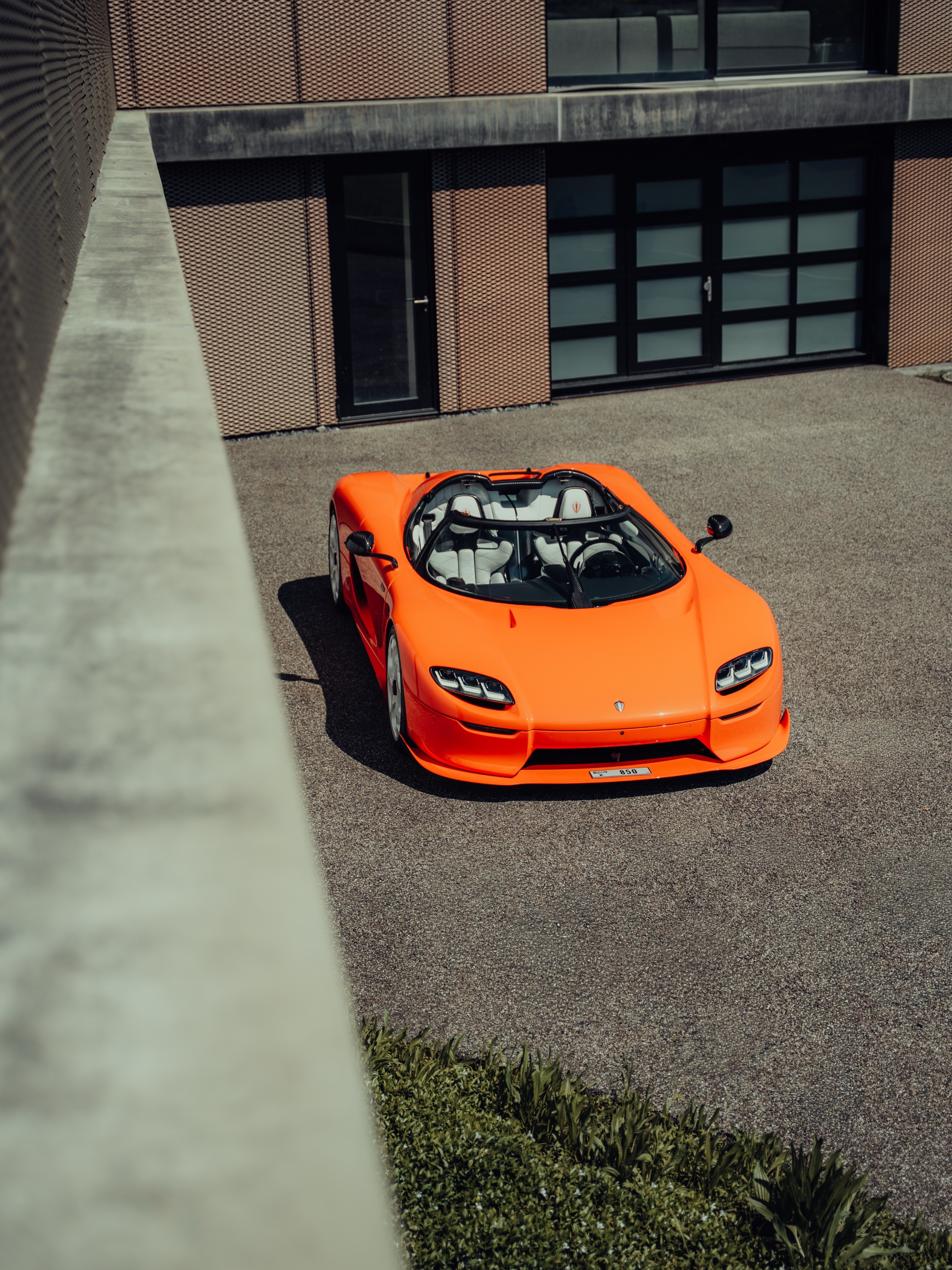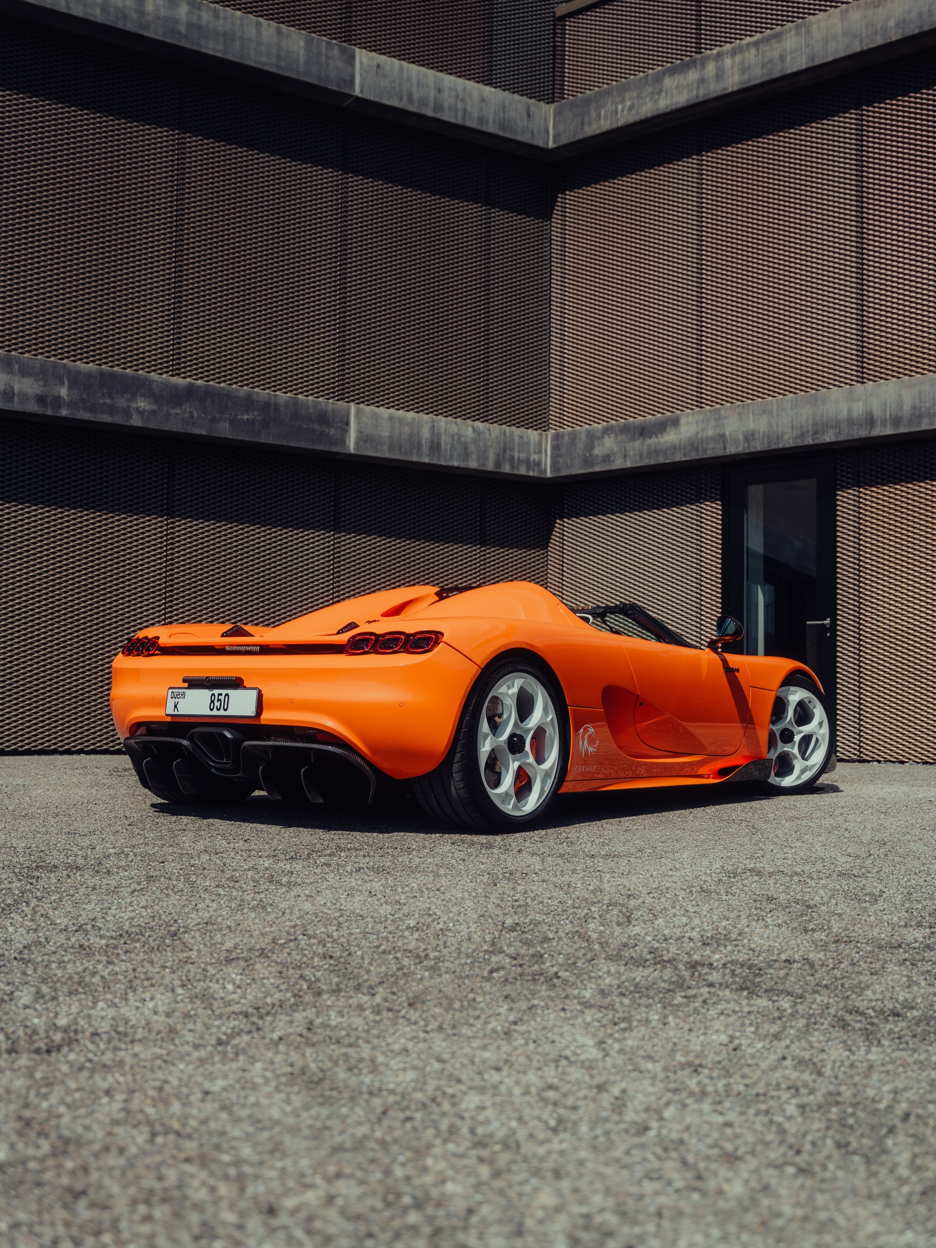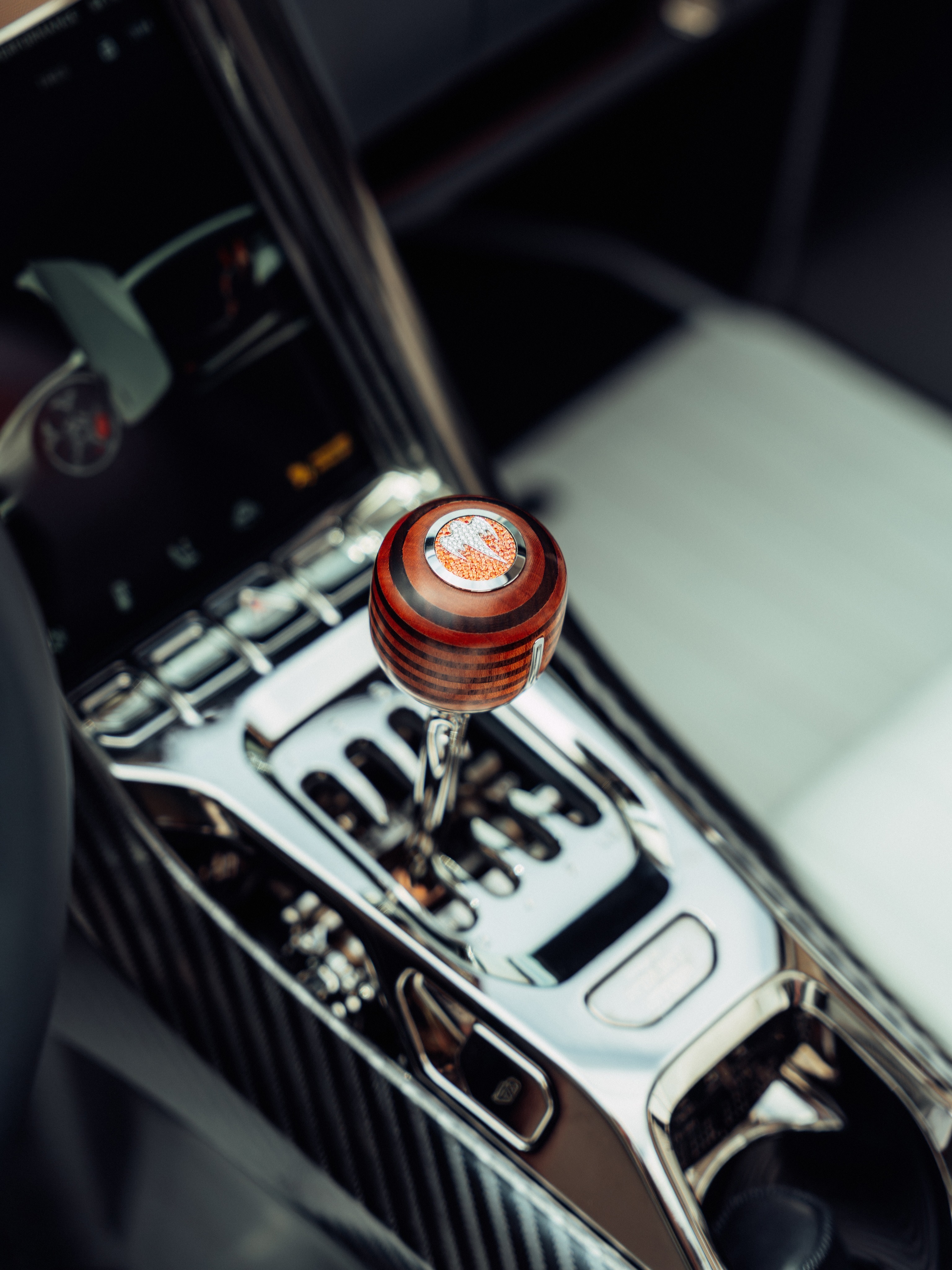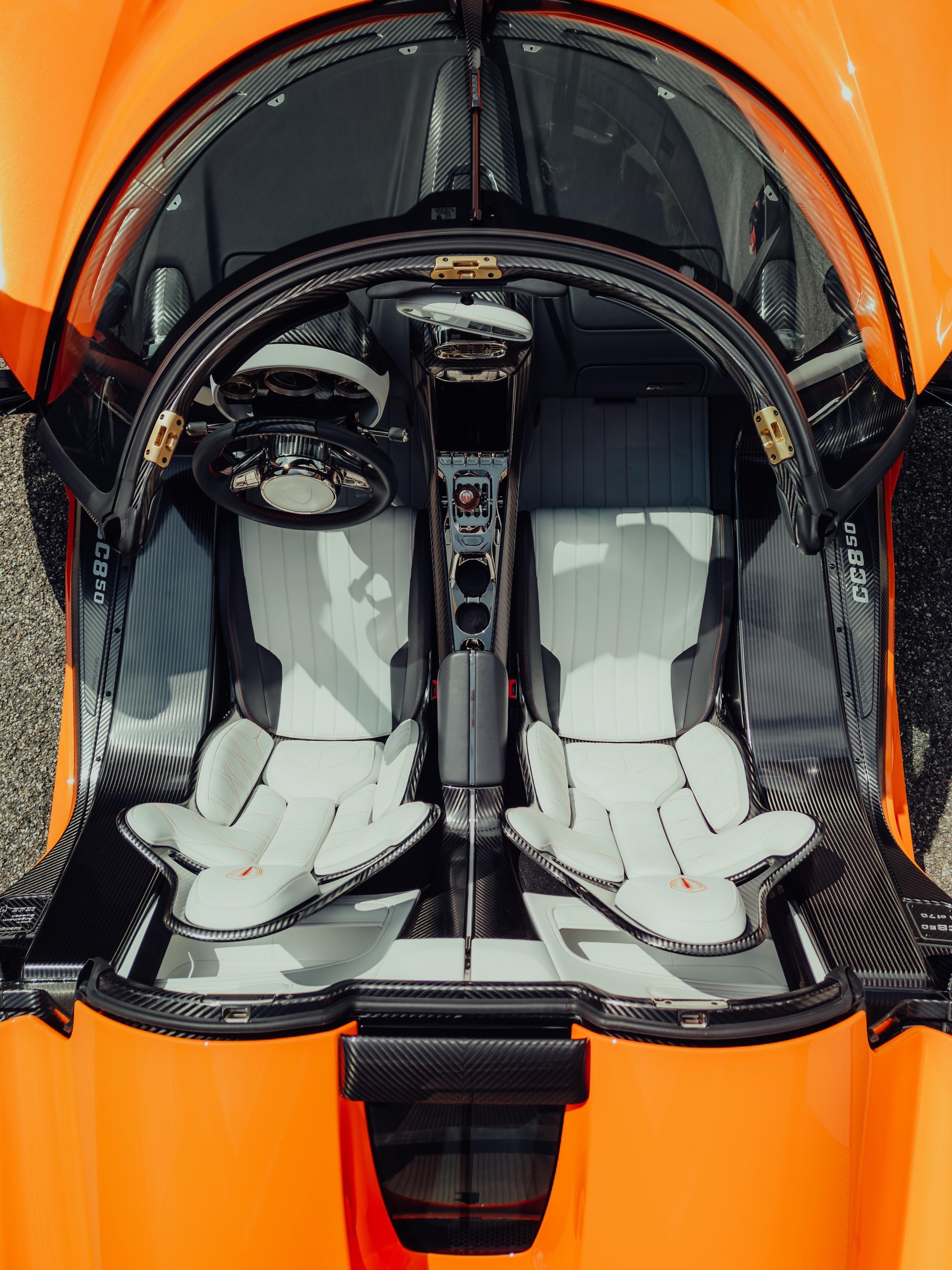 94颗定制切割的橙色蓝宝石,与熔岩橙外观车漆完美匹配,各自独立成型,镶嵌于18K黄金之中。中央,41颗DEF VS+级钻石组成科尼赛克幽灵标志,环绕于铂金基座。
