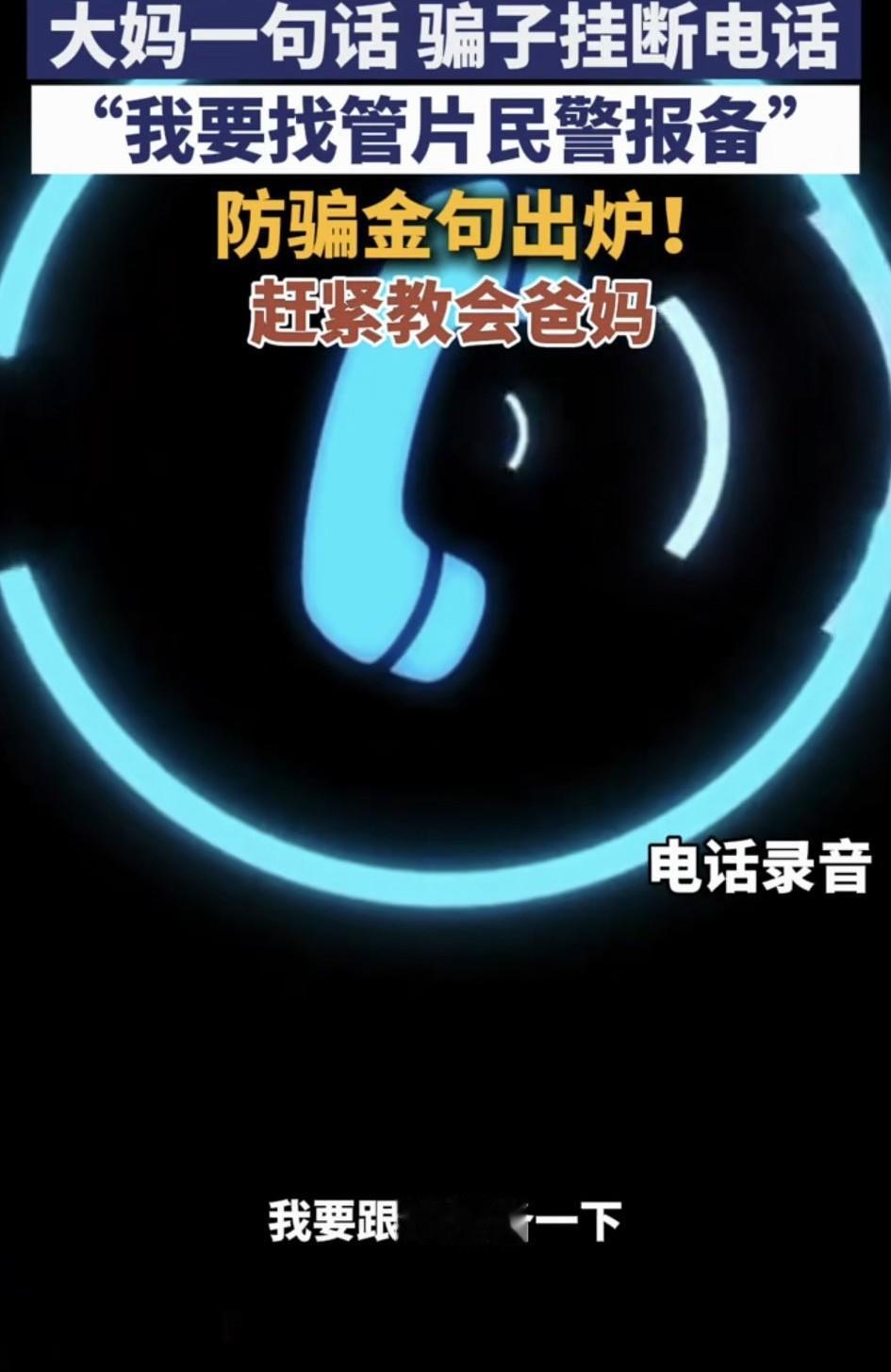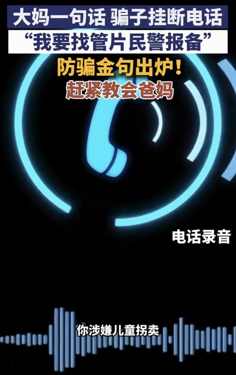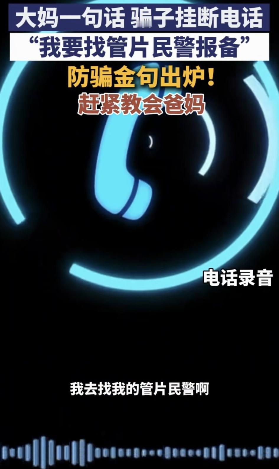 北京一大妈,接到骗子有名有姓冒充市公安局刑侦队警察的诈骗电话,说是大妈涉嫌“拐卖儿童”,还要求她带证件和换洗衣物到市局接受调查,那严肃的态度和语气,愣是把人糊弄得有些迷糊。不料大妈却一点都没慌,反倒是冷静应对,最后提出要找管片民警报备安全后,直接让骗子气急败坏的挂断了电话。 曝光的语音中,骗子自称是北京市局刑侦队队员“赵东来”,这个名字瞬间让人想起来电视剧“人民的名义”中的人物角色。当然,骗子除了名字像外,这语气和态度也是将“赵东来”的气质拿捏到了极致。 骗子称,大妈尾号为0040的身份证存在违规登记情况,要求立即到市局301室处理。还语气强硬的说,今天过来之后人肯定回不去,还需带上换洗衣物。 而骗子这番心理拿捏,一般老人估计都被吓到了,但大妈心理素质很好,她先是质疑身份证未离开过自己,怎么可能出现这些情况,也拒绝提供私人电话。 接着骗子心理战升级,直接警告大妈如果不配合调查,就是在挑衅公安机关!对此大妈依然不慌,她语气平和的对骗子说,要先向片区民警报备安全,并询问骗子知不知道片区民警是谁? 正是大妈一番反诈教科书式的反应和回答,愣是让骗子彻底破防,并恼羞成怒威胁了大妈一句“不要挑衅公安机关”,便匆匆挂断了电话。 对此有网友就表示:就这种诈骗电话,我反手就是一个小艺接听,让他和小艺掰扯去!当然大妈的反应值得大家学习。 还有网友表示:网上学了一招,打开手机免提声,用一个不锈钢盆照在手机上,然后用一根木棍连续敲打发出的声音,让对方听到老实为止[大笑] 也有网友提醒:接到这种诈骗电话,不要逗着玩,应该马上挂断,如果通话时间长了,这些诈骗团伙,可能用高科技盗取你的手机重要信息哦。 不得不说,骗子很嚣张演技更是糊弄人,但大妈很冷静,应对得非常巧妙绝伦!一句“我要找片区民警报备”更是让骗子猝不及防。这教科书式的反诈应对,赶紧教会家中老人吧!