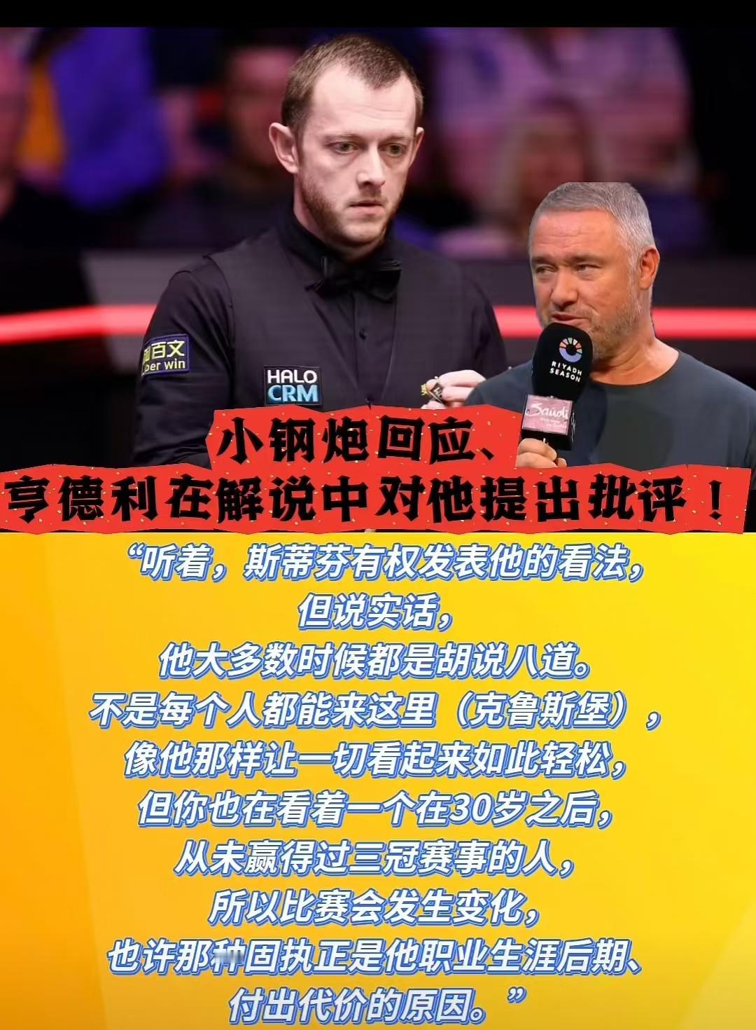 赢了世界第二凯伦威尔逊,小钢炮艾伦信心爆棚说,我还没有开始提速。 这是艾伦第6次闯入克鲁斯堡8强,他下一轮的对手是老鹰霍金斯。 在对阵凯伦威尔逊一战中,艾伦确实赢得比较轻松,完全控制比赛节奏,让凯伦退无可退,只能冒险拼长台,而艾伦等着捡漏就可以。张安达说和艾伦打很不舒服,自己完全没有上手的机会,就算上手了也不好打,满眼就是糟糕的球型。 艾伦说自己没有提速,应该针对准度和围球,目前还没到达自己的最高点,还可以提升。 台球皇帝亨得利坐上了主播台,批评艾伦打的太过保守。当时艾伦以5-1领先,却放弃了一杆打进中袋粉球的机会,选择防守。亨得利说,都领先这么多了,还这么保守,真的让人看不懂。这样的方式不足以获得世锦赛冠军。 赛后艾伦猛烈回击亨得利,说亨得利根本不懂球,完全是胡说八道。说亨得利30岁之后,就没拿到过大赛冠军,足以证明他的观点落伍了。 亨得利的老派进攻流,艾伦的现代防守流哪一个正确呢?