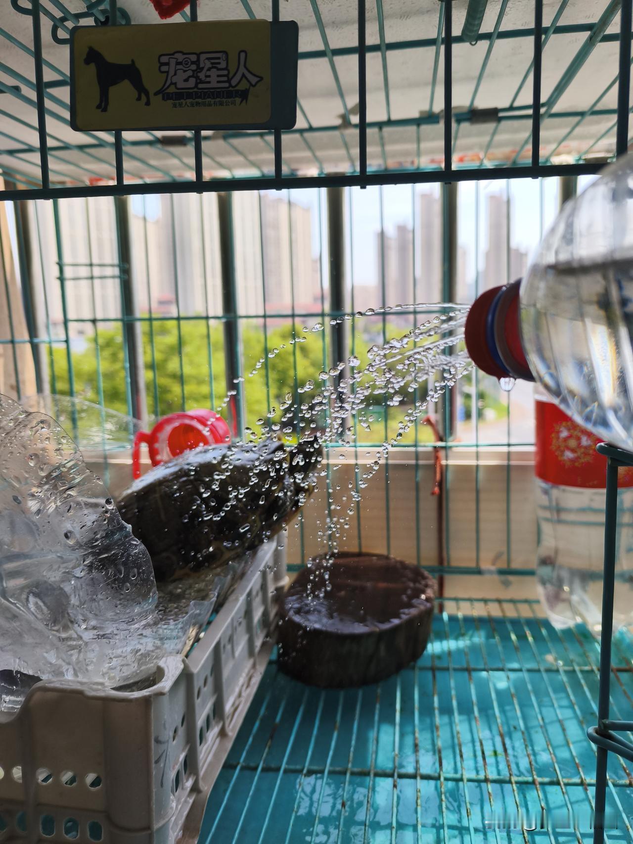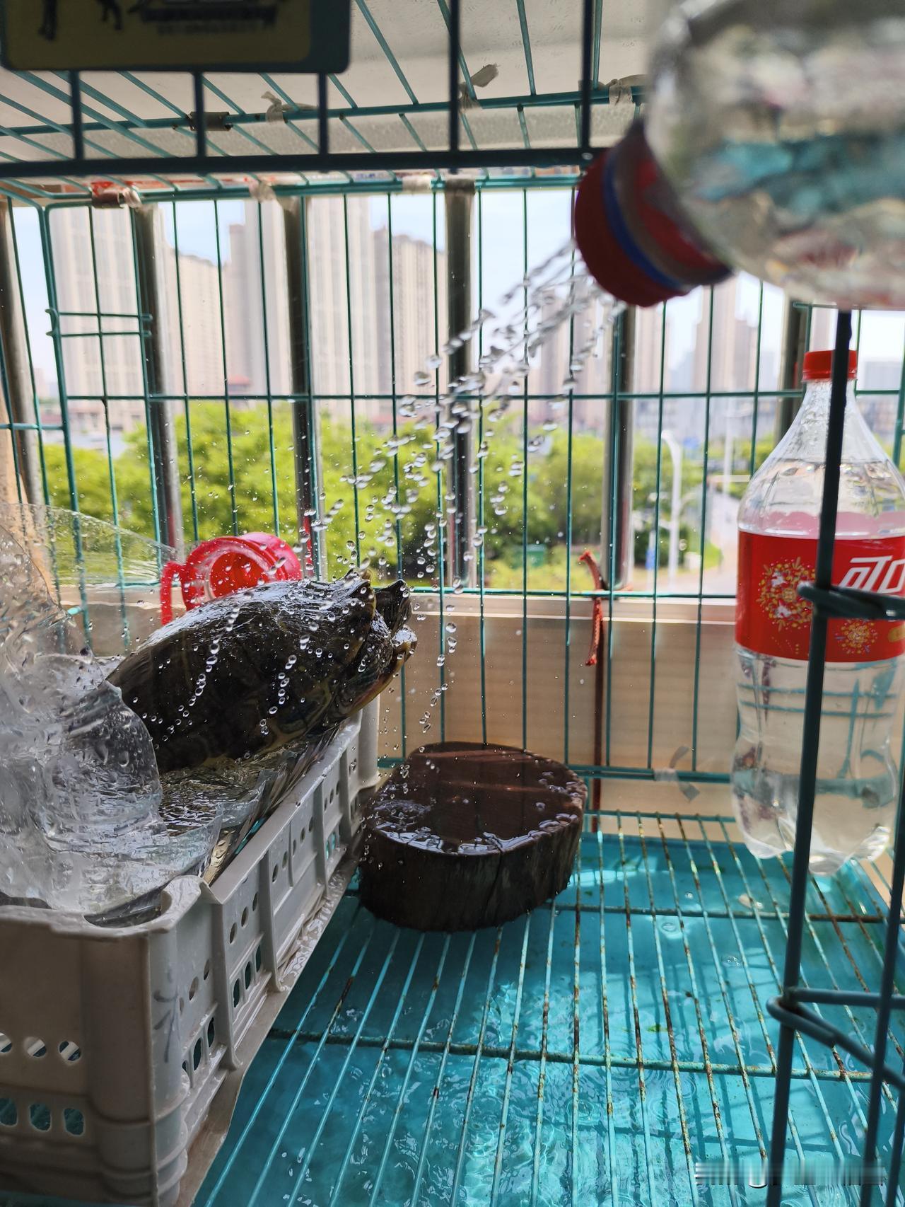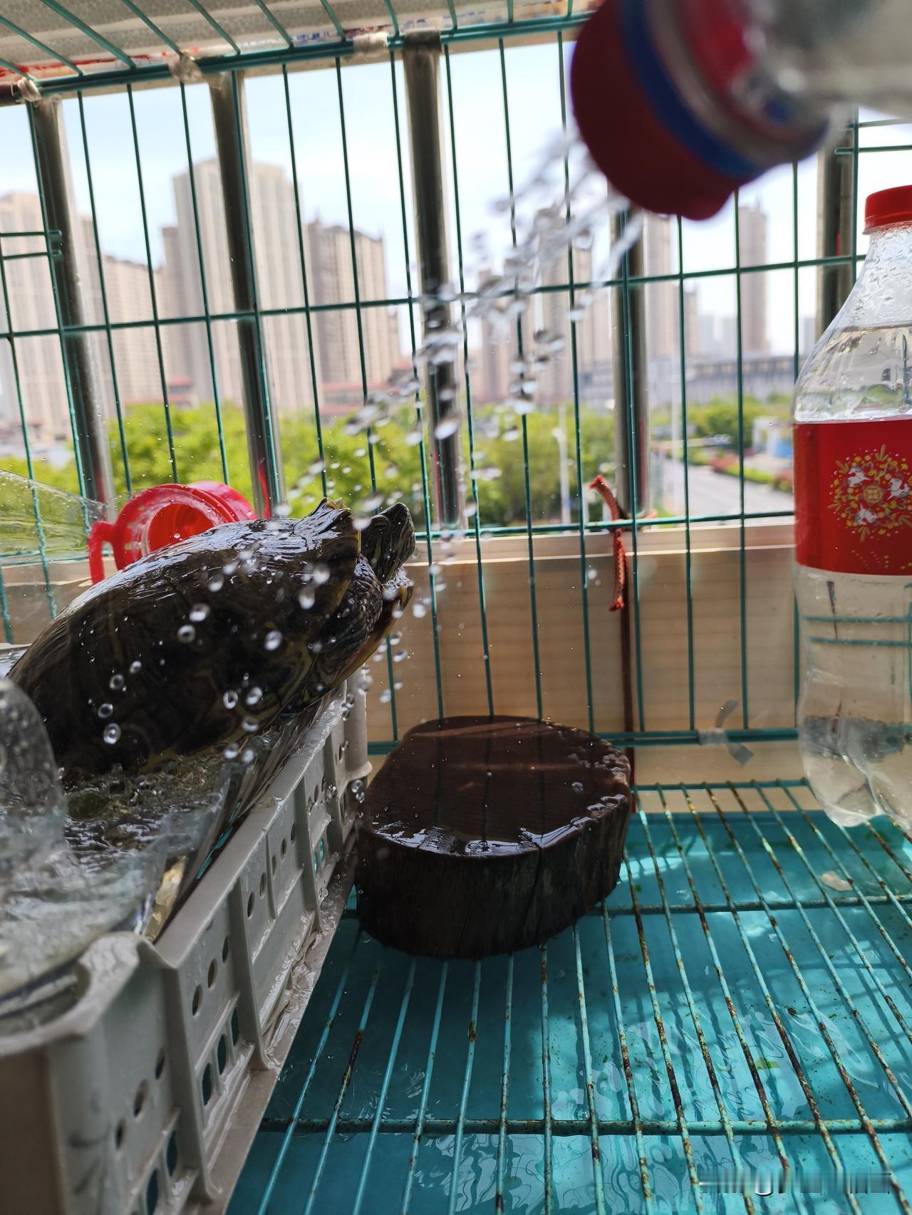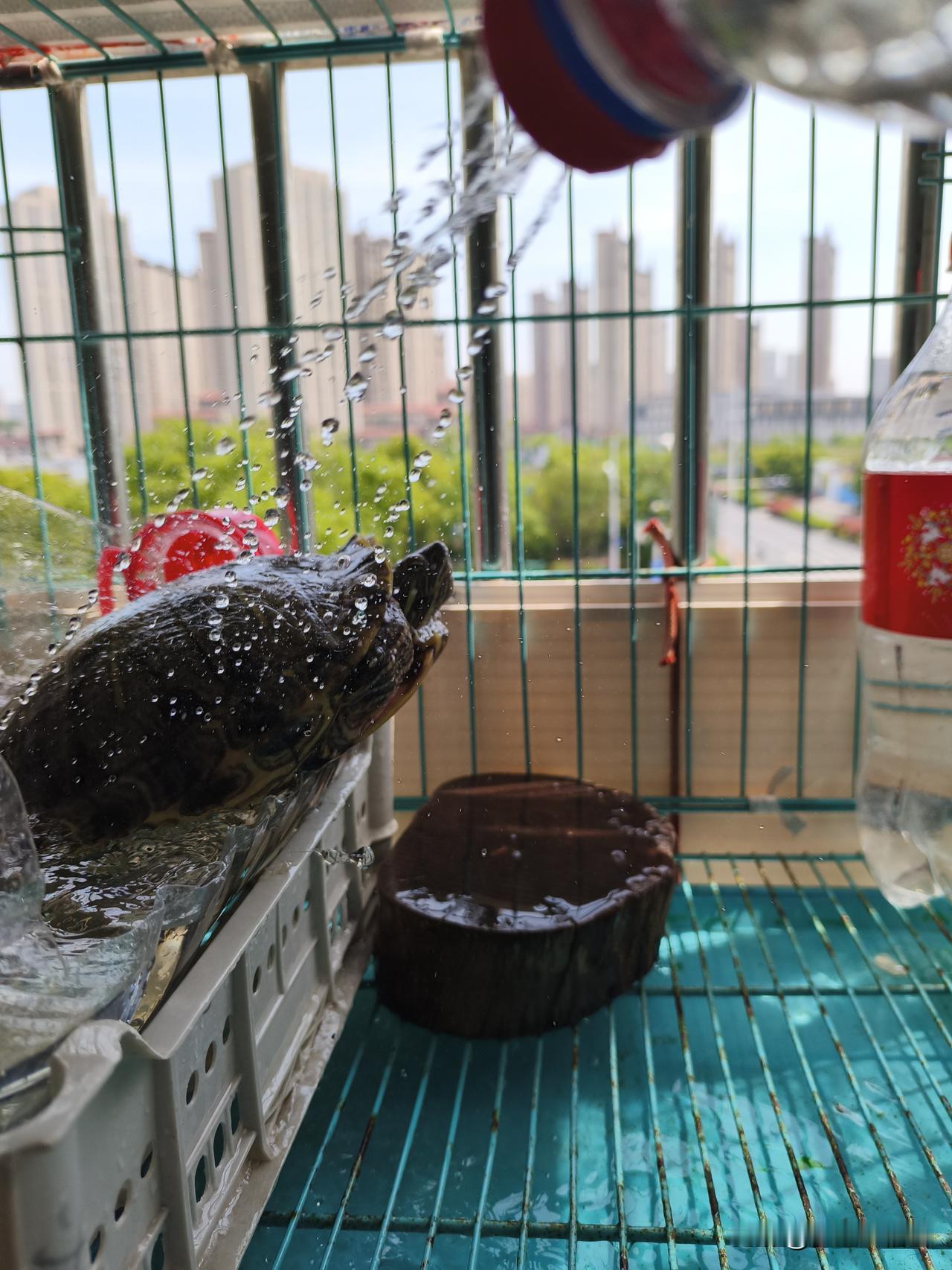 我家龟每天日常就是如此:早上放水池吃食、排便后再放到阳台防盗窗上的“天然游泳池”