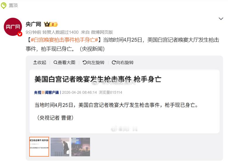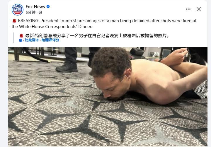 川普分享了一名男子在白宫记者晚宴上被枪击后被拘留的照片。(from fox)据央视:当地时间4月25日,美国白宫记者晚宴大厅发生枪击事件,枪手现已身亡。