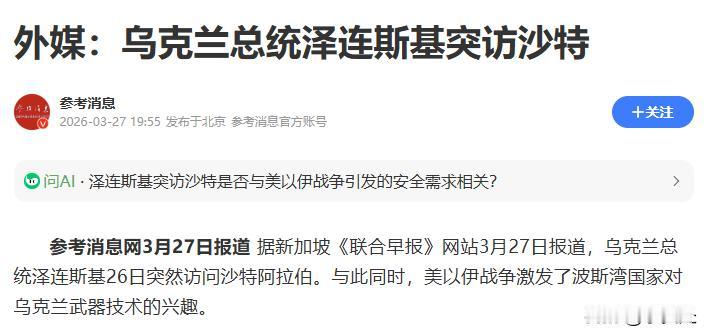 泽连斯基突访沙特,不是外交作秀,是算账。 沙特的痛点很清楚:伊朗无人机成本几万美元,沙特用“爱国者”拦截,一发400万美元。长期这么耗,国库受不了。乌克兰恰好是全球反无人机经验最丰富的国家,单次拦截成本仅约2000美元。据3月26日签署的防务协议,沙特出钱,乌克兰出技术和人力,十年协议价值“数十亿美元”。划算。 能源通道是另一条线。之前霍尔木兹被伊朗实质性封锁,沙特每日550万桶原油出口受阻。重启东西管道至红海只是第一步,土耳其还想修一条经叙利亚到地中海的陆路油管。但叙利亚控制在朱拉尼手里,埃尔多安能否摆平?俄罗斯不希望沙特石油经黑海运往乌克兰。美国两边下注。僵住了。 谁能破局? 唯一能同时对话沙特、土耳其、俄罗斯、乌克兰、欧洲、美国的国家——东大。东大是沙特和土耳其最大贸易伙伴,是俄罗斯的战略协作伙伴,与乌克兰有长期合作,和美国保持沟通。谁给得多、给得长远,东大就帮谁。 泽连斯基这步棋走得聪明,但一个人下不完。要打通这条从波斯湾经红海到地中海的能源新动脉,得有人坐上所有牌桌。