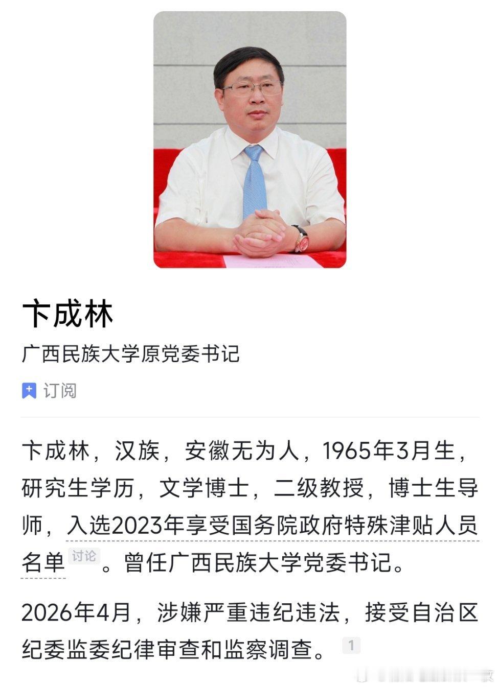 广西民族大学原党委书记卞成林接受纪律审查和监察调查。