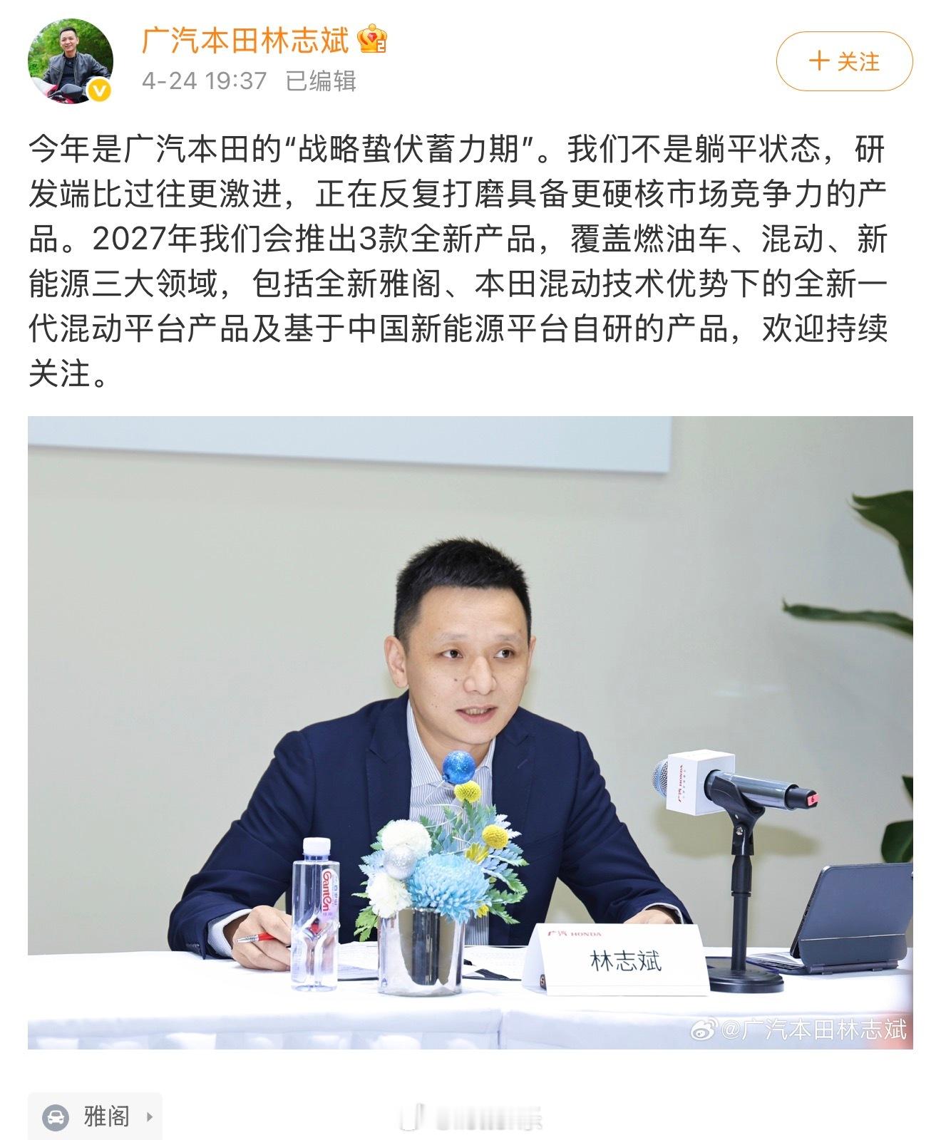 我们之前熟悉的广本到底在今年会有什么动作?官方释疑来了:广汽本田林志斌说,今年是广汽本田的“战略蛰伏蓄力期”,但绝不是躺平,其实研发端比过往更激进,正在反复打磨具备更硬核市场竞争力的产品。划重点:2027年会推出3款全新产品,覆盖燃油车、混动、新能源三大领域,包括全新雅阁、本田混动技术优势下的全新一代混动平台产品及基于中国新能源平台自研的产品,期待了!