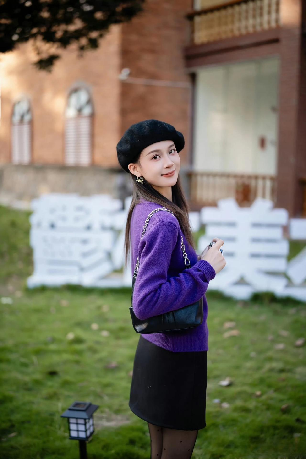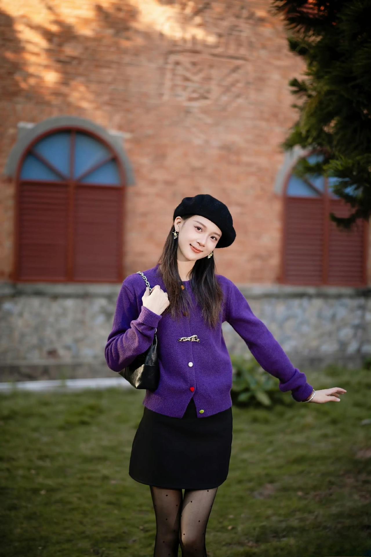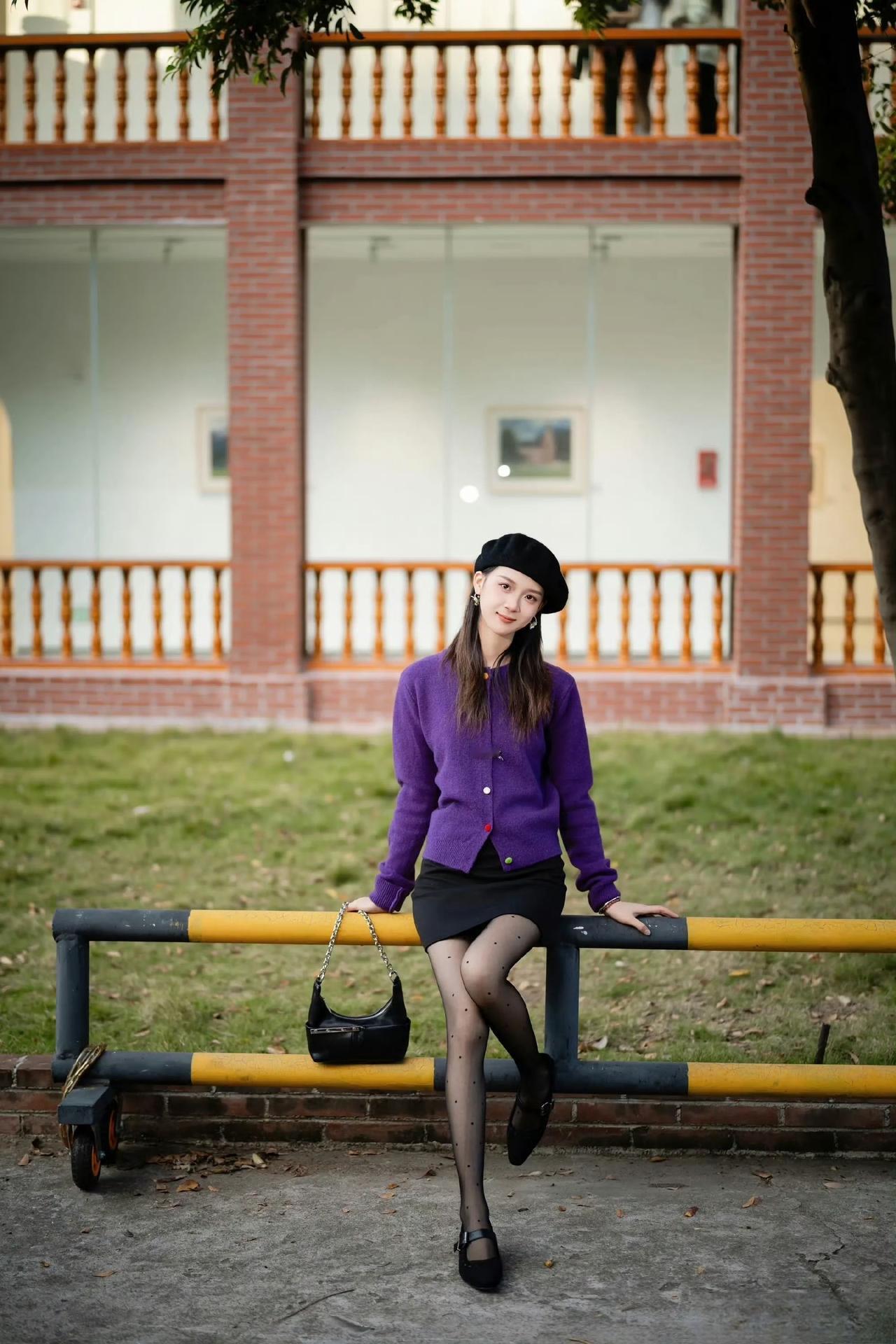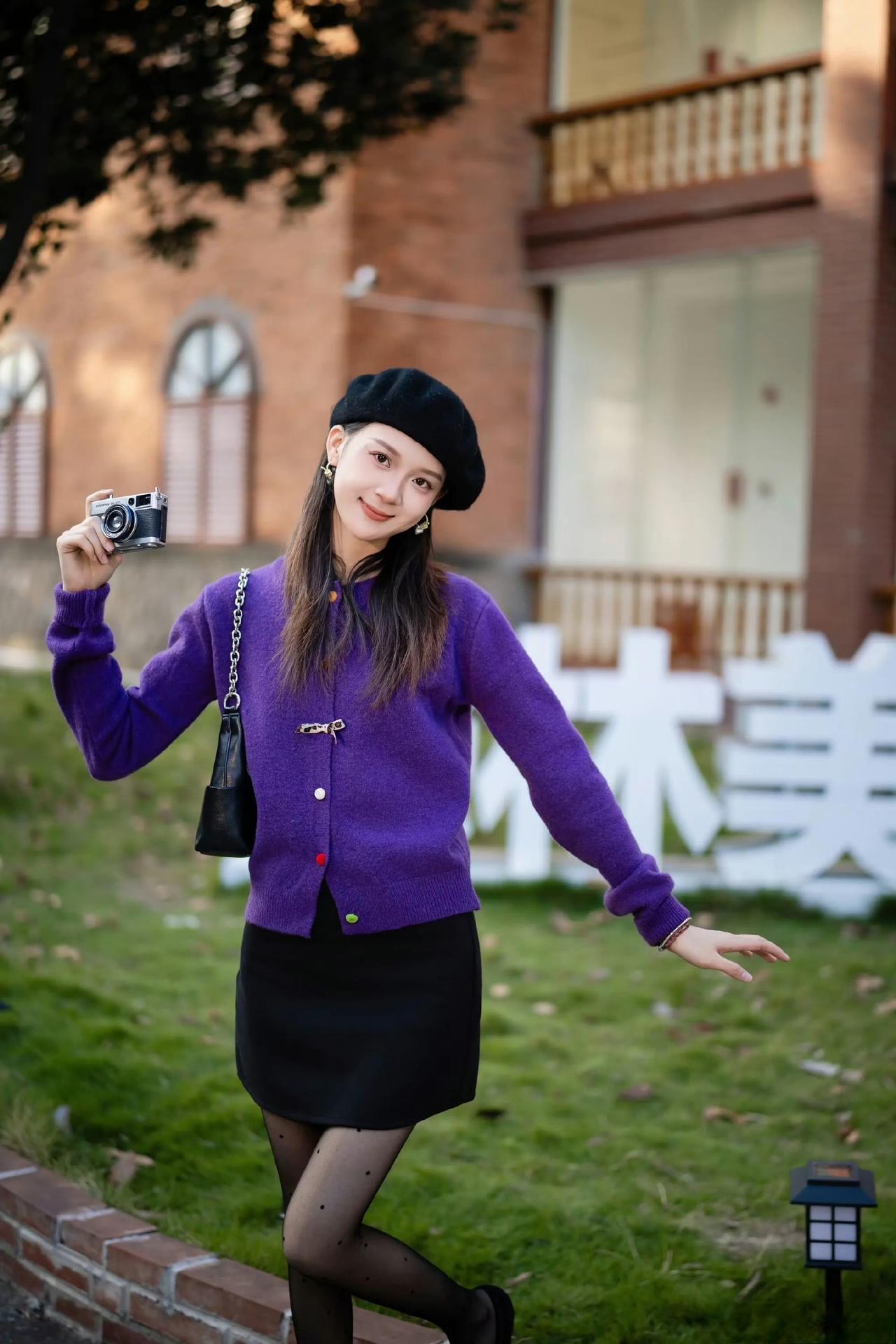 这套是“复古甜酷的撞色”穿搭,高饱和紫+经典配饰很有记忆点: - 上衣选了亮紫色针织开衫,高饱和色调自带吸睛属性,小纽扣+徽章细节增加复古感; - 下装搭黑色短裙,黑裙平衡了紫色的明艳,强化甜酷细节; - 配饰用贝雷帽+黑色小包+乐福鞋,贝雷帽是复古标配,黑包和乐福鞋统一色调,让撞色造型更协调。 这种“高饱和上衣+经典黑下装+复古配饰”的组合,很适合复古建筑打卡或轻约会,亮眼又有风格。撞色高级感穿搭 香芋紫撞色上衣 女生如何穿搭看起来时尚更有品味呢