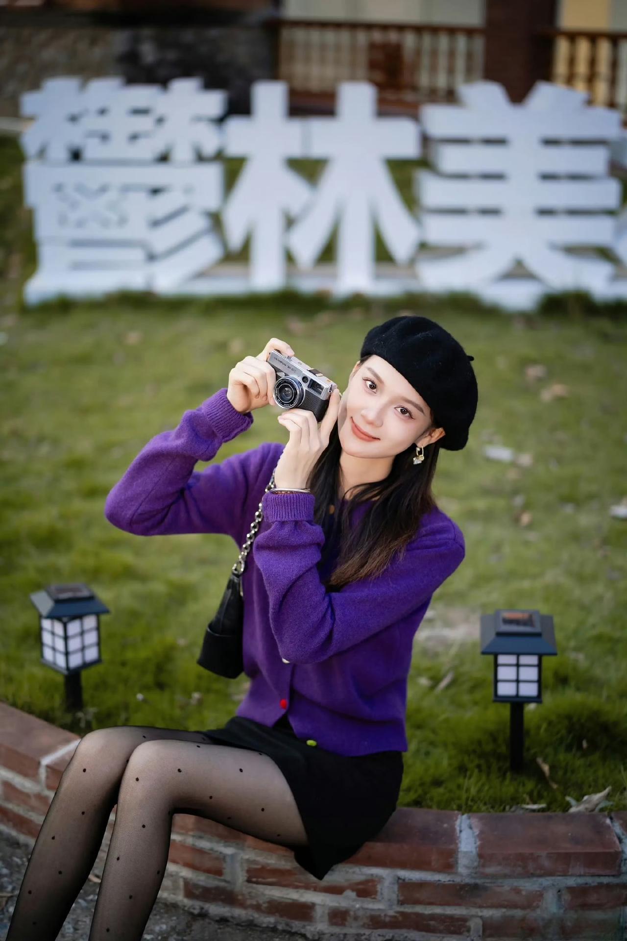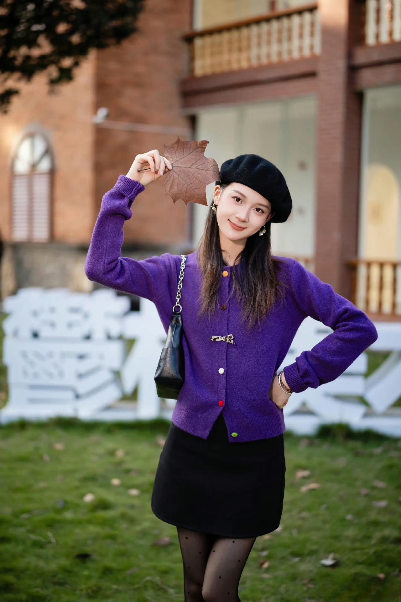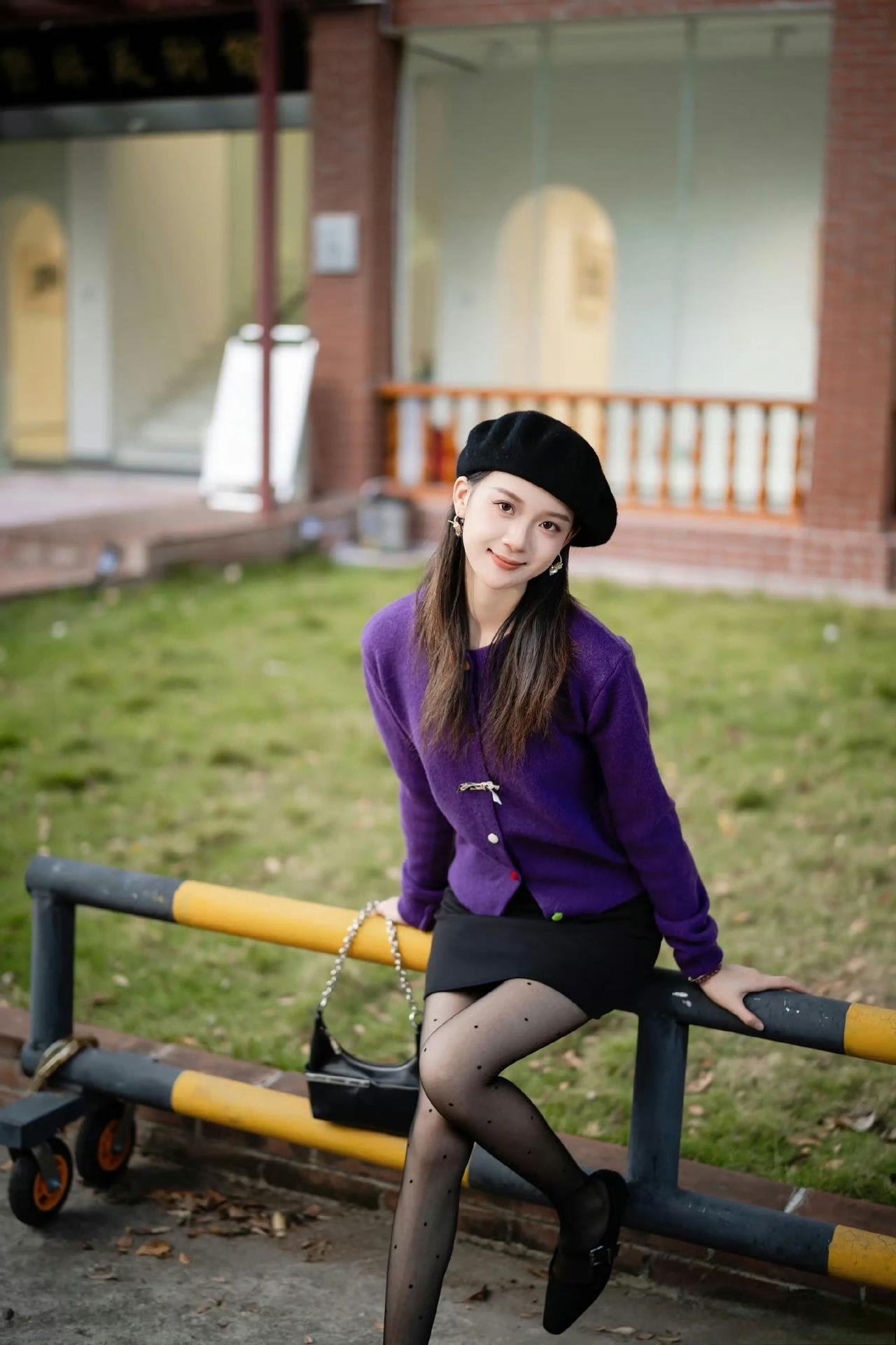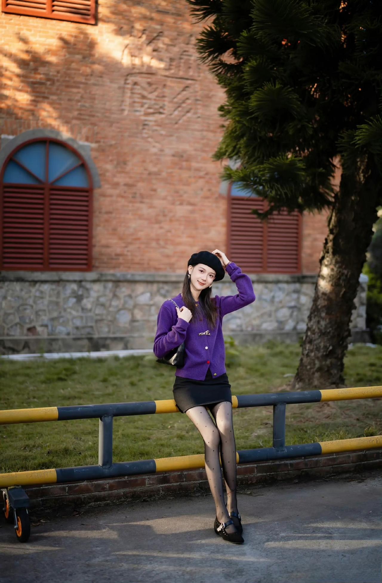 这套是“复古甜酷的撞色”穿搭,高饱和紫+经典配饰很有记忆点: - 上衣选了亮紫色针织开衫,高饱和色调自带吸睛属性,小纽扣+徽章细节增加复古感; - 下装搭黑色短裙,黑裙平衡了紫色的明艳,强化甜酷细节; - 配饰用贝雷帽+黑色小包+乐福鞋,贝雷帽是复古标配,黑包和乐福鞋统一色调,让撞色造型更协调。 这种“高饱和上衣+经典黑下装+复古配饰”的组合,很适合复古建筑打卡或轻约会,亮眼又有风格。撞色高级感穿搭 香芋紫撞色上衣 女生如何穿搭看起来时尚更有品味呢