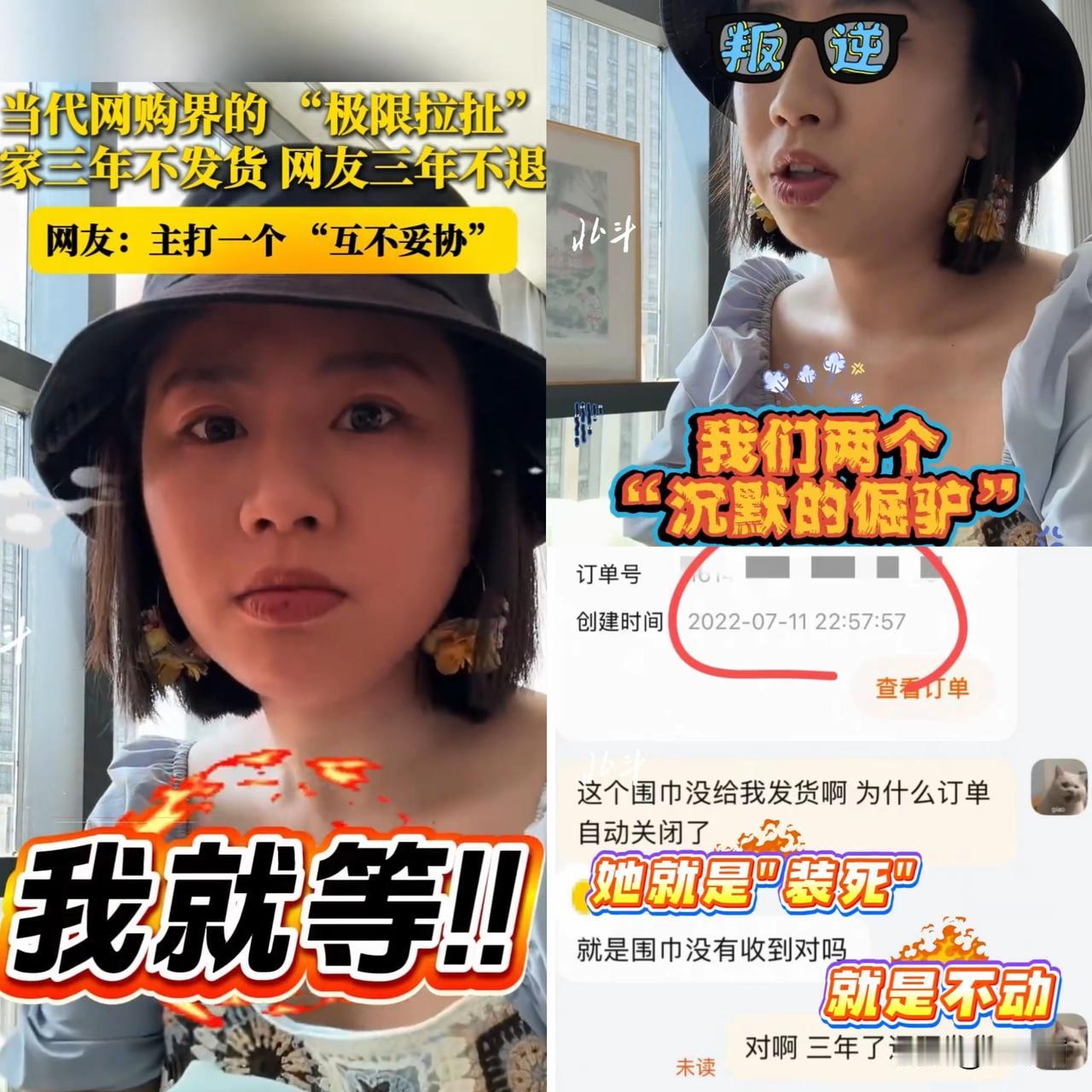 看谁犟得过谁?”女子网购了一条围巾,商家就是不发货,没想到女子也是犟,愣是坚持不退款,就等发货,这一等就是3年。 女子三年前下单付款,商家迟迟不发货,一次次找理由推脱,到最后干脆直接装死不回复。 换做普通人,大概率早就无奈退款了事,但这位小姐姐偏不将就。在她眼里,这件事早就和169块钱没有关系,争的就是一口气,是消费者本该拥有的基本权益。你执意耍赖不发货,那我就坚决不退款,看看到底谁更犟。 网友说: 发生过,找平台他帮你退款,我要退款不会自己操作吗,还用找你,没地讲理,直接换购物平台。 平台都有订单超过72小时就罚款规则,一直不发货拖一天就每天一直罚款!如果不能按时发货店家都会打电话沟通,拖3年不发货店家脑袋进水了? 这种事网购多如牛毛,低价引流刷单,然后各种理由不发货。平台无做为,最多就是退款了事,但你浪费了时间精力,他却没付出一点代价,这种情况平台应该罚他三倍退款。 我前几天买了一颗花卉,满心期待着收货。接到信息冒着雨夹雪的天去驿站,拿到手的却是一卷塑料袋,找客服她告诉我给五星好评就给退款,你说气人不,没办法找平台介入了,才给退的钱。 估计就是根本就没货,空手赚流量,我还遇到下单后有物流,看着快到了,物流有自动的回去了,还说物流搞错了,叫我申请退款。晒图笔记记大赛