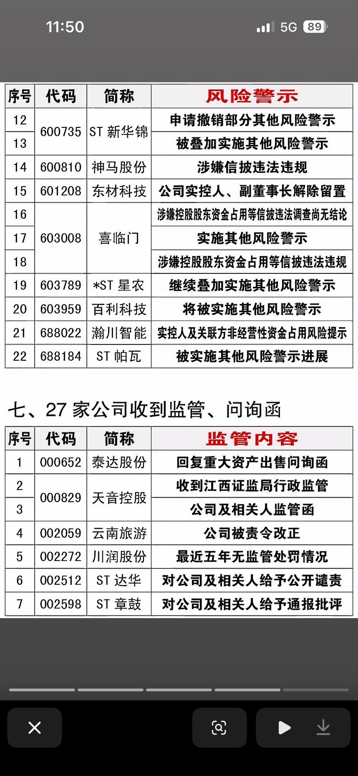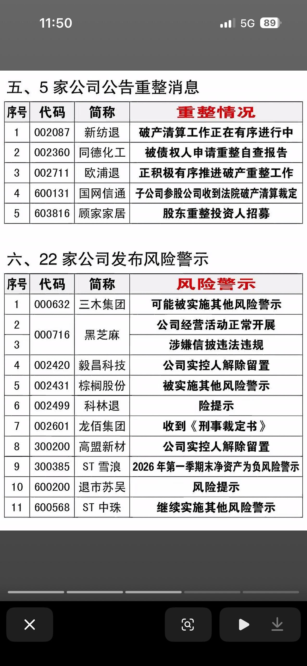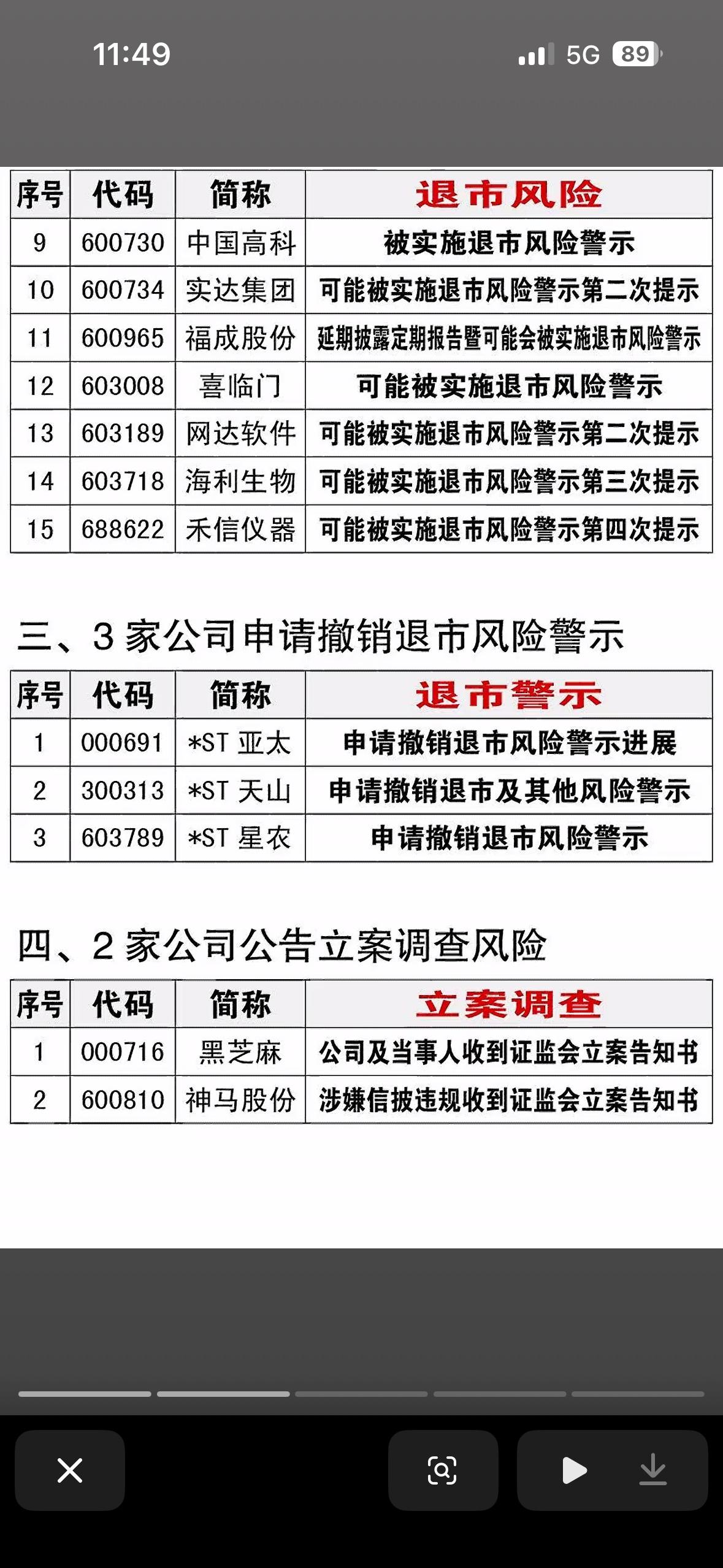 4月25日退市、立案、重整、风险提示一览表 4月25日的退市、立案、重整、风险提示一览表,就像金融市场的“警示灯”。在退市方面,有些公司因连续亏损、财务造假等问题面临摘牌,比如某公司连续三年净利润为负,被强制退市,投资者血本无归。立案的企业往往涉及违规操作,监管介入调查。重整的公司则试图通过资产重组等方式重获生机,像某企业引入战略投资者,有望起死回生。而风险提示就像是给投资者的“预防针”,提醒大家注意潜在风险。这份一览表就像一面镜子,反映出市场的风云变幻,投资真得谨慎啊!