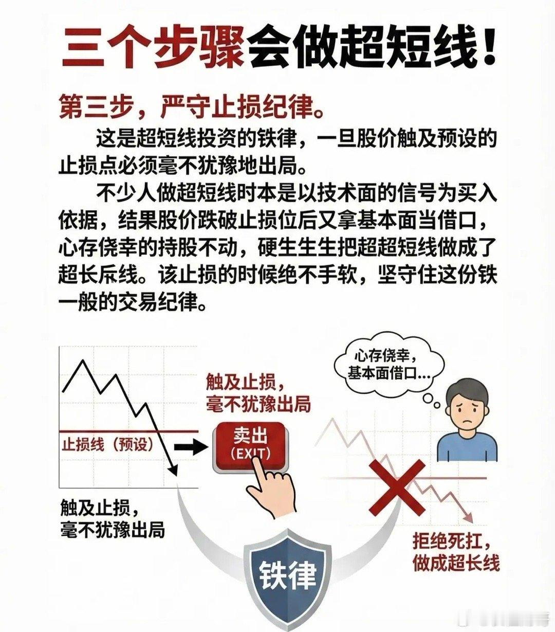 核心纪律: 这是超短线生存的生命线。一旦股价触及预设的止损位,必须毫不犹豫、果断出局。
