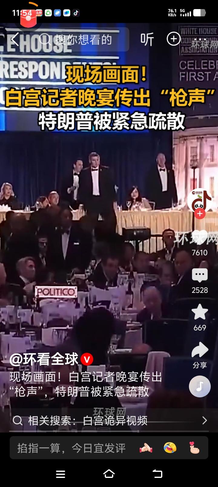 白宫枪响,总统协夫人迅速被带离! 让当地时间4月25日晚,2026年白宫记者协会晚宴在华盛顿希尔顿酒店举行,突然的至少五声枪声,让包括总统在内的所有人惊慌!总统特朗普和夫人被紧急护送撤离,副总统万斯等内阁高官及现场宾客也一同疏散,暂无伤亡报告! 枪手为30岁加州男性,在安检区被特勤局当场击毙,初步定性为“独狼行动”,未发现与恐怖组织关联。 特朗普事后建议晚宴继续,最终决定权由执法部门掌握! 看视频画面开头晚宴祥和,尤其总统夫人面带微笑,画面是近距离的,看的清清楚楚明明白白,可是大家撤离的时候,太远距离看得不是很清楚,但是两个魁梧的保镖立马挡在总统坐位前后,接下来人们只看到的是人去席空! 这样的活动竟然有抢手混进来,不可思议! 说不定以后这样突然的枪声,也许会时不时响起在这样高级别活动现场! 说到底危机与不安随时出现,一定是多行不义带来的,这是从古至今颠扑不破的真理!