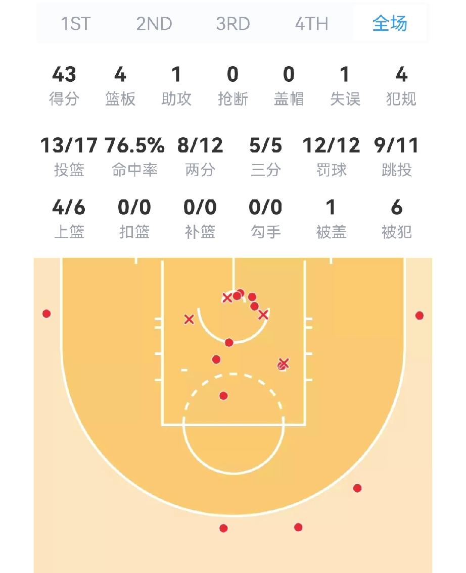 爱德华兹伤退!迪文岑佐赛季报销!森林狼“新王登基”:道苏姆力挽狂澜,攻防一体,狼队硬是被你飞,拿下G4,3-1,掘金被逼入绝境! 本以为森林狼少了两主力,今天很难了,华子被锁死,可能由于伤病。道苏姆替补出场,天赋爆发,启动是真快,掘金没一个能得上的。 全场得43分创个人新高,也是近50年NBA季后赛替补最高分!投篮17中13,命中率高达76.5%。 更厉害的是,他三分球5中5,罚球13中13,命中率都是100%。再看投篮位置(下图),篮下,中投,三分线外,左路、右路,进攻位置无死角啊! 谈到道苏姆今天的表现时,主帅芬奇说:“道苏姆真的令人难以置信。”森林狼赶紧给道苏姆下赛季加薪吧,这都打成超巨了。 目前他薪资只有285万,此前一直在公牛效力4个半赛季,本赛季代表森林狼上场24次,场均14.4分,投篮命中率52%。 道苏姆上一次参加季后赛,代表公牛出战5场,场均4分。这次在森林狼参加季后赛,上场4次,分别得到14分、9分、25分和43分!