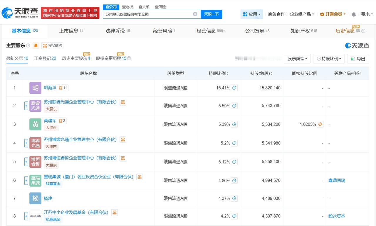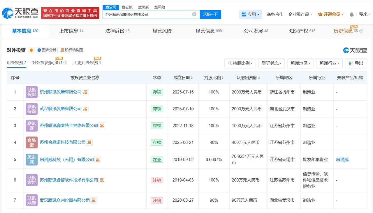 揭秘中一签赚近39万新股 联讯仪器对外投资7家企业A股新股中一签赚38.9万元 据媒体报道,今日,光芯片测试设备厂商联讯仪器正式登陆科创板,上市首日开盘价报736.92元/股,若以单签500股、81.88元/股的发行价、盘中最高价859.88元/股计算,中一签赚38.9万元。 天眼查App显示,苏州联讯仪器股份有限公司成立于2017年3月,法定代表人为胡海洋,注册资本7700万人民币,经营范围包括仪器仪表制造、光学仪器制造、通信设备制造等,由胡海洋、苏州联睿光通企业管理中心(有限合伙)、黄建军等共同持股。对外投资信息显示,该公司对外投资7家企业,其中5家处于存续状态,包括杭州联讯仪器有限公司、武汉联讯仪器有限公司、苏州联讯赛麦特半导体有限公司等。 天眼查信息: