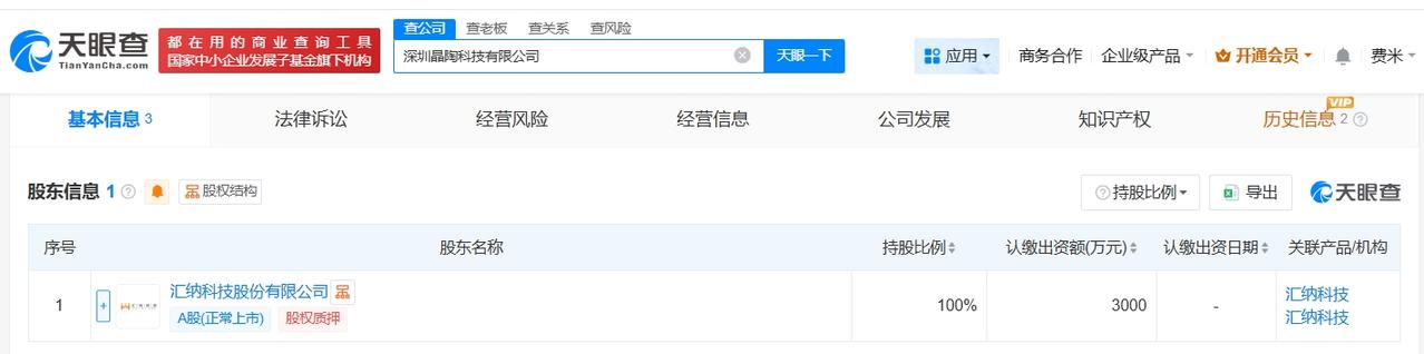 汇纳科技在深圳成立新公司 注册资本3000万 天眼查App显示,4月24日,深圳晶陶科技有限公司成立,法定代表人为苏进,注册资本3000万人民币,经营范围包括电子元器件批发、建筑陶瓷制品销售、卫生陶瓷制品销售、日用陶瓷制品销售等,由汇纳科技(300609)全资持股。 天眼查信息: