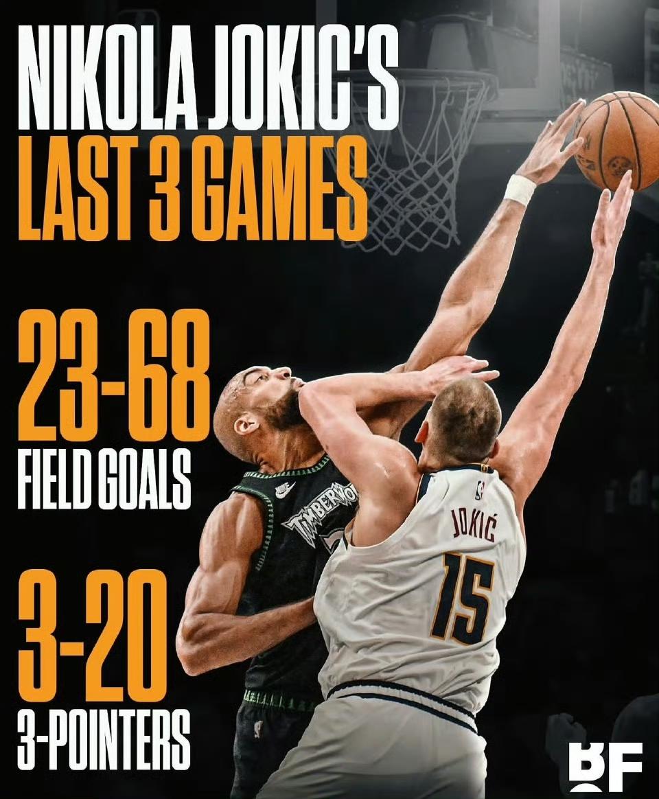 联盟第一人,被前DPOY防小学生了! 过去3场季后赛里的约基奇: 68次出手仅命中23球,命中率为33.8% 三分球20投仅3中,命中率15% nba季后赛掘金vs森林狼 G2(1-1):20次出手命中8球(命中率40%)、三分7投1中;末节7投1中,球队被逆转,正负值为-18。 - G3(1-2):26次出手仅命中7球(命中率26.9%)、三分10投2中;创下季后赛生涯最差命中率,正负值-21。 - G4(1-3):22次出手命中8球(命中率36.4%)、三分3投0中;虽摘下15个篮板并送出9次助攻,但进攻完全哑火