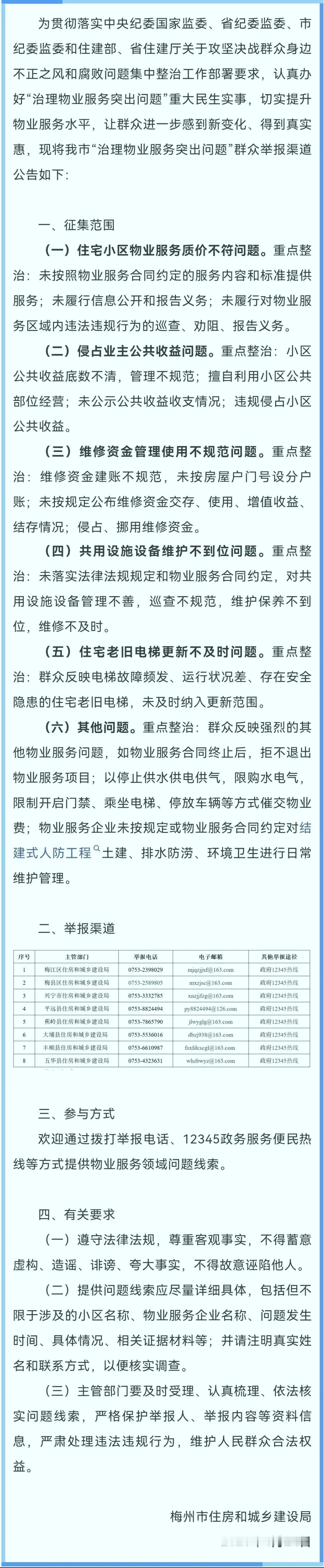 梅州住建重拳出击!整治物业服务突出问题!公开群众举报渠道 为贯彻落实上级关于整治群众身边不正之风和腐败问题的部署,切实提升物业服务水平。近日,梅州市住建设局发布公告,公开“治理物业服务突出问题”举报渠道。(具体详情如下附图) 重点整治物业服务六类问题: 1、质价不符:未按合同服务、未公开信息、未劝阻报告违规行为; 2、侵占公共收益:收益底数不清、擅自经营、未公示收支、违规侵占; 3、维修资金不规范:建账混乱、未设分户账、未公布情况、侵占挪用; 4、设施维护不到位:共用设施设备管理不善、保养维修不到位; 5、老旧电梯更新慢:故障频发、隐患突出的老旧电梯未及时更新; 6、其他问题:包括拒不撤场、“停水停电”等软暴力催费、人防工程维护缺失等。 欢迎广大群众通过举报电话或12345政务服务便民热线提供线索。 注意:举报需实事求是、信息详实(含小区、企业、时间、证据等),并注明真实姓名及联系方式。主管部门将举报人员信息严格保密,依法核实处理。 来源:梅州住建 春日生活打卡季 梅州大件事