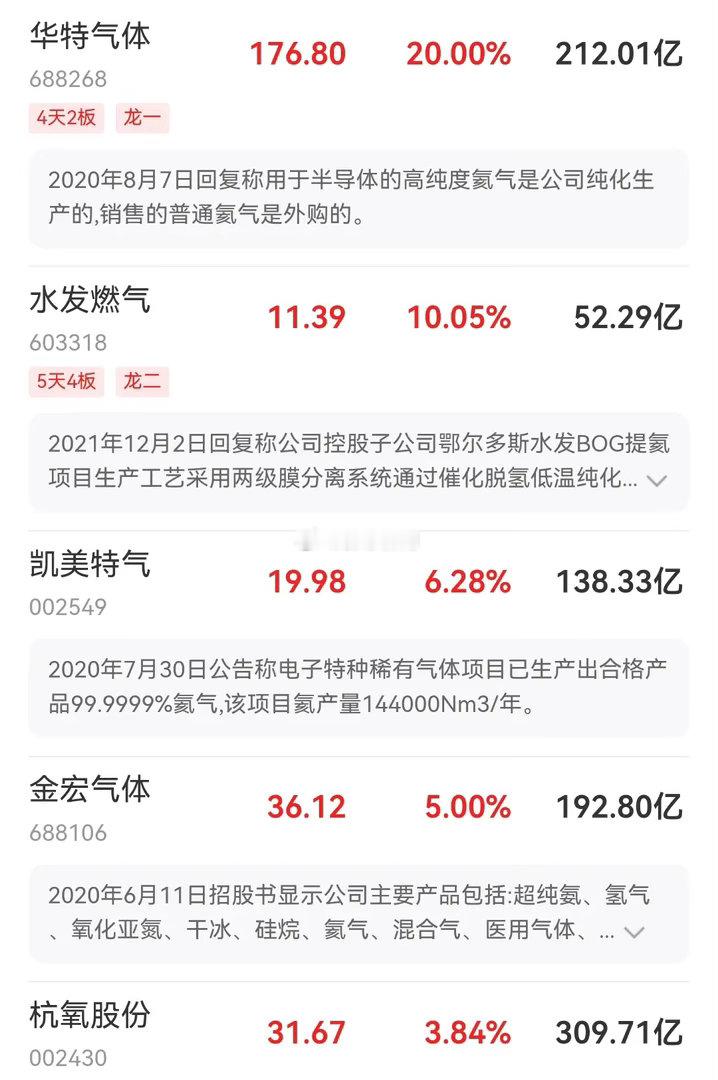 3.近一月广东地区高纯氦气价格涨超300%,工业气体概念逆势活跃 4月22日广东地区高纯氦气(40L)现货价格报2450元/瓶,较上一日上涨350元/瓶,当日涨幅为16.67%。最近一周,广东地区高纯氦气(40L)价格累计上涨1475元/瓶,上涨幅度为151.28%;最近一个月,广东地区高纯氦气(40L)价格累计上涨1885元/瓶,上涨幅度为333.63%。(氦气概念3.65%)华特气体20.00%