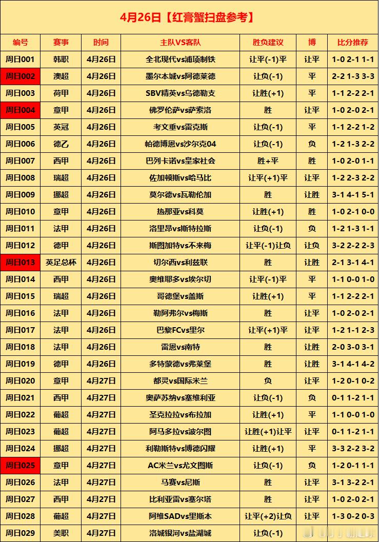 周日001 韩职 全北现代vs浦项制铁 让平(-1)平 让平 1-0 2-1 1-1周日002 澳超 墨尔本城vs阿德莱德 让负(-1) 平 2-2 1-3 3-3周日003 荷甲 SBV精英vs乌德勒支 让胜(+1) 平 1-1 2-2 2-1周日004 意甲 佛罗伦萨vs萨索洛 胜 让平 1-0 2-0 2-1周日005 英冠 考文垂vs雷克斯 让负(-1) 平 1-1 2-2 1-2周日006 德乙 帕德博恩vs沙尔克04 让负(-1) 负 1-2 1-3 2-2周日007 西甲 巴列卡诺vs皇家社会 胜+平 胜 1-0 2-0 1-1周日008 瑞超 佐加顿斯vs哈马比 让平(+1)平 让平 1-2 2-3 2-2周日009 挪超 莫尔德vs瓦勒伦加 胜 让胜 3-1 4-1 5-1周日010 意甲 热那亚vs科莫 让胜(+1) 胜 1-0 2-1 0-0周日011 法甲 洛里昂vs斯特拉斯 让负(-1) 负 1-2 1-3 1-1周日012 德甲 斯图加特vs不来梅 让平(-1)让负 让负 3-2 2-2 2-3周日013 英足总杯 切尔西vs利兹联 胜 让胜 2-1 3-1 4-1周日014 西甲 奥维耶多vs埃尔切 让平(-1)平 平 1-1 0-0 1-0周日015 瑞超 哥德堡vs盖斯 让胜(+1) 平 1-1 2-2 2-1周日016 法甲 勒阿弗尔vs梅斯 胜 让平 1-0 2-0 2-1周日017 法甲 巴黎FCvs里尔 让平(+1)平 让平 1-2 1-1 2-3周日018 法甲 雷恩vs南特 胜 让胜 2-0 3-0 3-1周日019 德甲 多特蒙德vs弗莱堡 胜 让胜 3-1 4-1 4-2周日020 意甲 都灵vs国际米兰 负 让平 1-2 0-1 0-2周日021 西甲 奥萨苏纳vs塞维利亚 让负(-1) 负 0-1 1-2 1-1周日022 葡超 圣克拉拉vs布拉加 让胜(+1) 平 1-1 0-0 1-0周日023 葡超 阿马多拉vs波尔图 让胜(+1)让平 让平 0-1 1-2 1-1周日024 挪超 利勒斯特vs博德闪耀 让胜(+1) 平 3-3 2-2 3-2周日025 意甲 AC米兰vs尤文图斯 让负(-1) 负 1-2 0-1 1-1周日026 法甲 马赛vs尼斯 胜 让平 3-1 3-2 2-1周日027 西甲 比利亚雷vs塞尔塔 胜 让平 1-0 2-0 2-1周日028 葡超 阿维SADvs里斯本 让平(+2)让负 让平 1-3 0-2 0-3周日029 美职 洛城银河vs盐湖城 让负(-1) 平 2-2 2-4 2-3