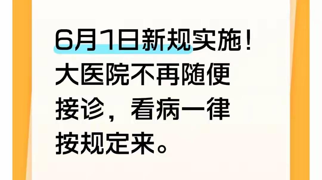 6月1日新规实施!大医院不再随便接诊,看病一律按规定来6月1日新规落地!大医院接诊规则大改,看病从此有了新规矩 家人们注意!6月1日起,全国大医院接诊将迎来全新调整,不再是“想进就能进”,而是严格按规定执行!这条关乎千万人看病权益的新规,藏着太多和你息息相关的细节,赶紧往下看! 一直以来,不少人都有过这样的经历:半夜突发不适,直奔大医院却被告知“不接诊普通病”;感冒发烧这种小毛病,挤破头挂大医院的号,等半天还不如社区医院方便。而从6月1日开始,这种“看病难、看病乱”的情况,将彻底成为过去式! 根据新规要求,大医院将明确划分接诊范围:急危重症、疑难杂症、罕见病是接诊核心,普通常见病、慢性病复诊,优先引导至社区卫生服务中心、乡镇卫生院等基层医疗机构。同时,大医院将全面推行“分级诊疗+预约接诊”制度,没有提前预约、不符合接诊条件的患者,将无法直接进入门诊就诊。 可能有人会问:大医院这么做,是不是把普通患者拒之门外了?其实恰恰相反!这是为了让医疗资源实现“精准匹配”。大医院的专家、设备本就稀缺,把有限的资源留给最需要的重症患者,既能让疑难病患者得到更专业的救治,也能让基层医疗机构的常见病诊疗能力得到提升,咱们老百姓看病,再也不用“小病跑大医院、大病等不到号”。 新规还明确了大医院的接诊底线:对于符合条件的急危重症患者,无论是否预约,必须第一时间接诊,绝不允许以任何理由推诿;对于转诊至基层的常见病患者,大医院将提供“全程医疗指导”,避免患者“断档就医”。此外,医保报销比例也将向基层医疗机构倾斜,在社区医院看病,报销比例比大医院高不少,既能少花钱,又能少跑腿。 从表面看,这是大医院接诊规则的调整,背后却是医疗资源优化配置的民生升级。咱们老百姓看病,终于告别了“盲目扎堆大医院”的乱象,迎来了“小病在基层、大病去大医院”的科学就医模式。 新规落地后,你会选择先去社区医院看常见病吗?对于大医院的接诊新规则,你还有哪些疑问?欢迎在评论区留言讨论,说说你的看法!