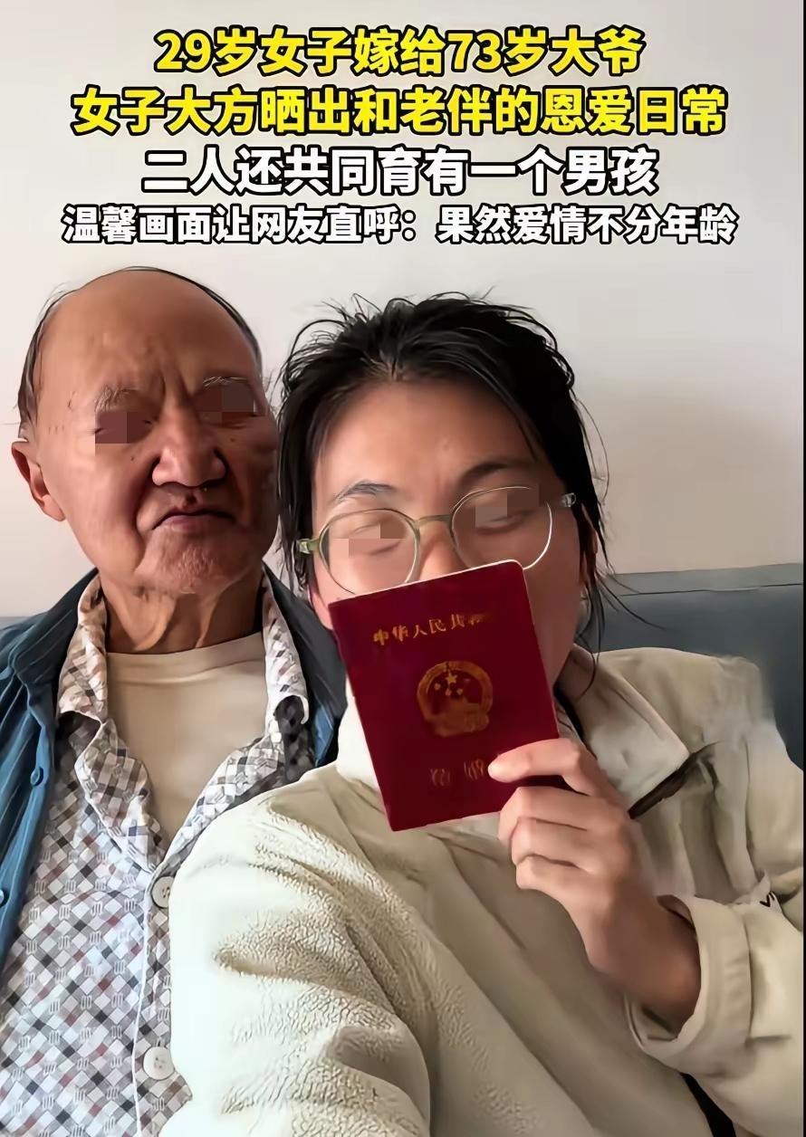 相差44岁的婚姻火了 29岁姑娘嫁73岁大爷 晒结婚证官宣:爱情真的不分年龄 “我96年,他52年,差了整整44岁,可我们的结婚证是真的,日子也是甜的。” 最近,一对特殊的夫妻在网上刷屏了。镜头里,73岁的大爷握着29岁妻子的手,两人对着镜头笑得一脸满足;另一张照片里,姑娘举着红本本,眼神里全是藏不住的幸福。视频里说,他们不仅领了证,还一起迎来了一个小男孩,一家三口的日常温馨又戳人。 有人说“姑娘是不是图什么”,也有人说“大爷晚年有人照顾挺好”,他们看向彼此的眼神里,藏着最直白的温柔。 爱情从来都没有标准答案。就像这对夫妻,隔着半个世纪的时光,依然能在彼此的眼睛里,找到属于自己的光。 你怎么看? 四五十岁的爱情 七旬老人恋爱