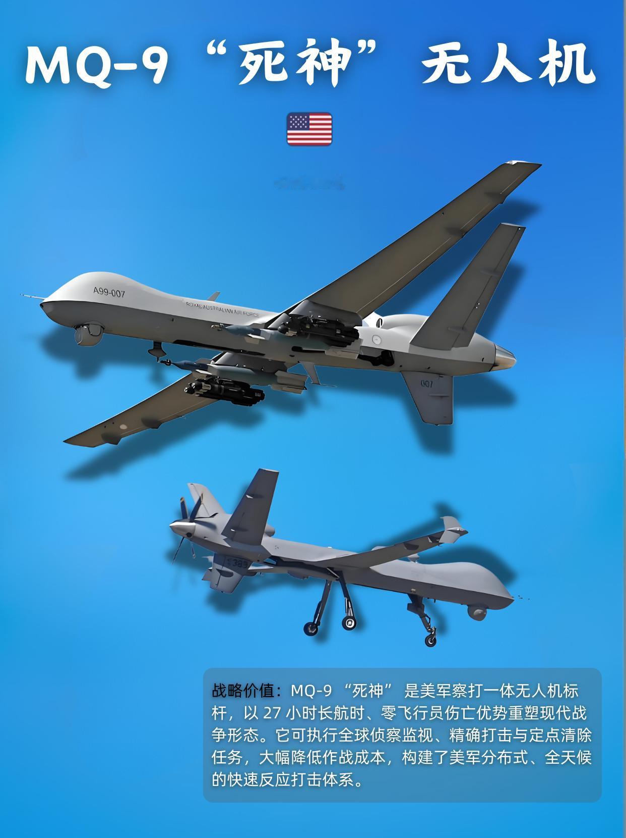 被吹上天的 MQ-9,真的是无敌空中杀手吗? MQ-9 死神,是美军主力察打一体无人机标杆。 1、该机采用增强型复合材料机身,翼展 20 米,可挂载地狱火导弹、宝石路激光制导炸弹,最大起飞重量 4760 千克,火力配置灵活多样。 2、它巡航速度 370 公里 / 小时,续航超 27 小时,配备卫星指挥链路与光电红外传感器,可实现远程精准打击与长时间战场监视。 实战表现亮眼,但低速低空导致生存能力不足。